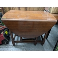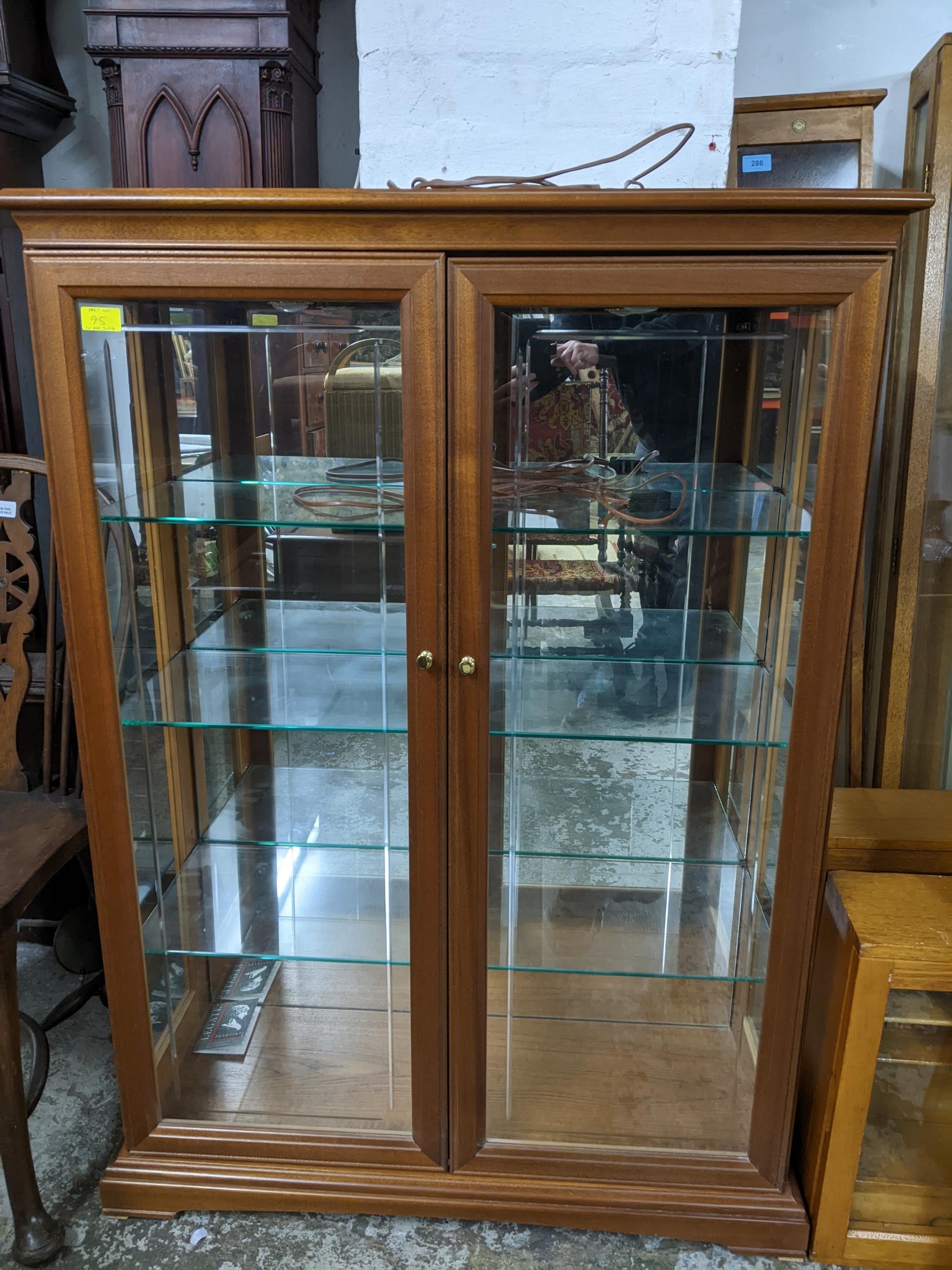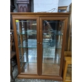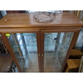 An early 20th century gateleg D-end table on turned legs united by square stretched 74 x 92 x 49 (when extended), 129 extended square stretchers, along with a modern mahogany display cabinet twin glazed doors with internal adjustable glass shelves, on bracket feet, wired for electricity 119.5x86.5x33.5cms