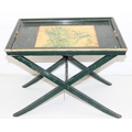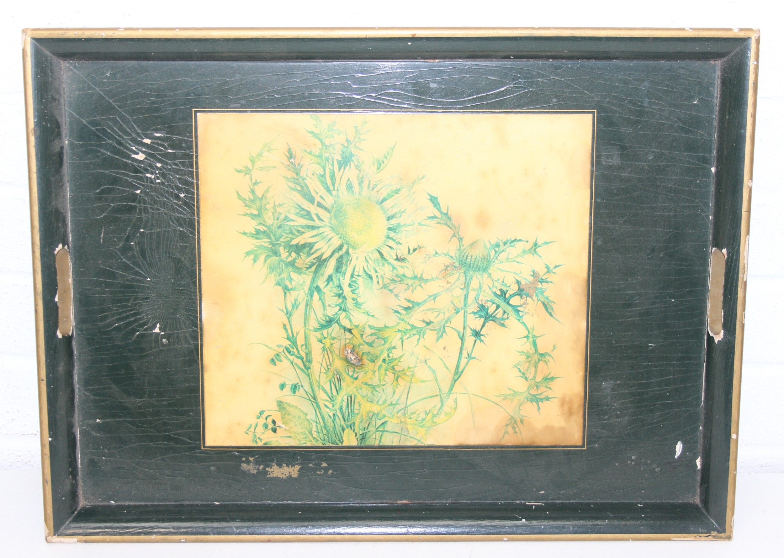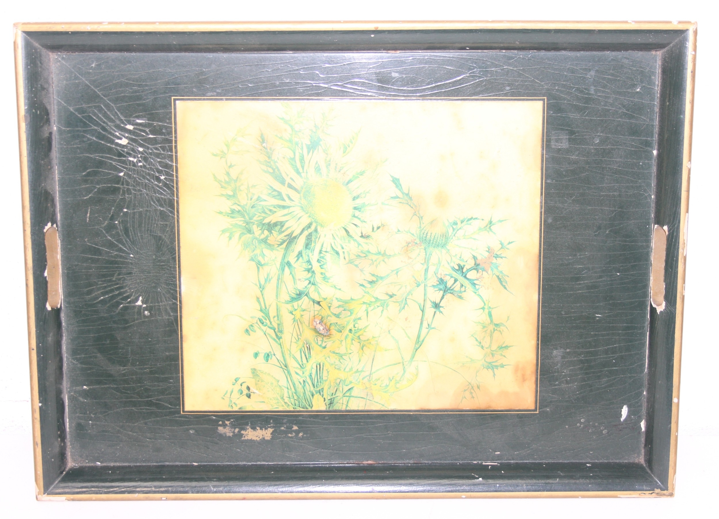 A vintage wooden butlers' tray on stand with thistle decoration, 56cm x 40cm x 45cm