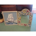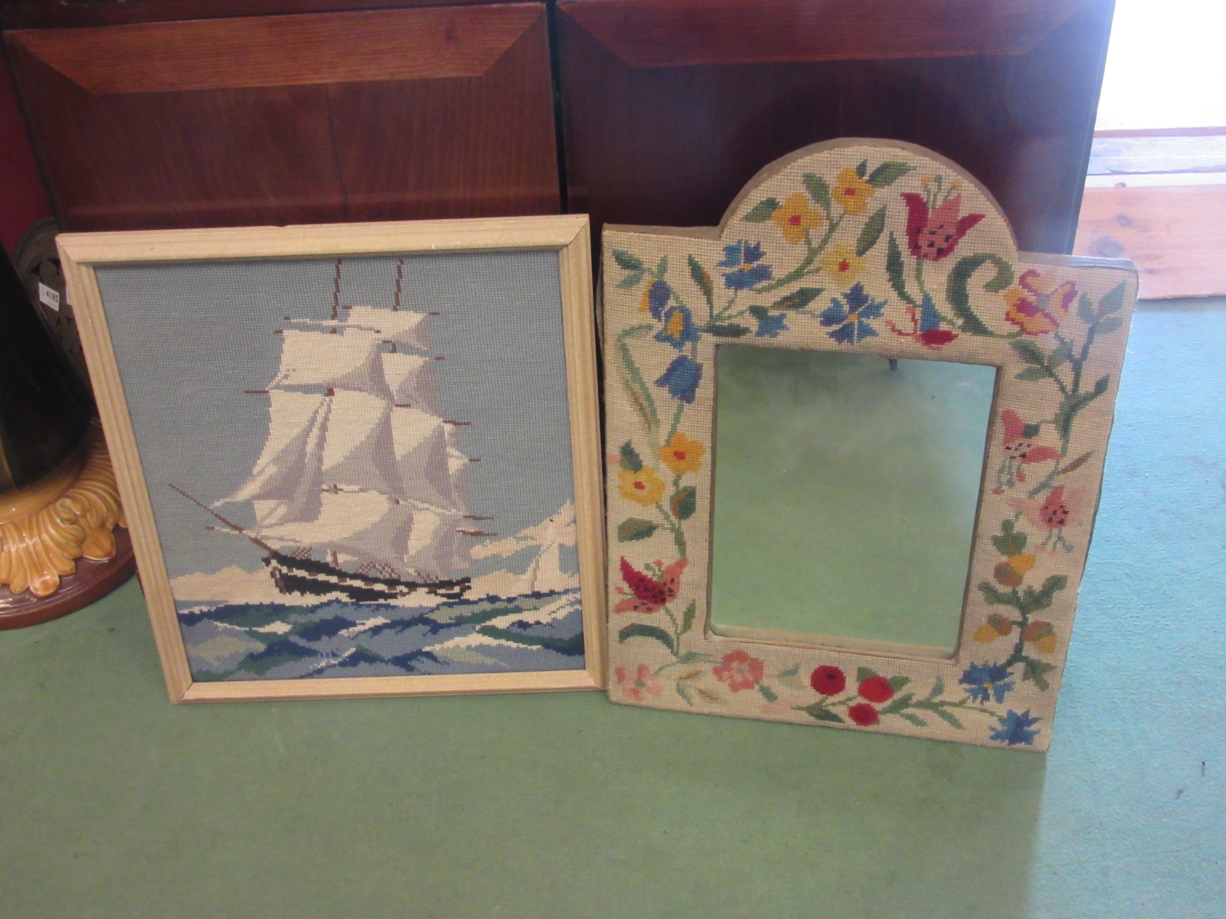 A wall mirror with floral embroidered frame, 57cm x 41cm, together with tapestry of a ship, framed, 44cm x 38cm image size