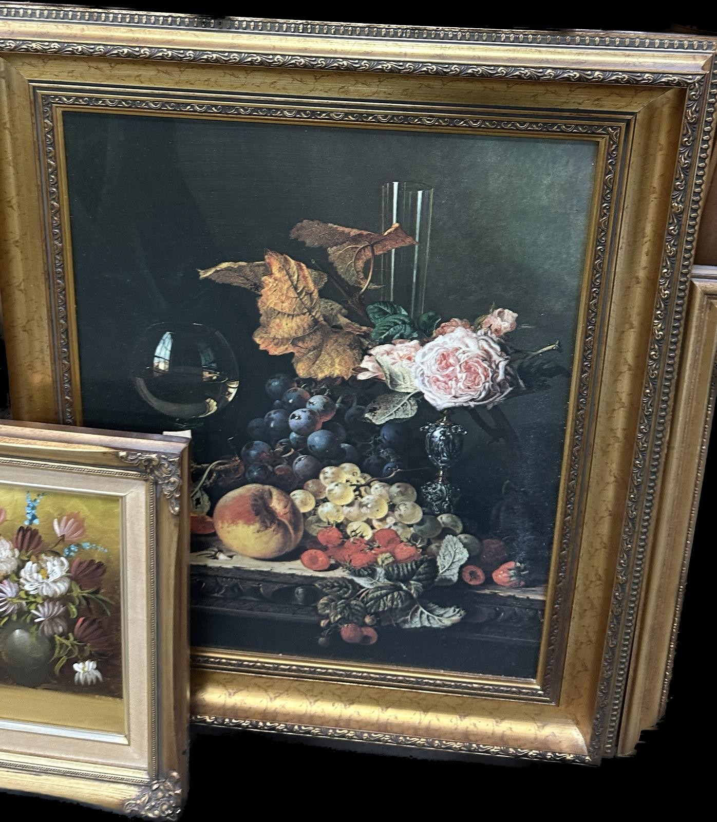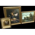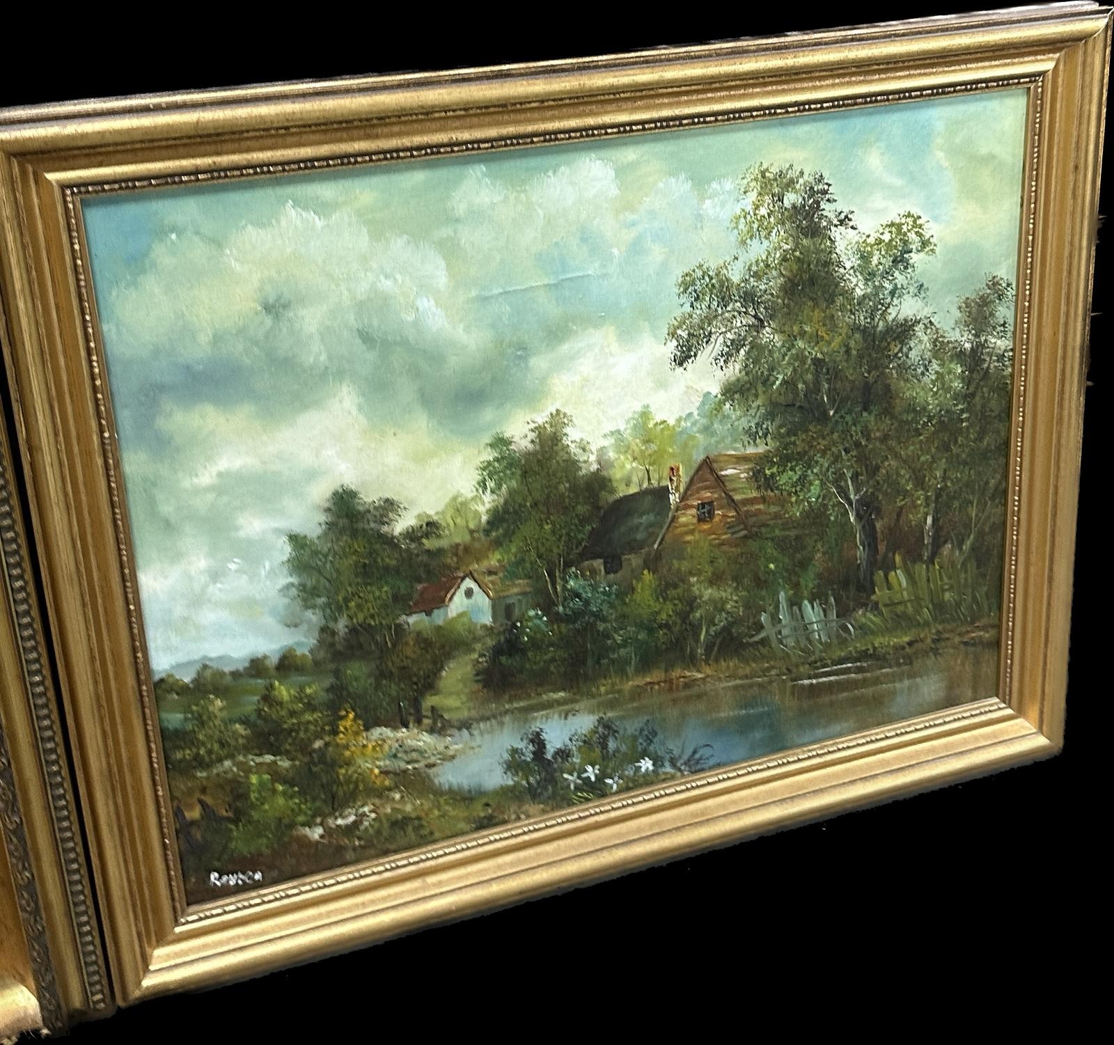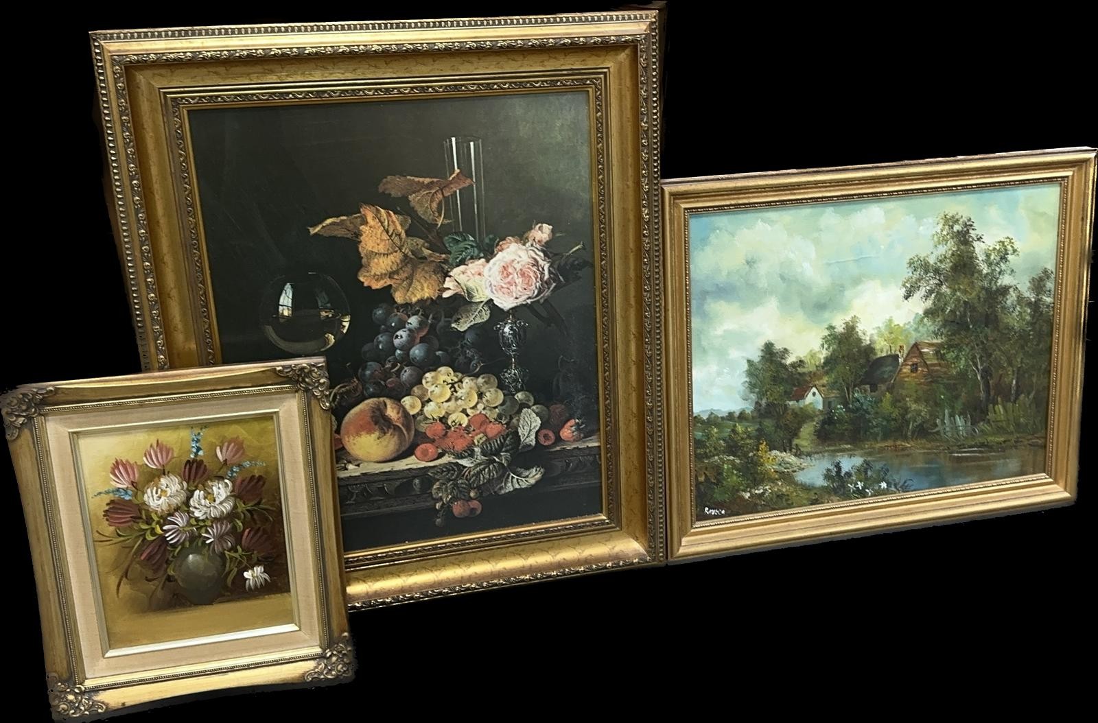 Three gilt framed paintings two oil on boards, largest measures approximately 27 inches tall x 22.5 wide
