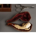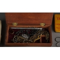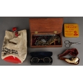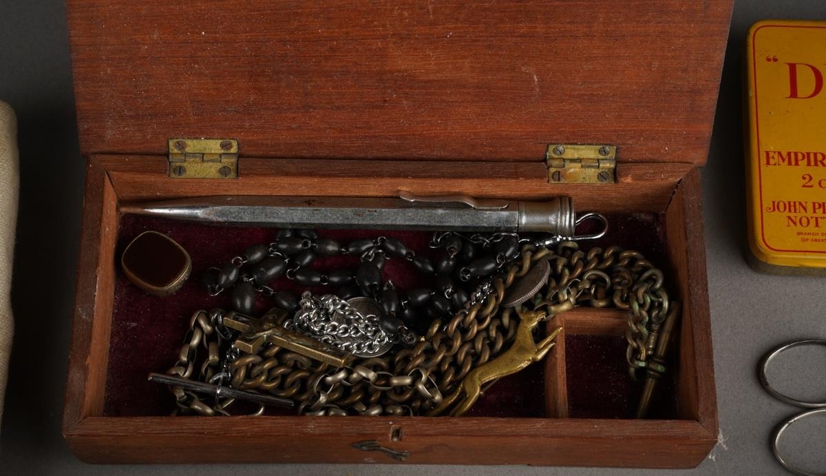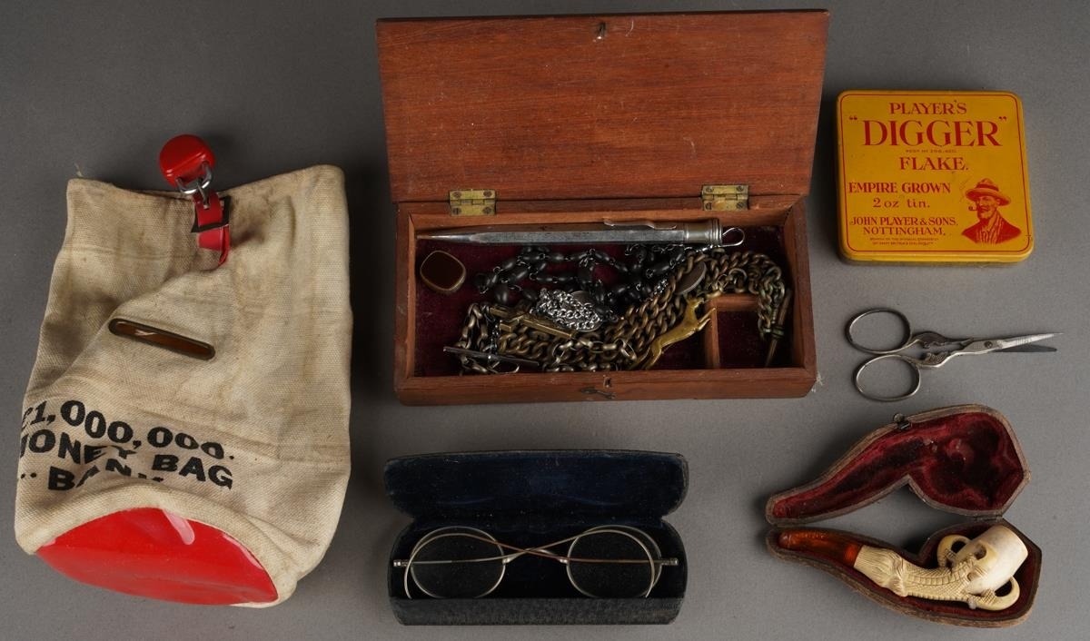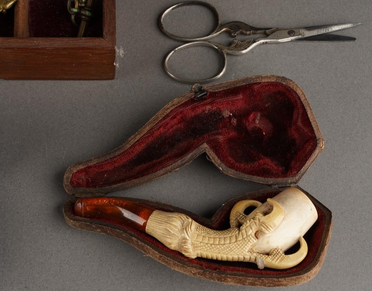 Collector's lot including cased carved pipe with birds talon detail and amber spout together with cased spectacles, assorted metal chains and rosary beads etc [1 bag]