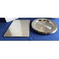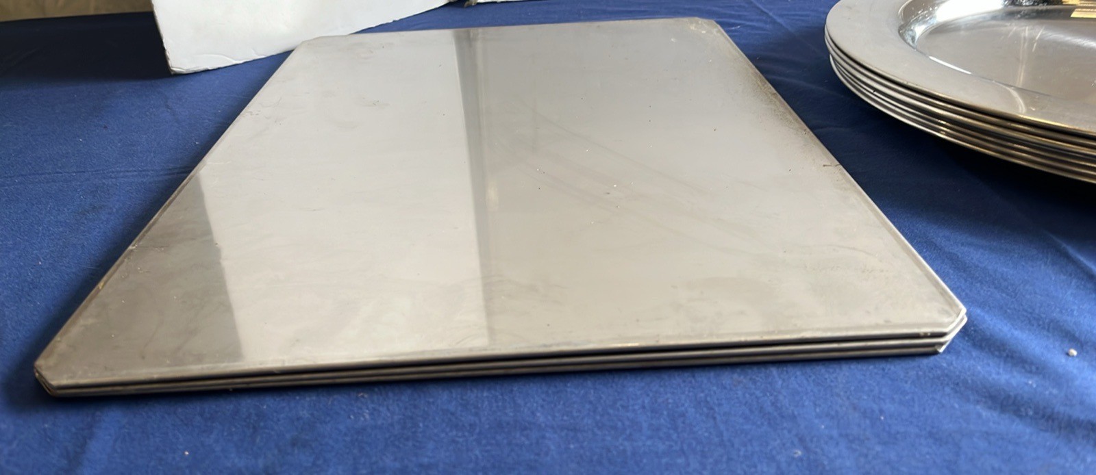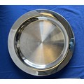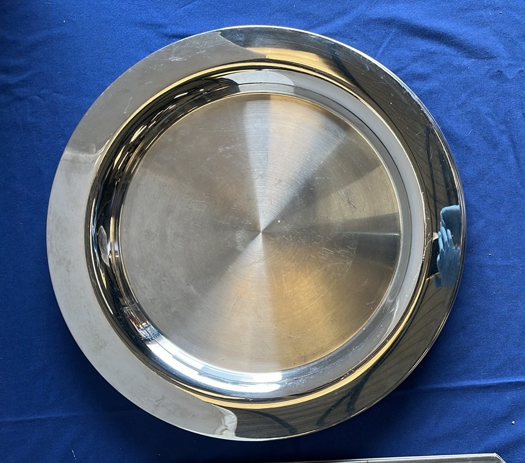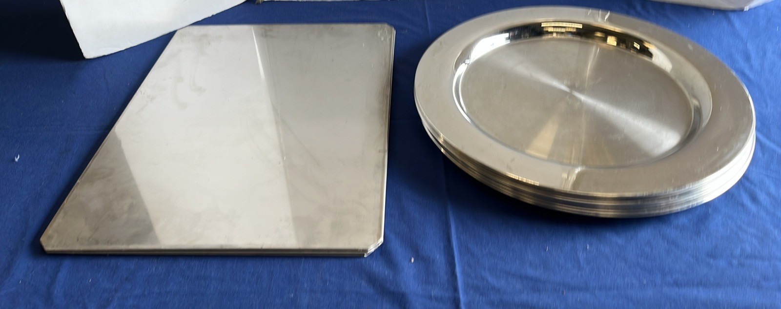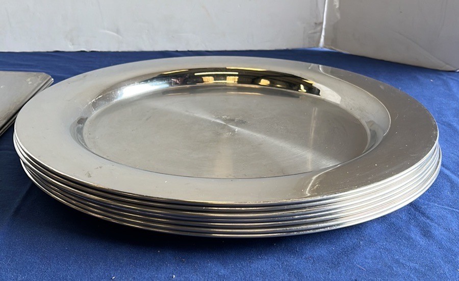 7 X LARGE ROUND METAL TABLE CHARGERS AND 3 X TRAYS