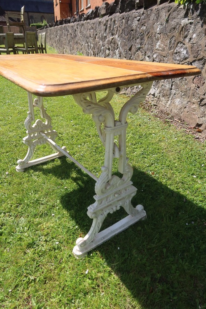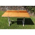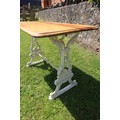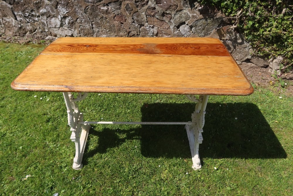 A rectangular topped pub table raised on a plated wrought iron base