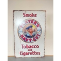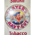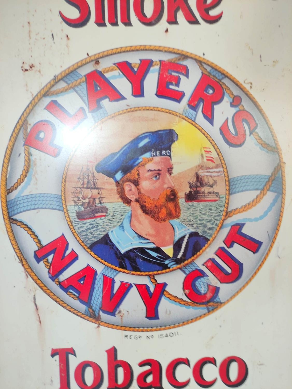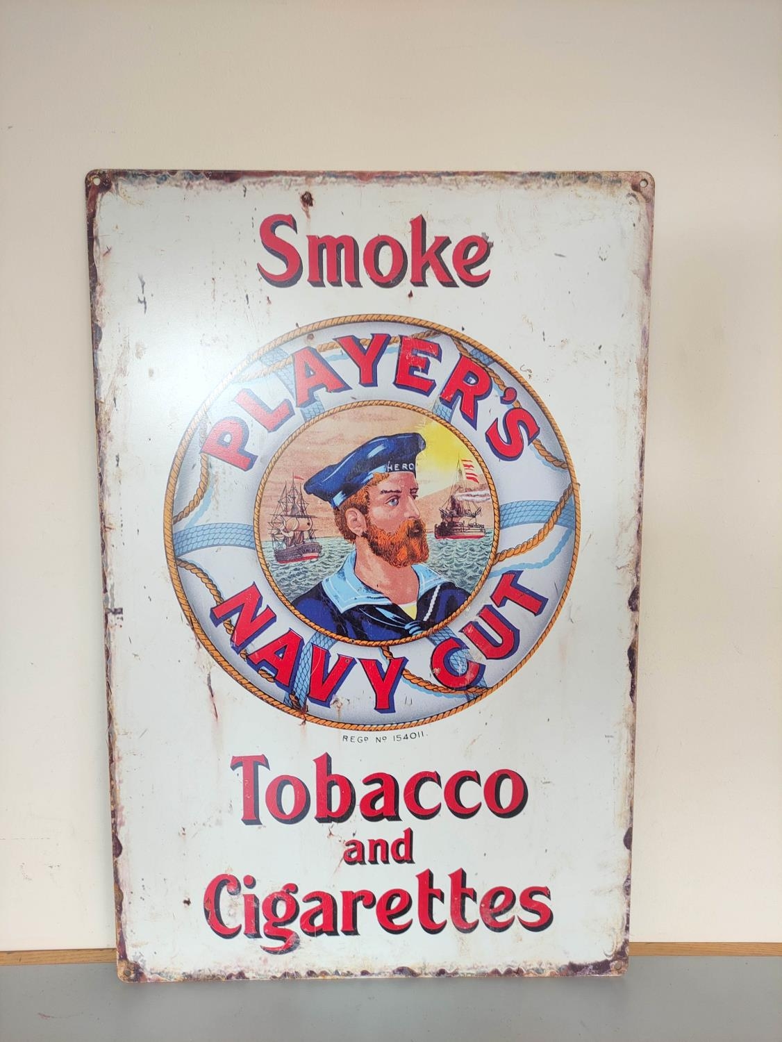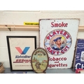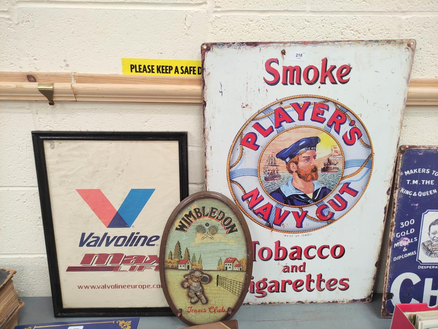Three vintage advertisement signs to include a large reproduction Player's Navy Cut Cigarettes sign 76cm x 50cm, a Valvoline framed poster, & a wooden Wimbledon sign (3)