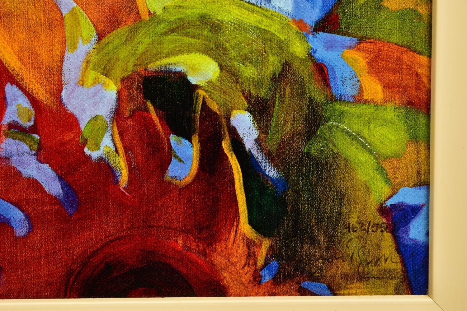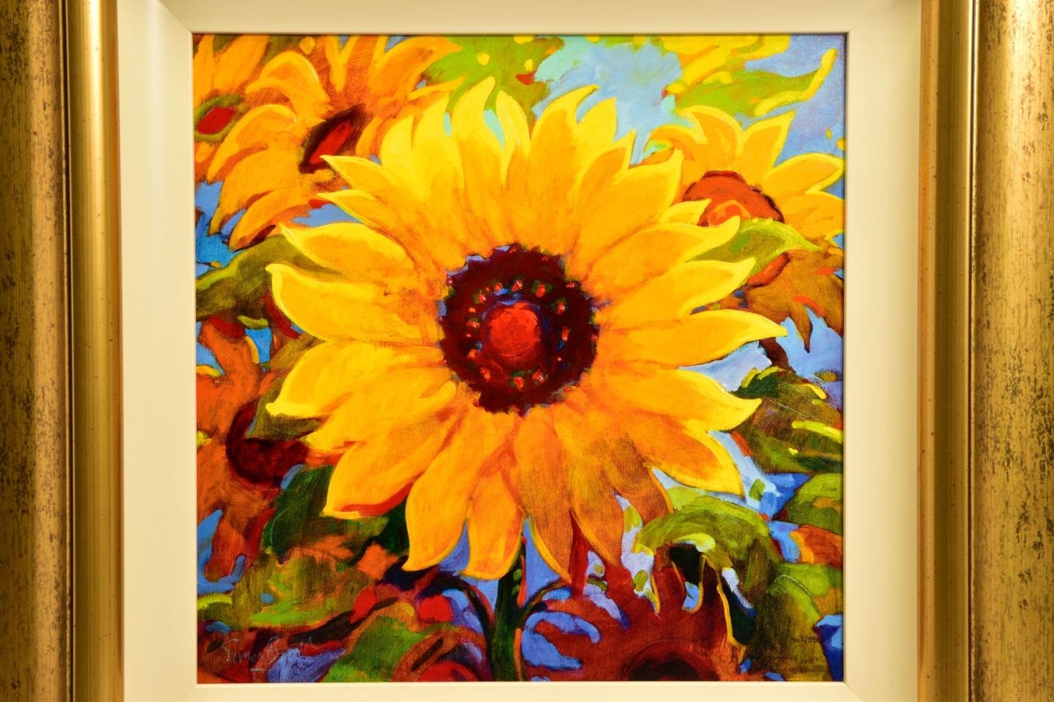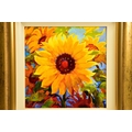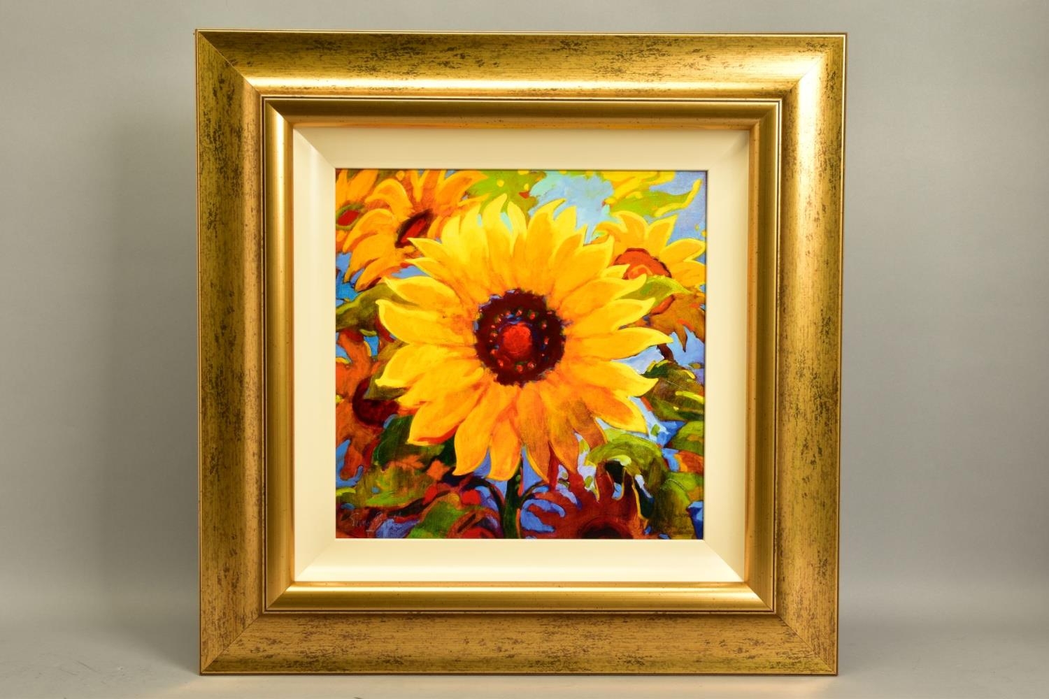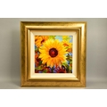SIMON BULL (BRITISH 1958) 'SPELLBOUND', a signed limited edition print of sunflowers, 462/550 no certificate, approximate sizes: image 37cm x 37cm frame 64cm x 64cm, (Condition report: small chips to corner edges of the frame) (artist resale rights apply)