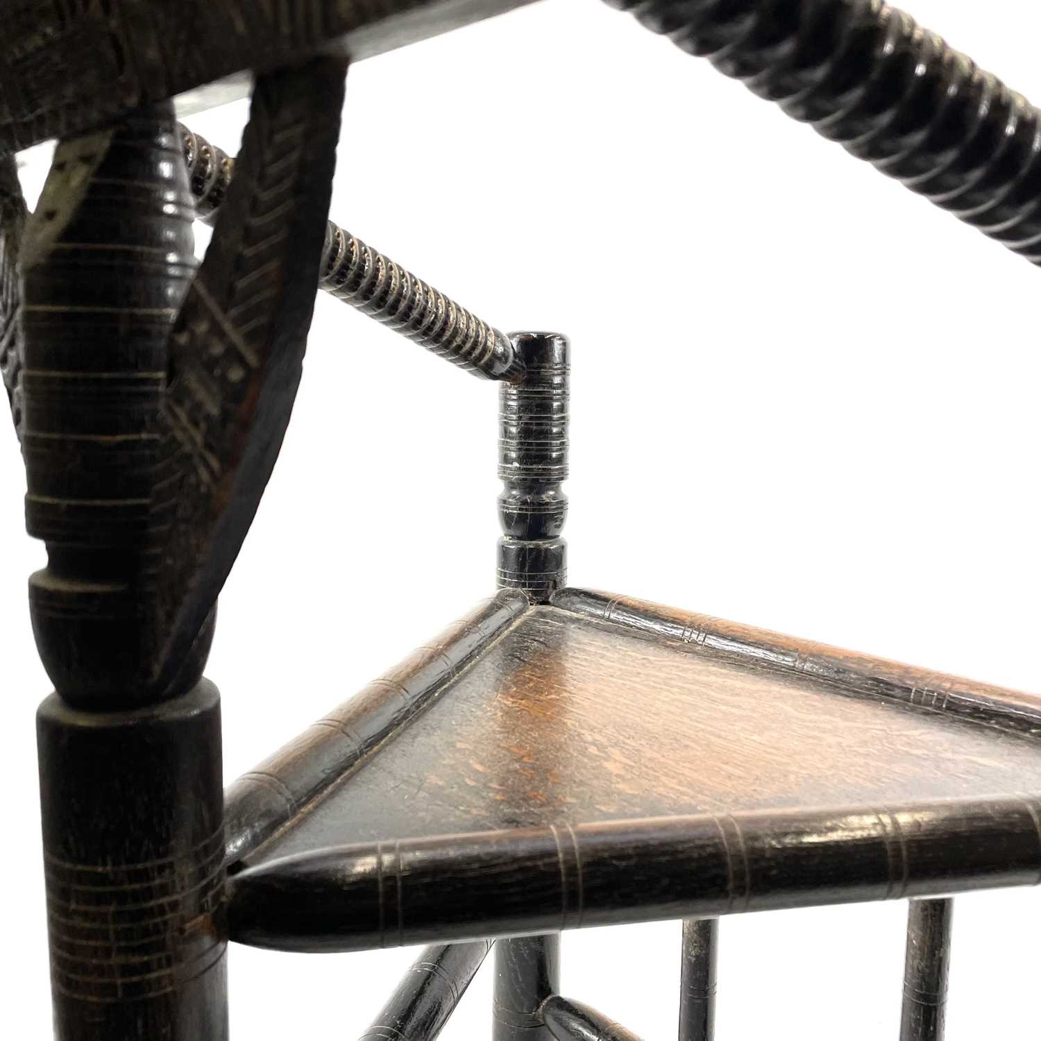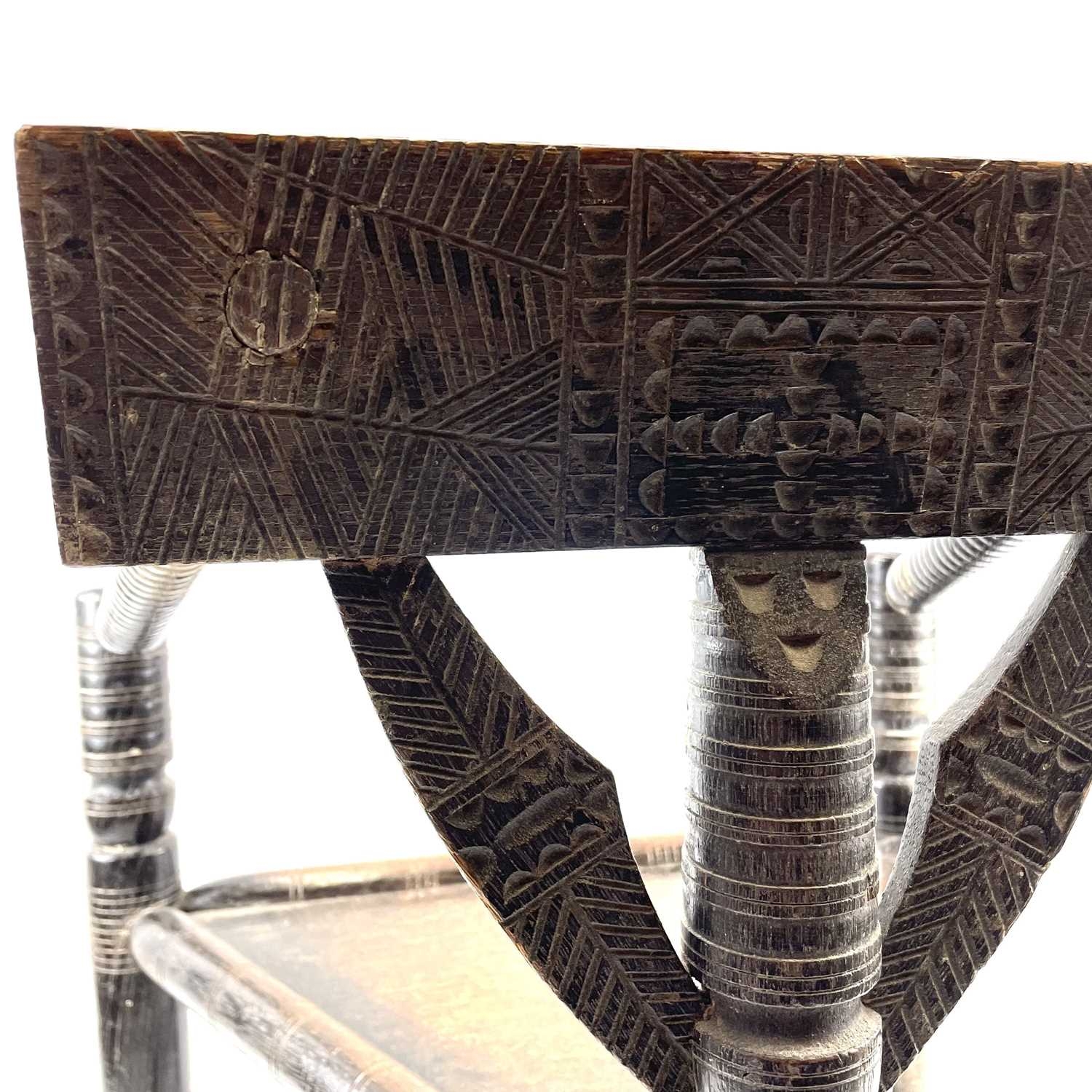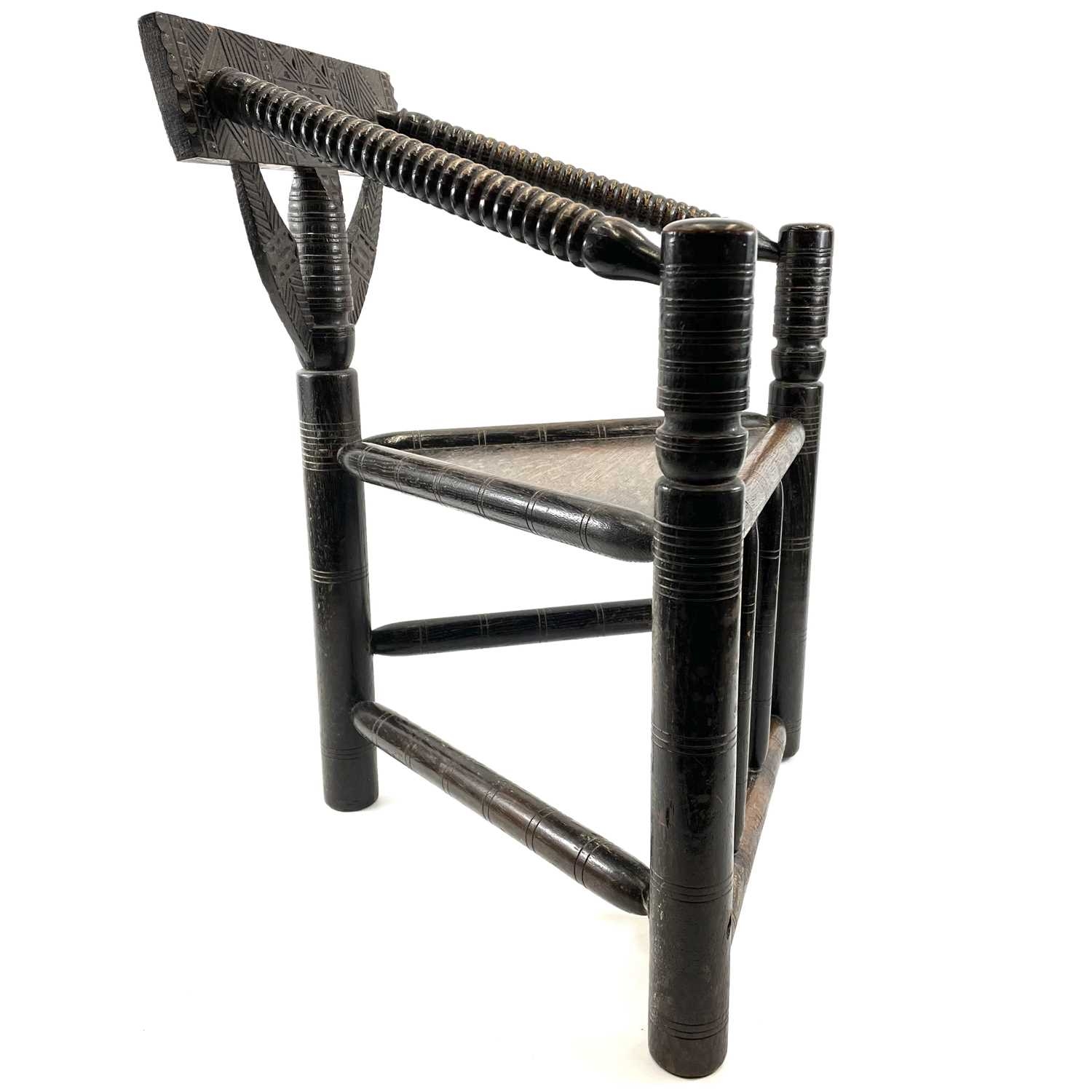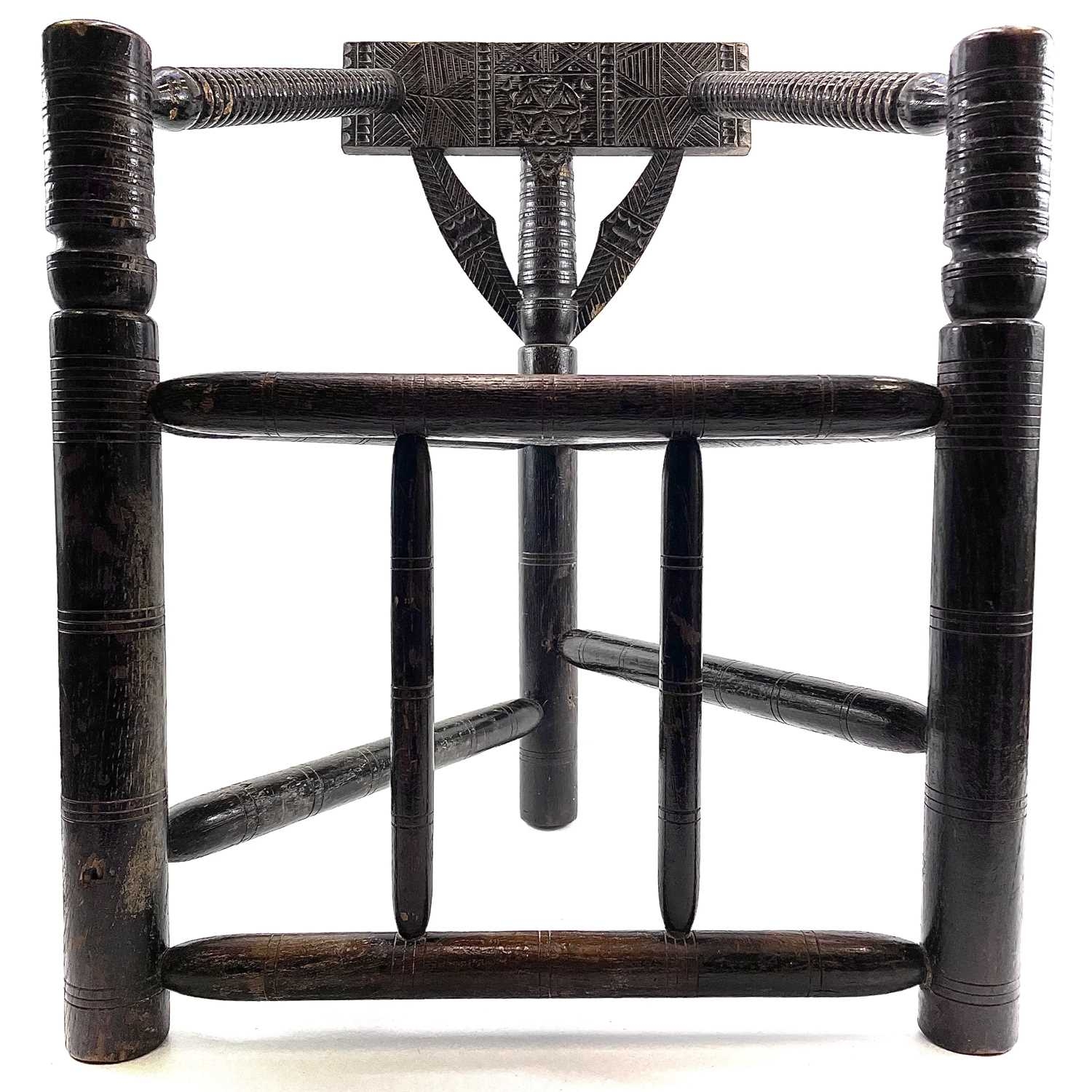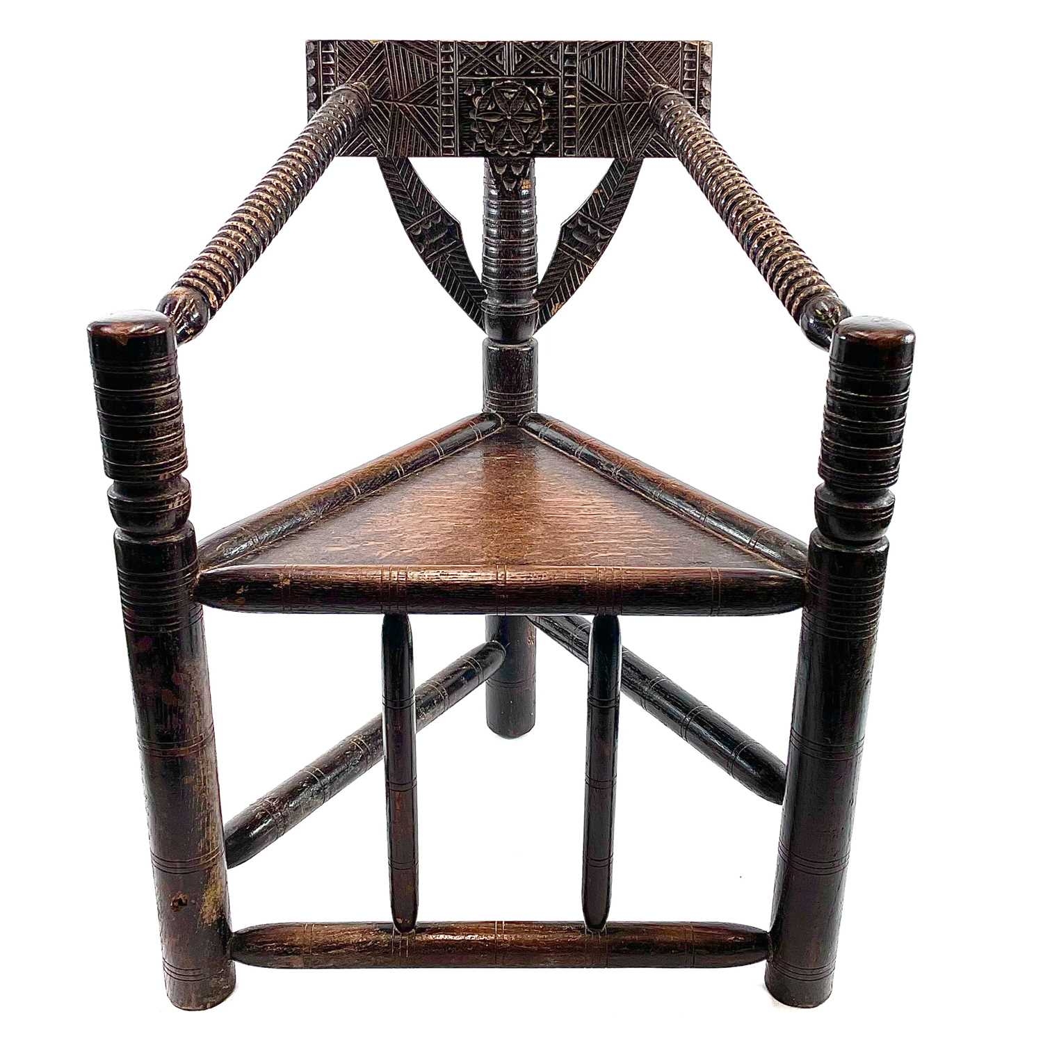 A Child's oak turner's chair. Circa 1800, with triangular seat and turned and chip carved decoration, height 58.5cm, total width 45cm.