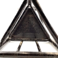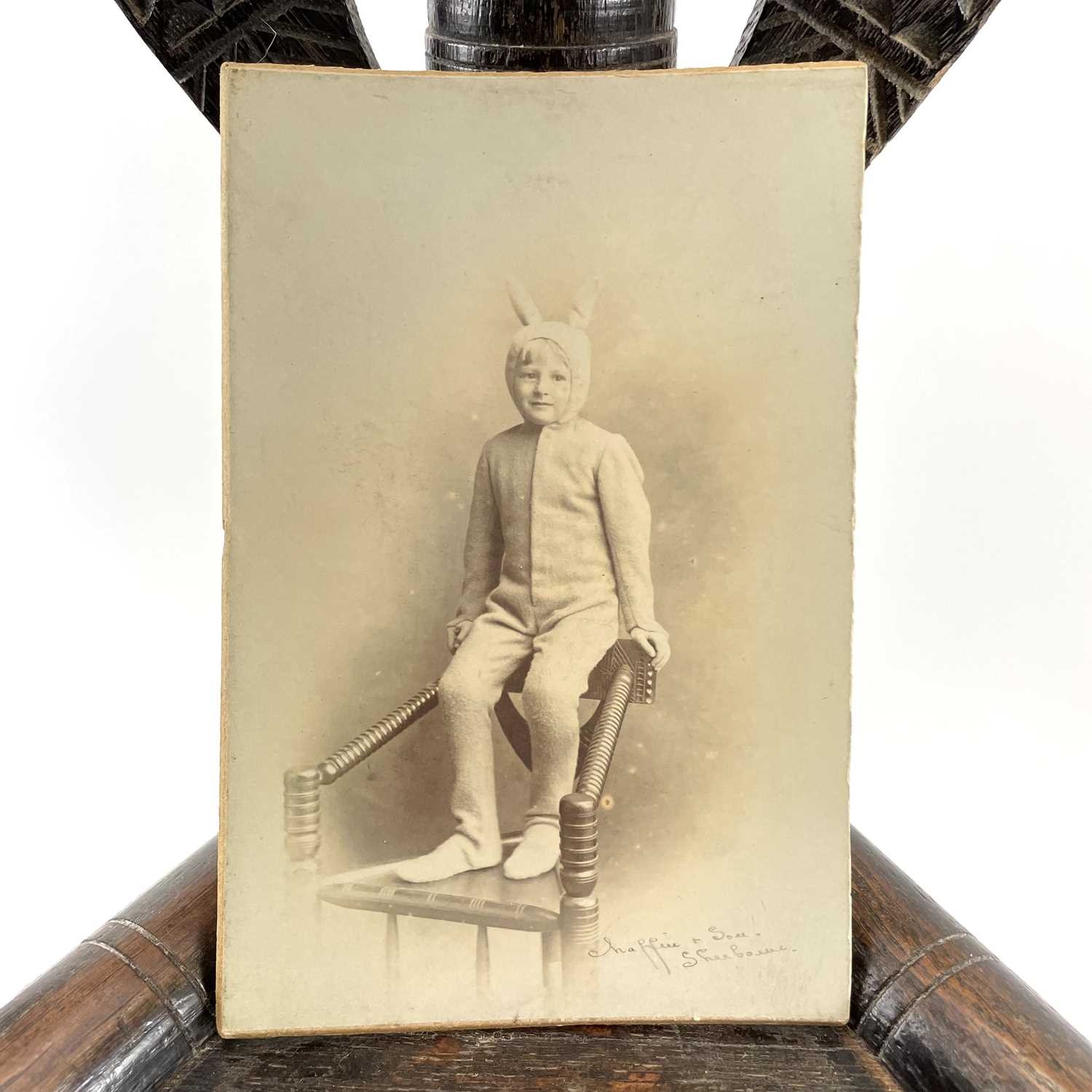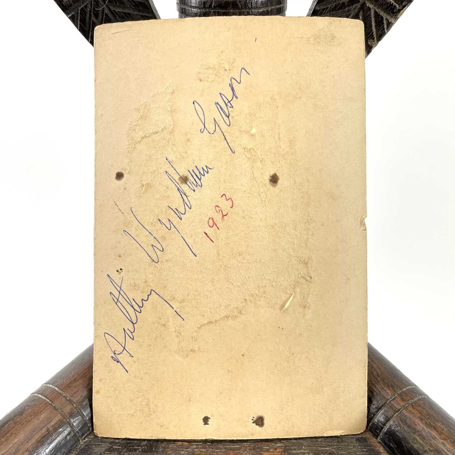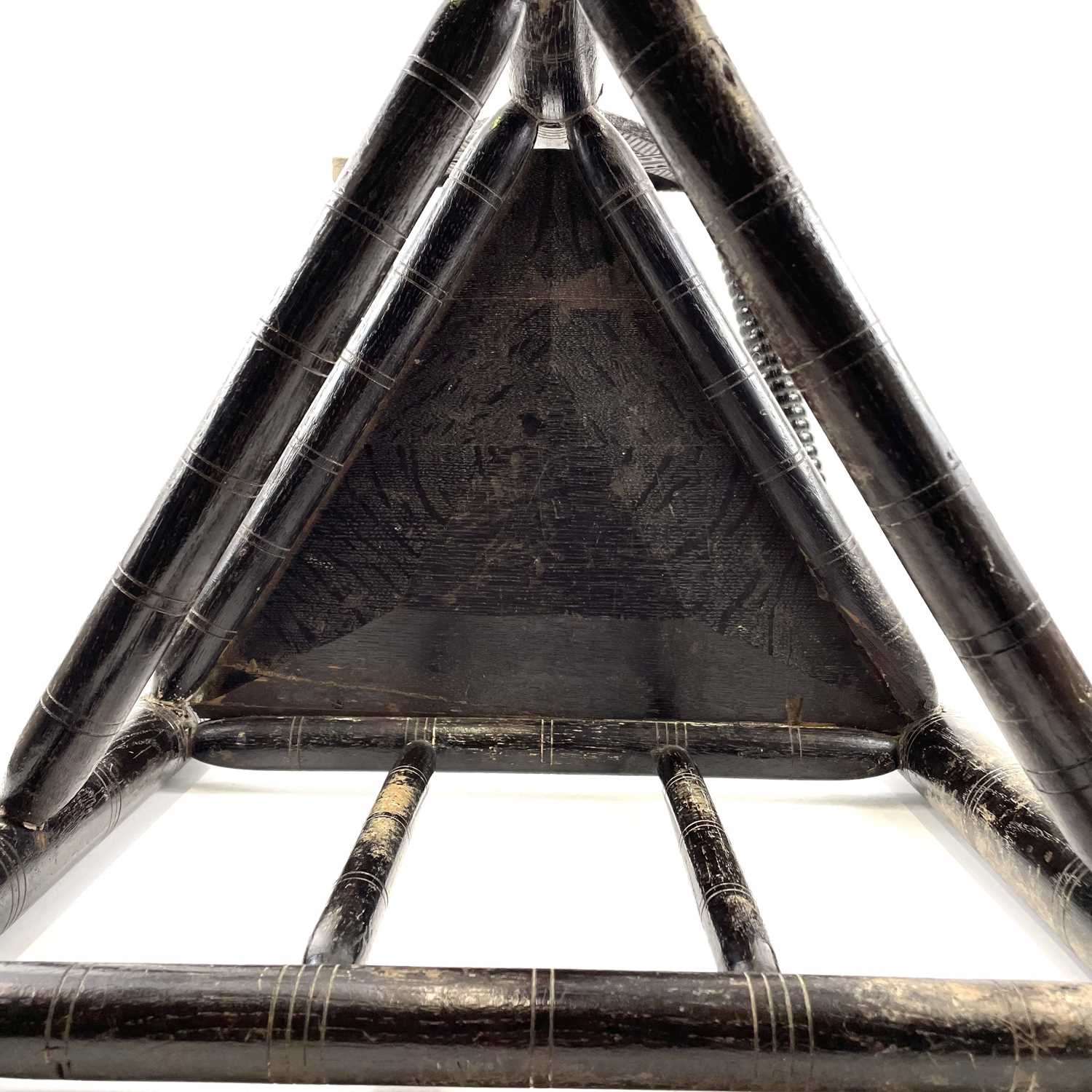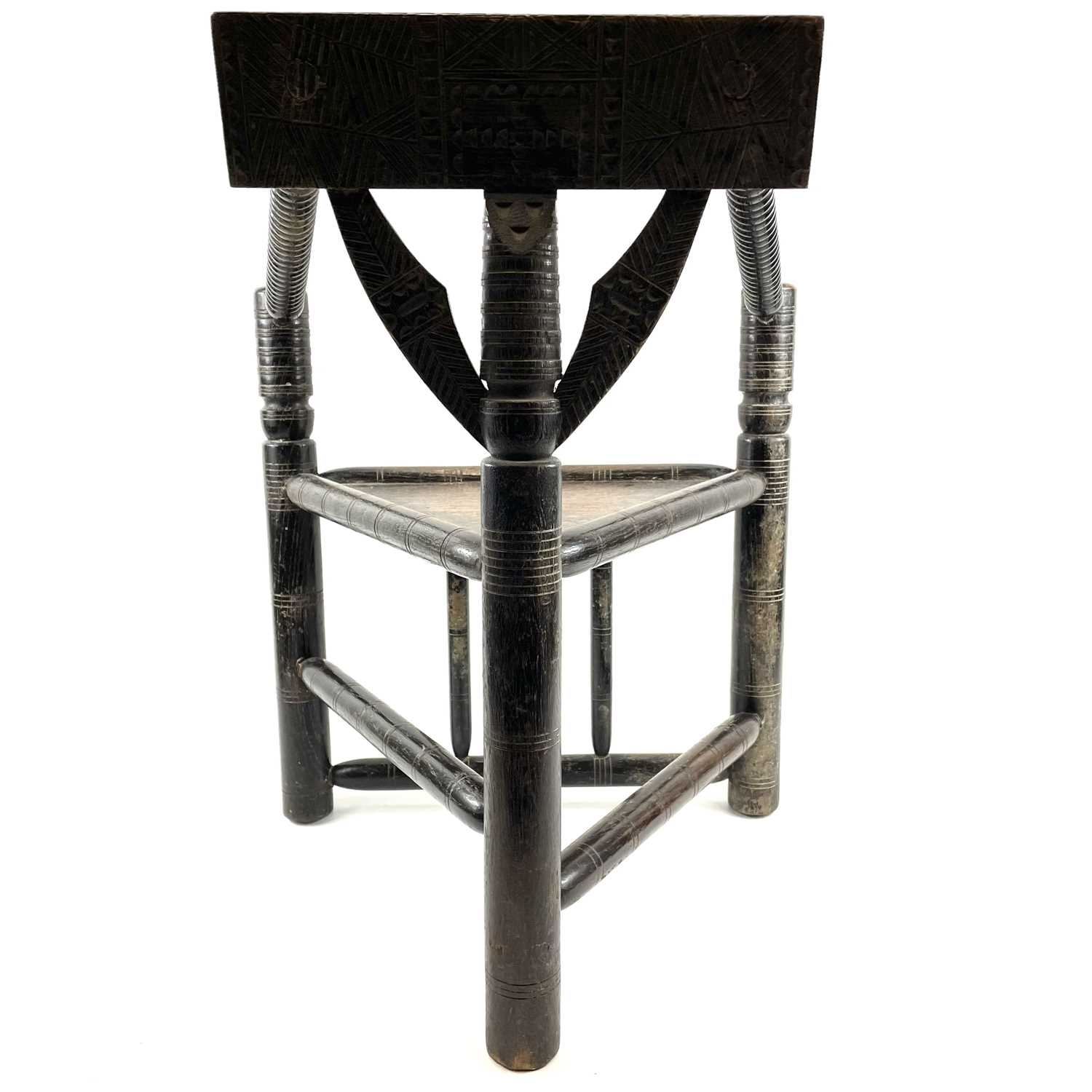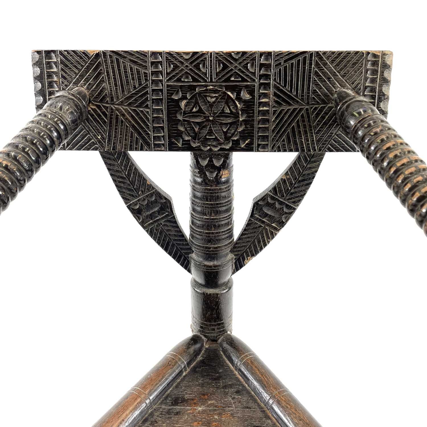A Child's oak turner's chair. Circa 1800, with triangular seat and turned and chip carved decoration, height 58.5cm, total width 45cm.