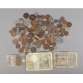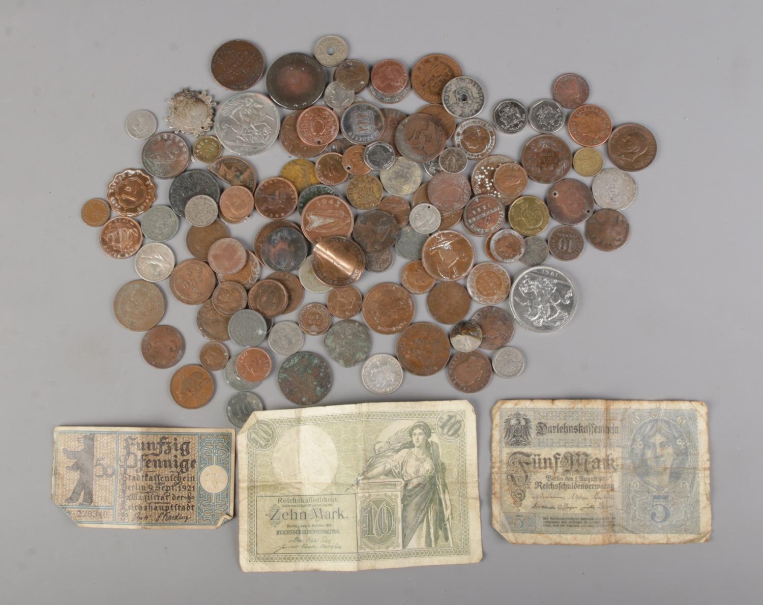 A collection of GB and world coins, banknotes and tokens. To include wheel penny, 1951 crown, 1835 East India half anna George III penny, spade guinea token, Remmington Typewriter 'Four Generations of the Royal Family' token, 10 Zehn Mark etc.