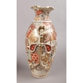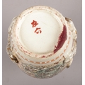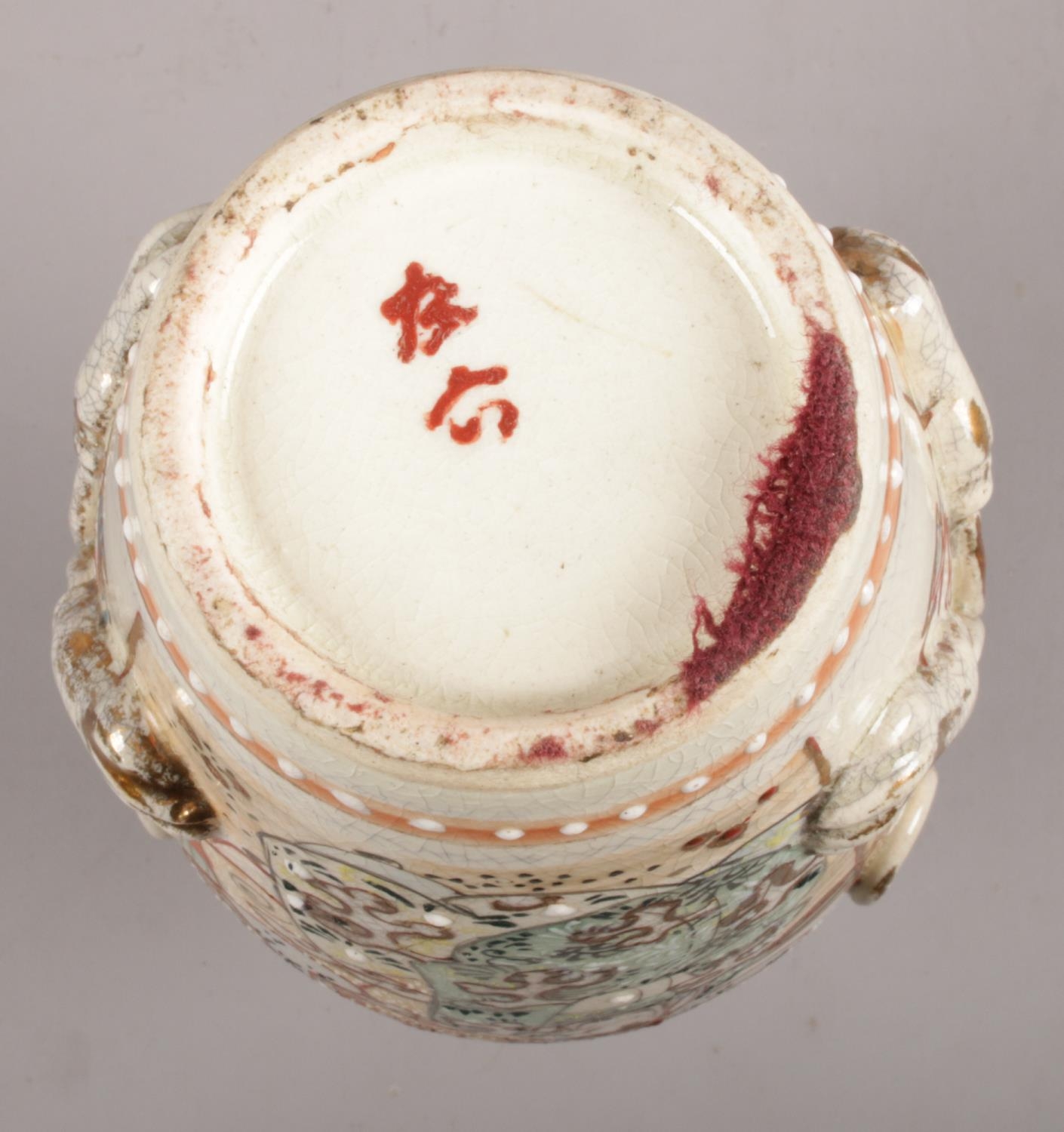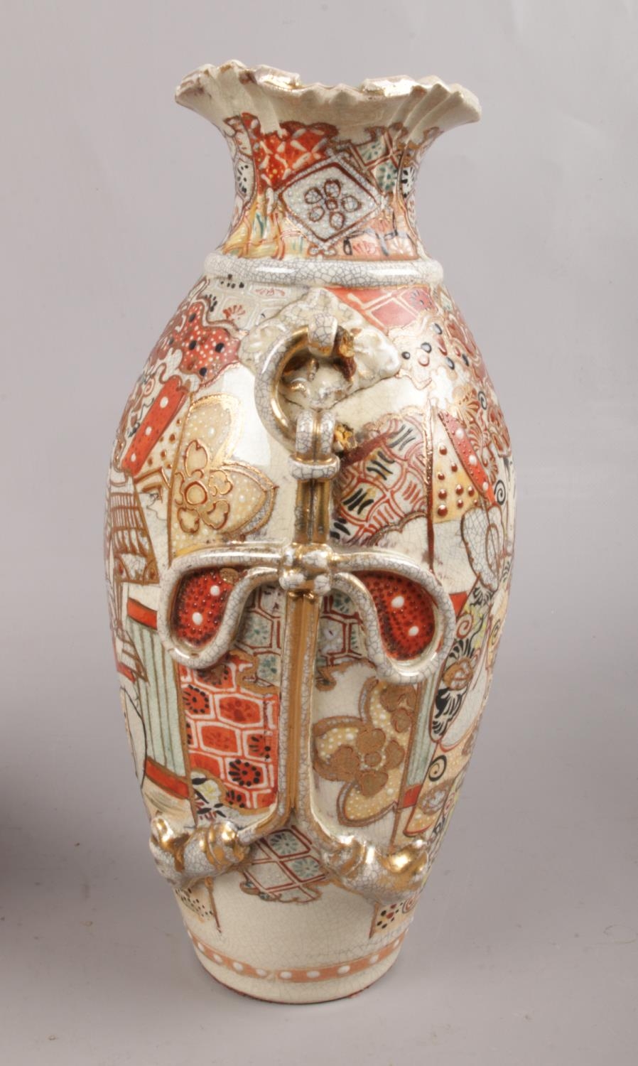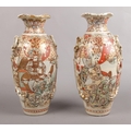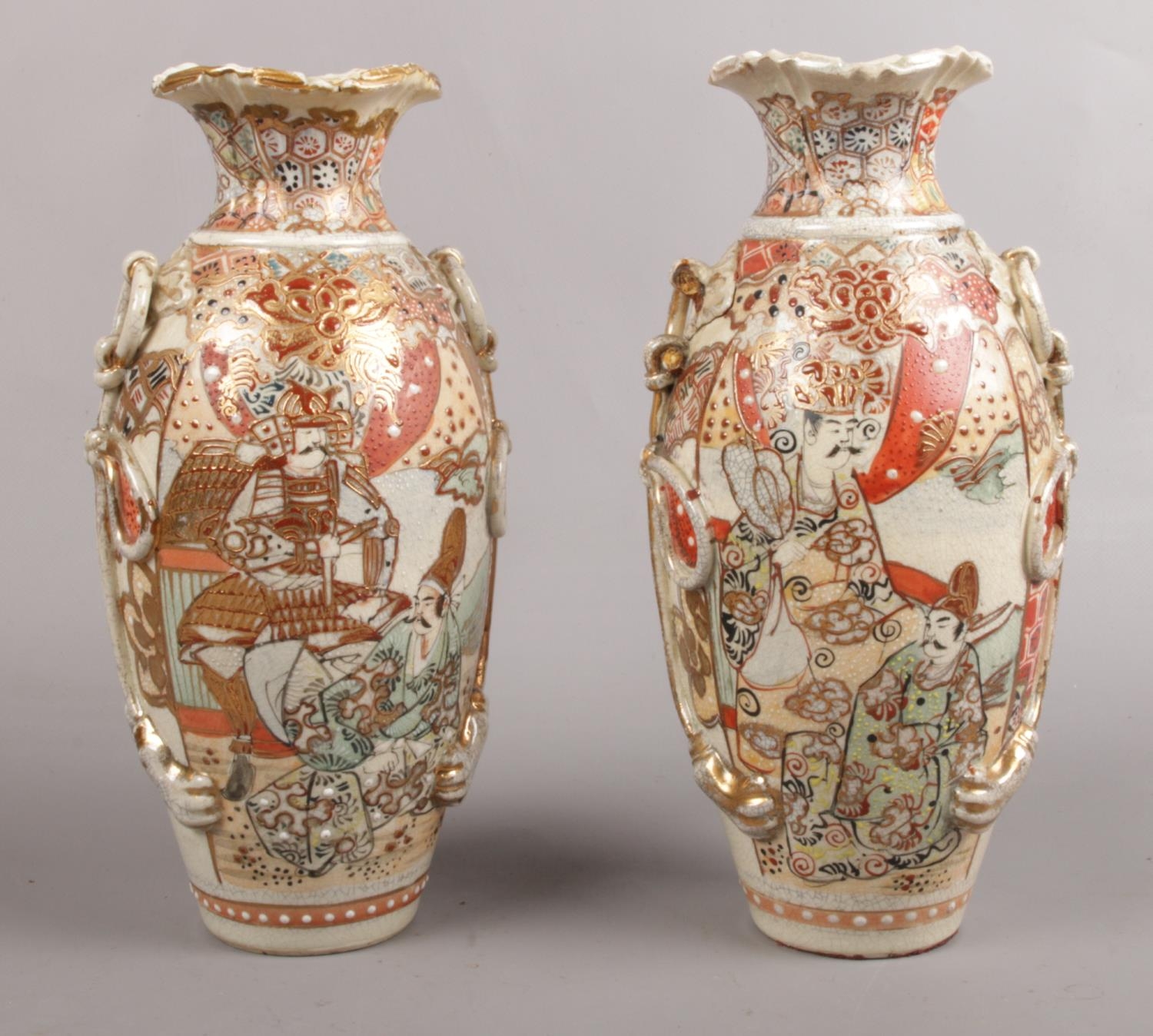 A pair of Satsuma style vases, depicting warriors decorated with twin-rope twist handles. Makers mark to the base. H: 25.5cm.