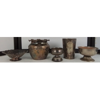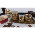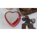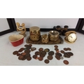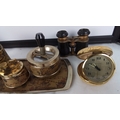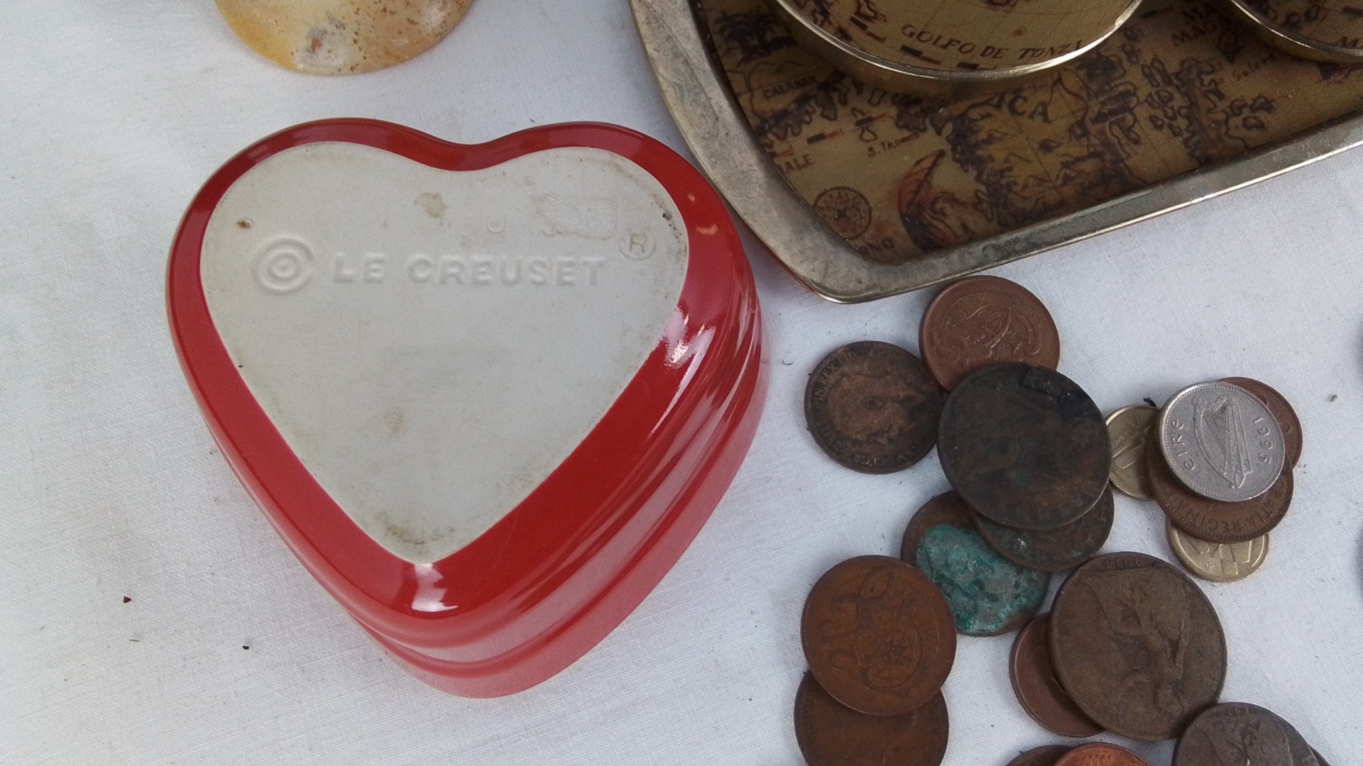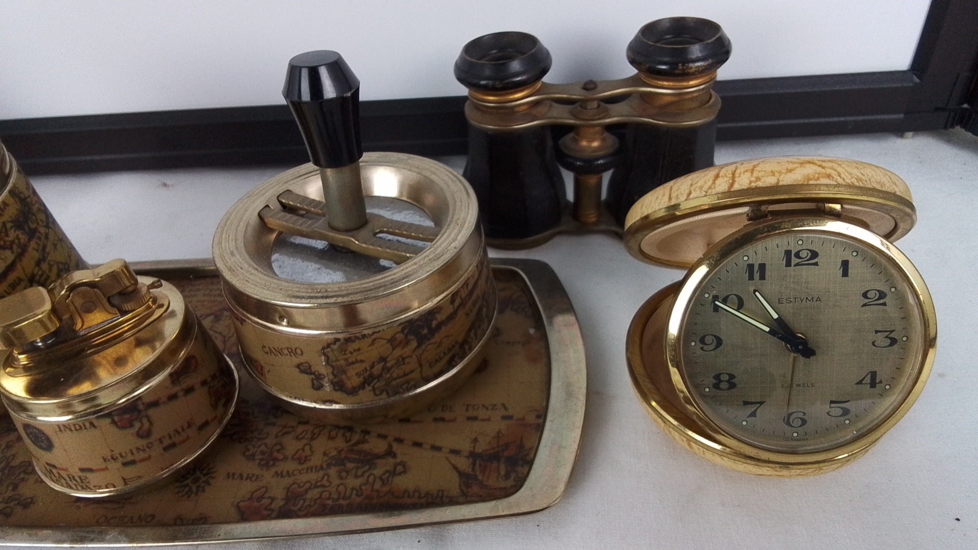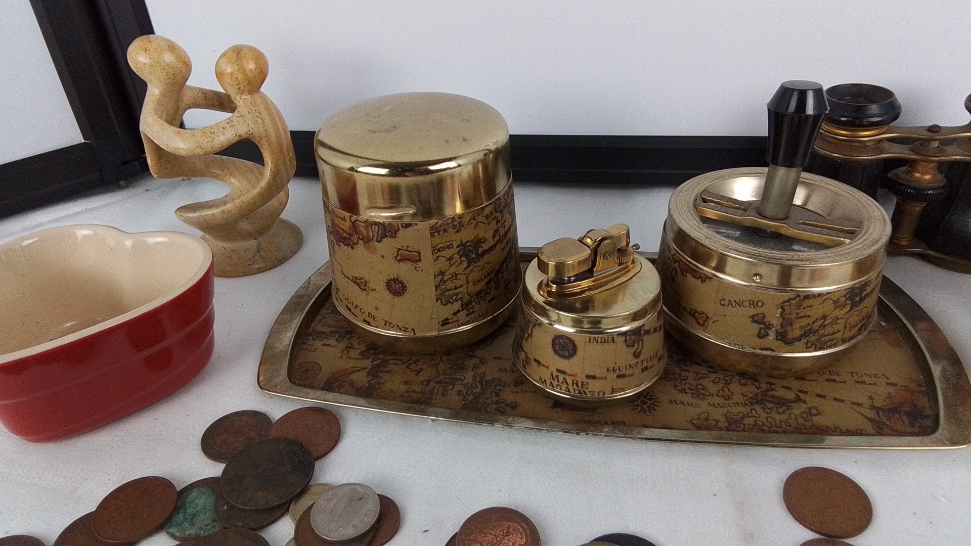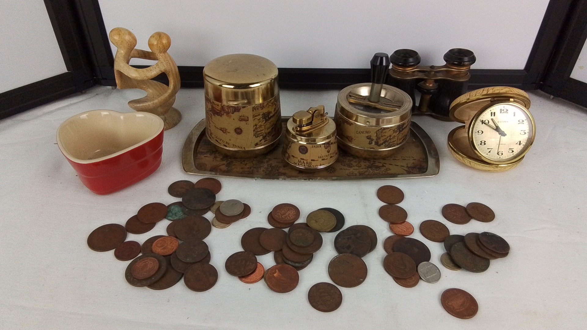 Group of vintage desk and decorative items, comprising a gilt-metal world-map smoking set on tray, an Estyma travel alarm clock, opera glasses, a Le Creuset heart-shaped ceramic dish, assorted mixed coins, and a small abstract stone figure.