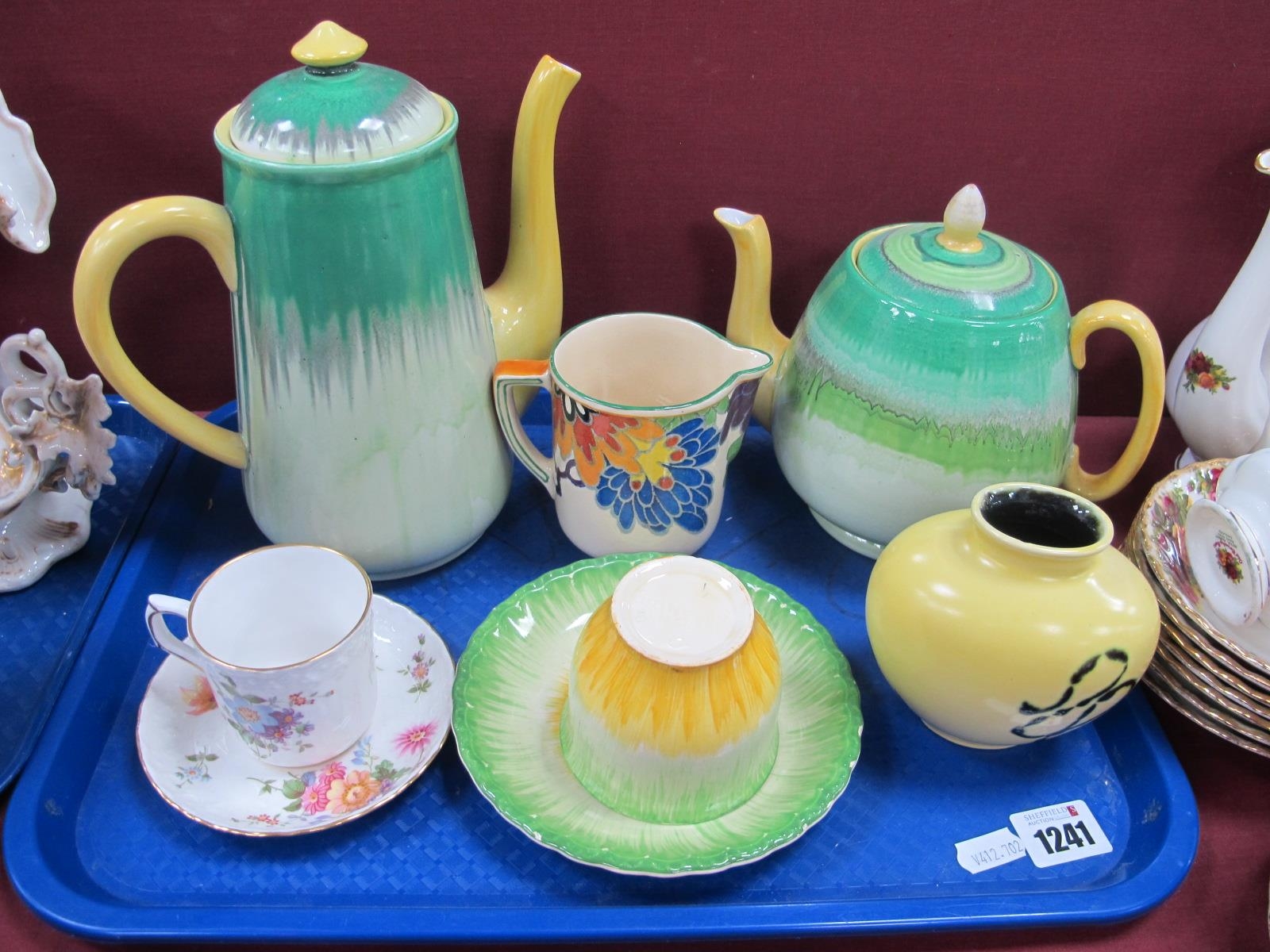 Shelley Drizzle Pattern Teapot and Coffee Pot, Derby cup and saucer (2nd quality), etc:- One Tray.