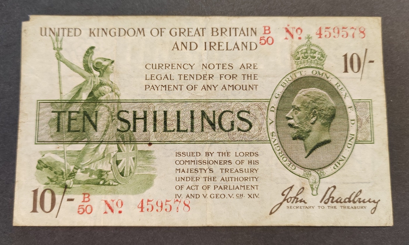 J.S. Bradbury. 1915 10/ - G/1 92659 fair (Duggleby T12) and 1918 10/ - B/50 459578 fair (Duggleby T20). Qty 2 (N)