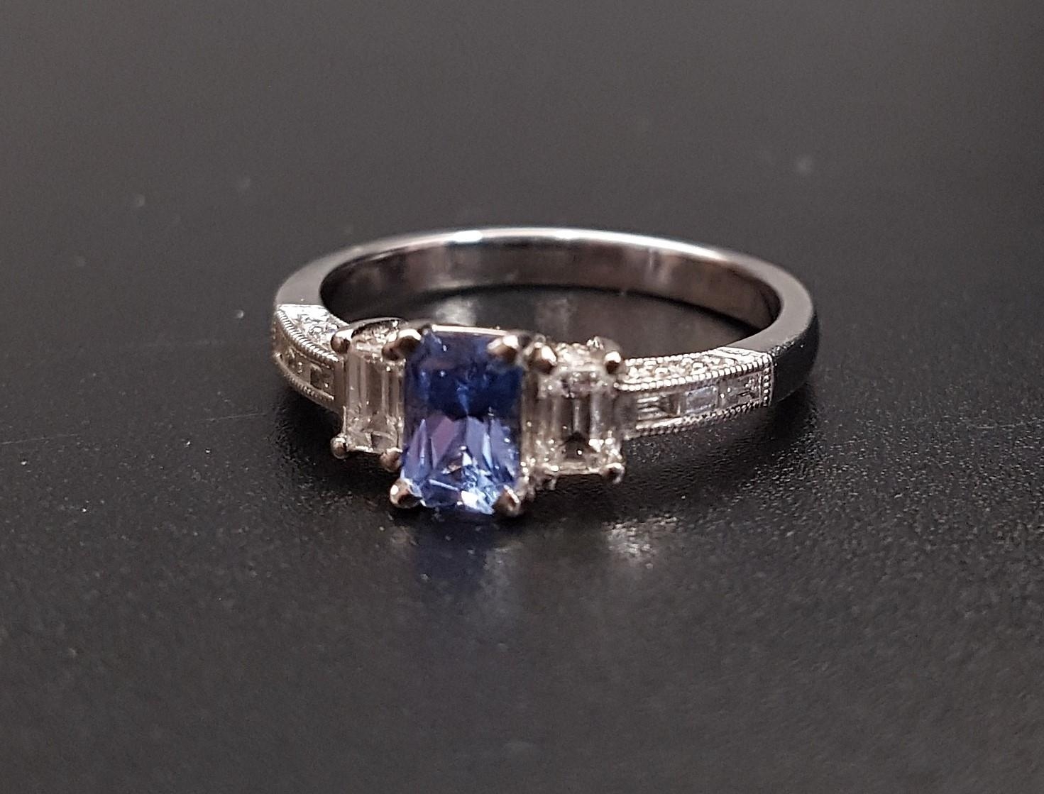 the central radiant cut tanzanite approximately 0.45cts, flanked by baguette cut diamonds to the shoulders and further round cut diamonds to the sides of the setting, on unmarked eighteen carat white gold, ring size L