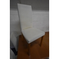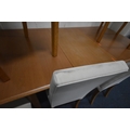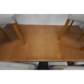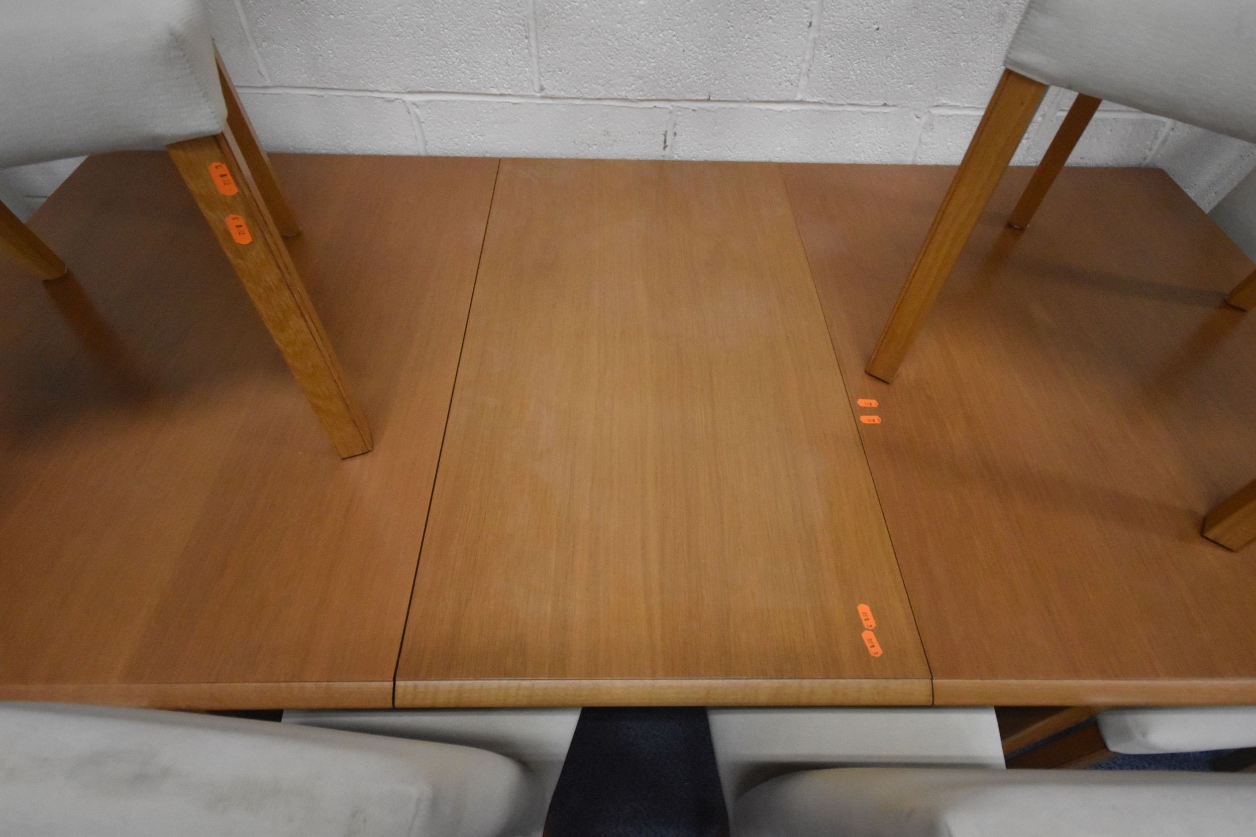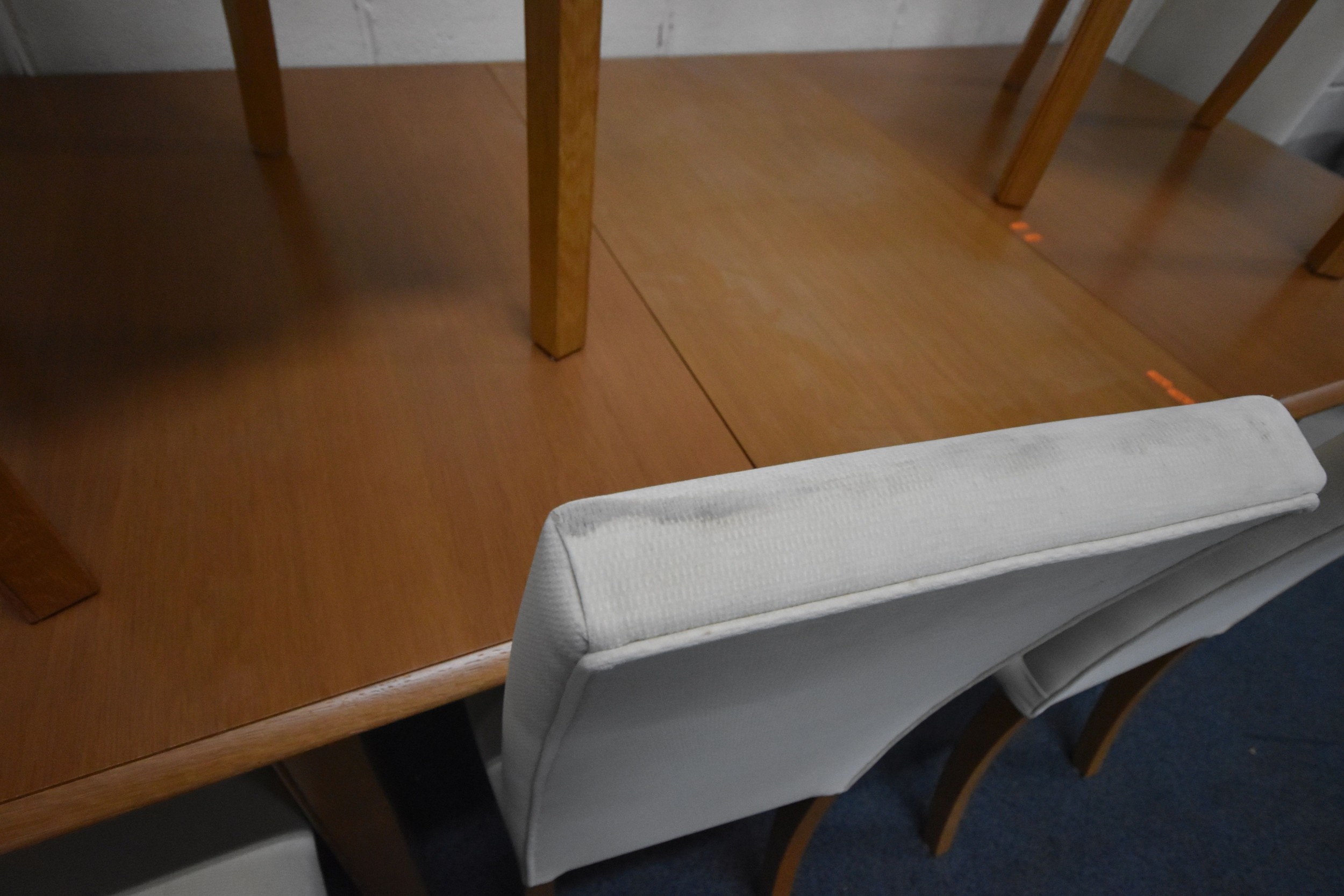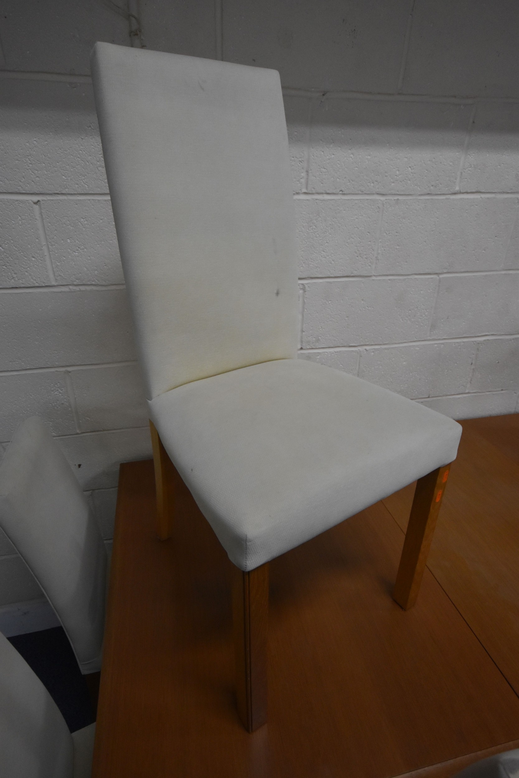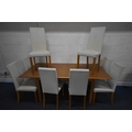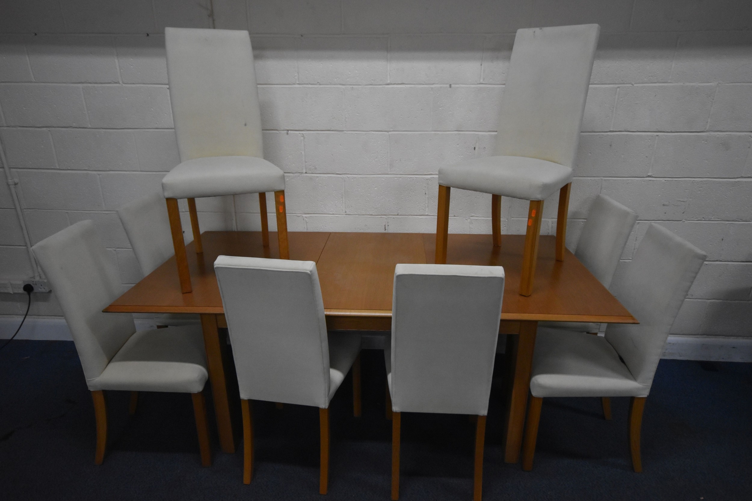 A MARKS AND SPENCER HOME LIGHT OAK EXTENDING DINING TABLE, with one additional leaf, extended length 196cm x closed length 146cm x depth 96cm x height 76cm, along with a set of eight chairs, condition report: upholstery discoloured and ideal for a clean, all with general signs of usage (10)