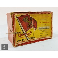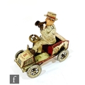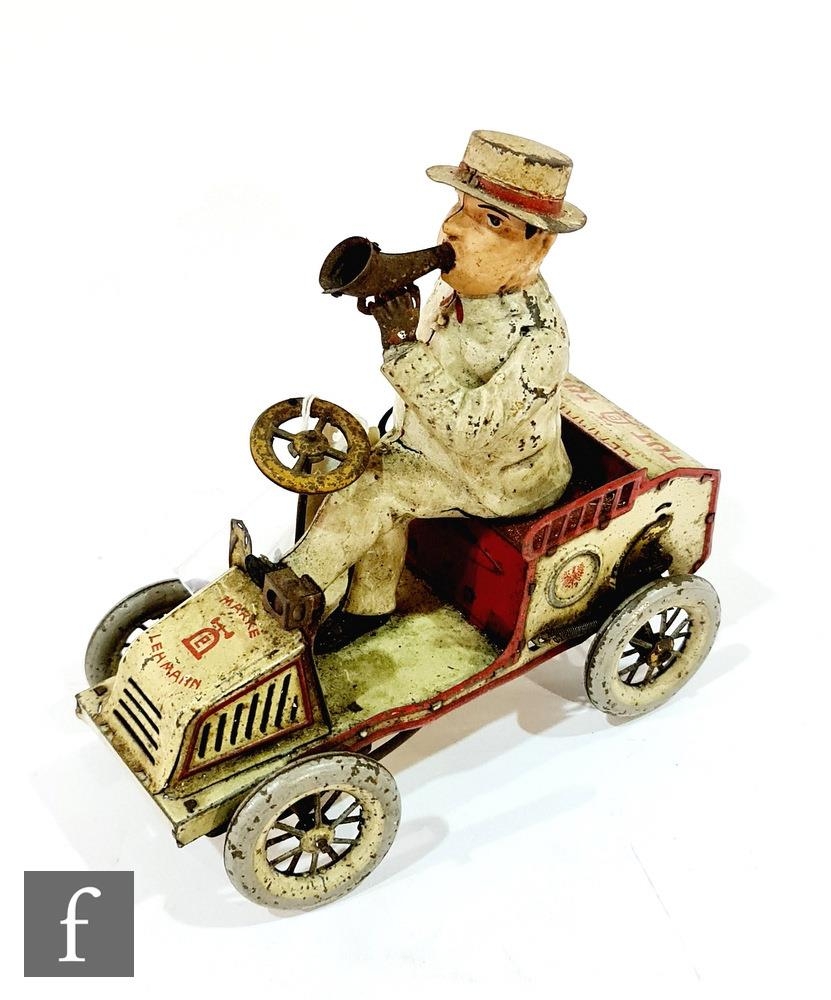 An early 20th Century Lehmann No. 490 Tut Tut Motor Car, in red and white with gentleman driver, integral key, steering mechanism and horn, paper bellows, driver with one arm detached but present, lacking one lamp to front.