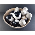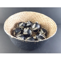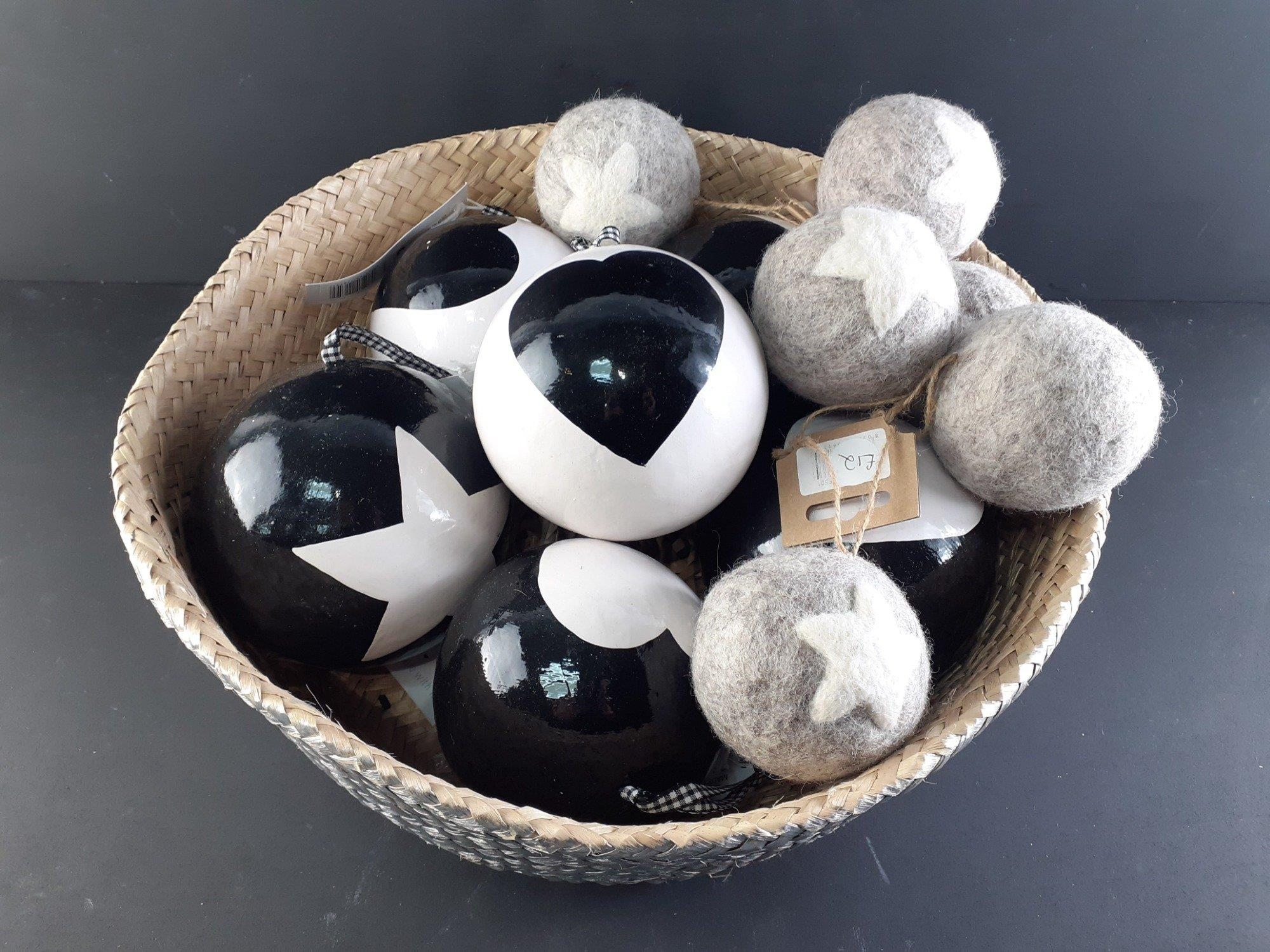 XMAS GIFTING IDEAS! - Brand new woven basket containing 6 large RETREAT brand white decorative baubles with text HEARTS and STARS, and 6 GARDEN TRADING felted wool baubles with stars.. RRP £90.