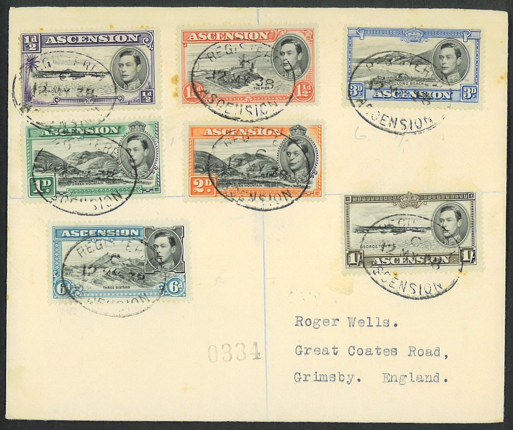 ASCENSION - 1938 (12 May) First Day Cover regd Roger Wells to UK bearing 7 different values to 1s cancelled registered ovals on first day of issue. Some tones.