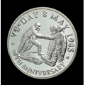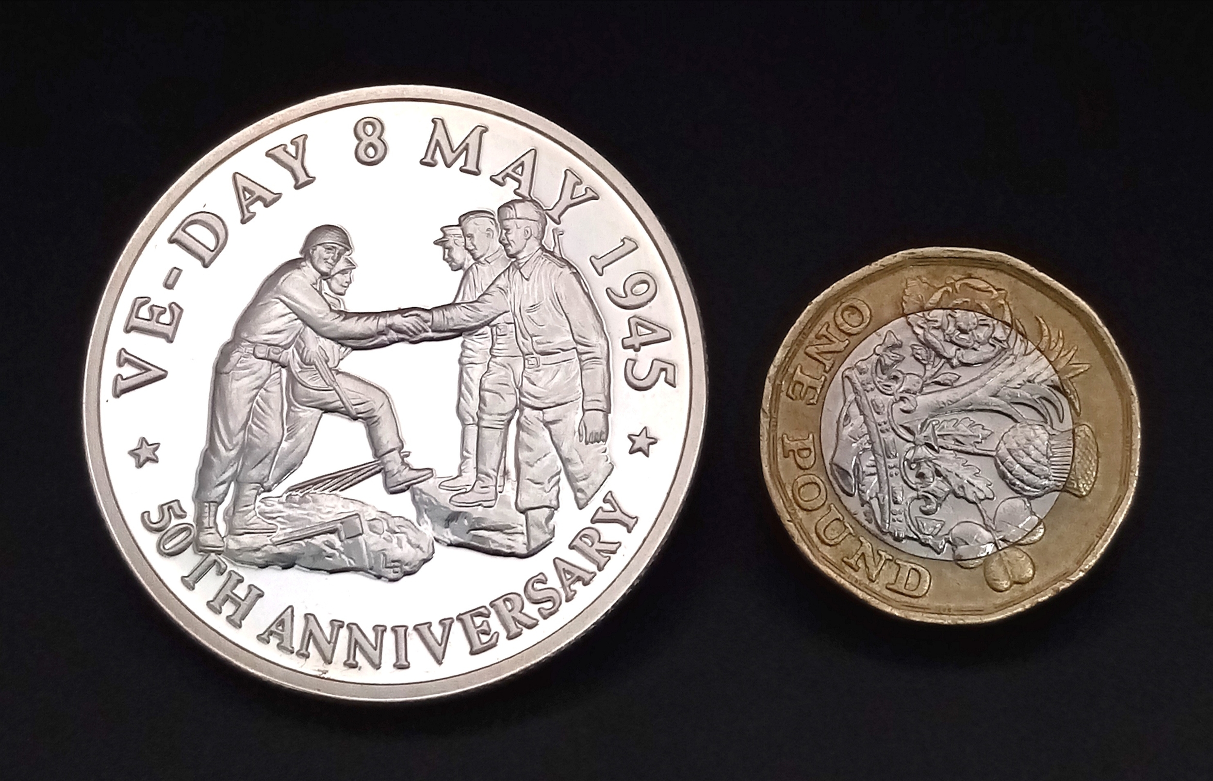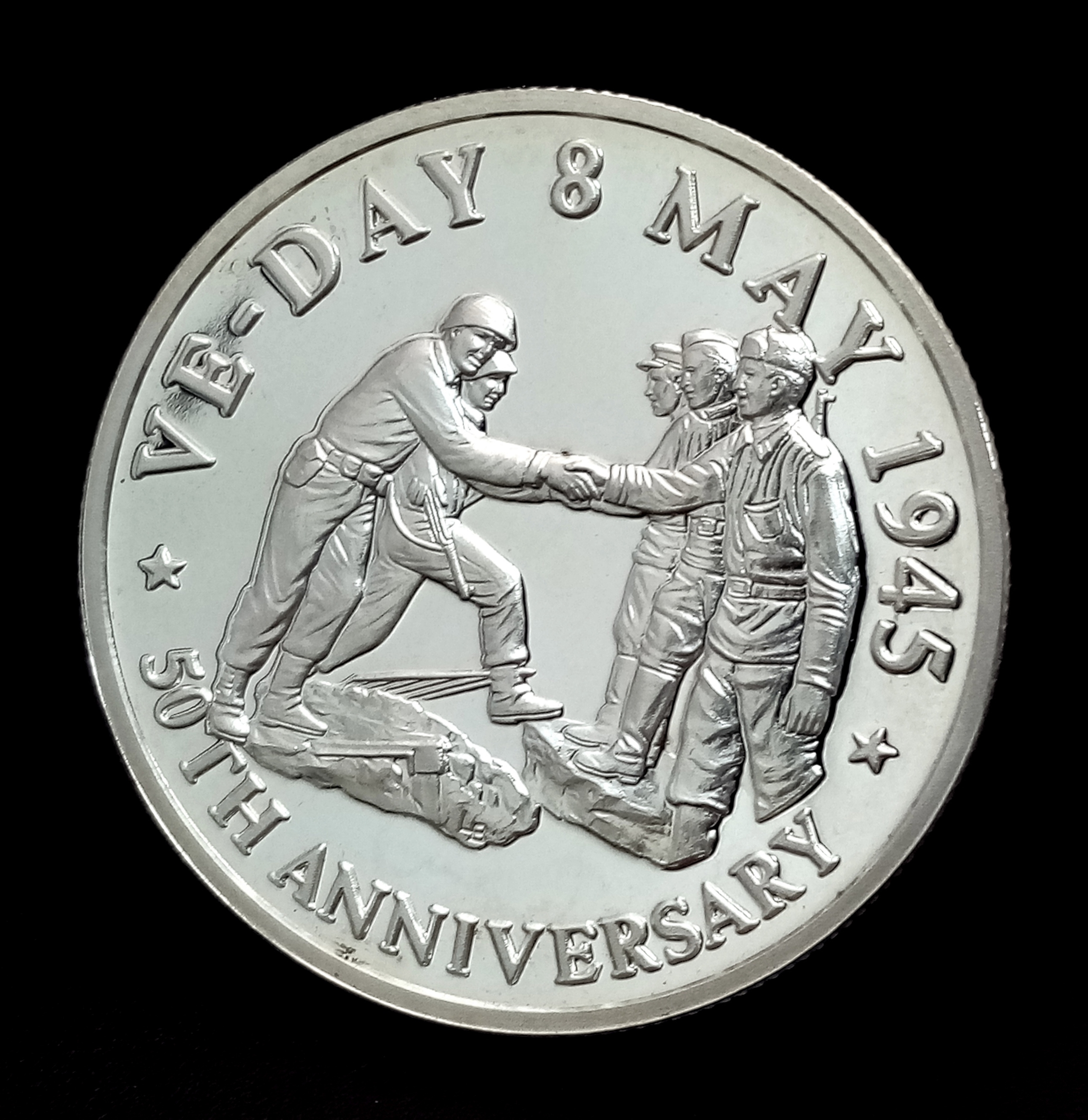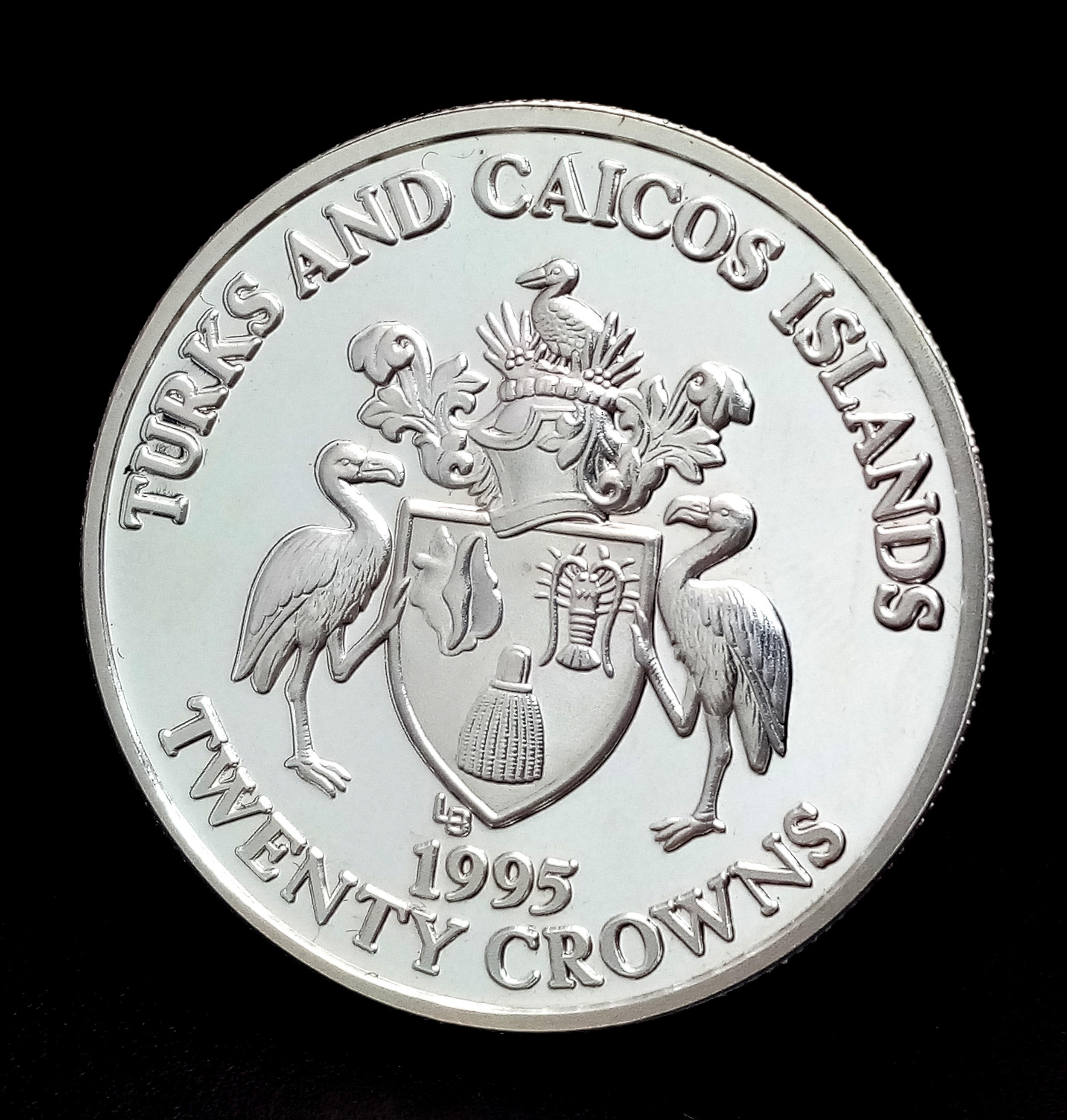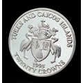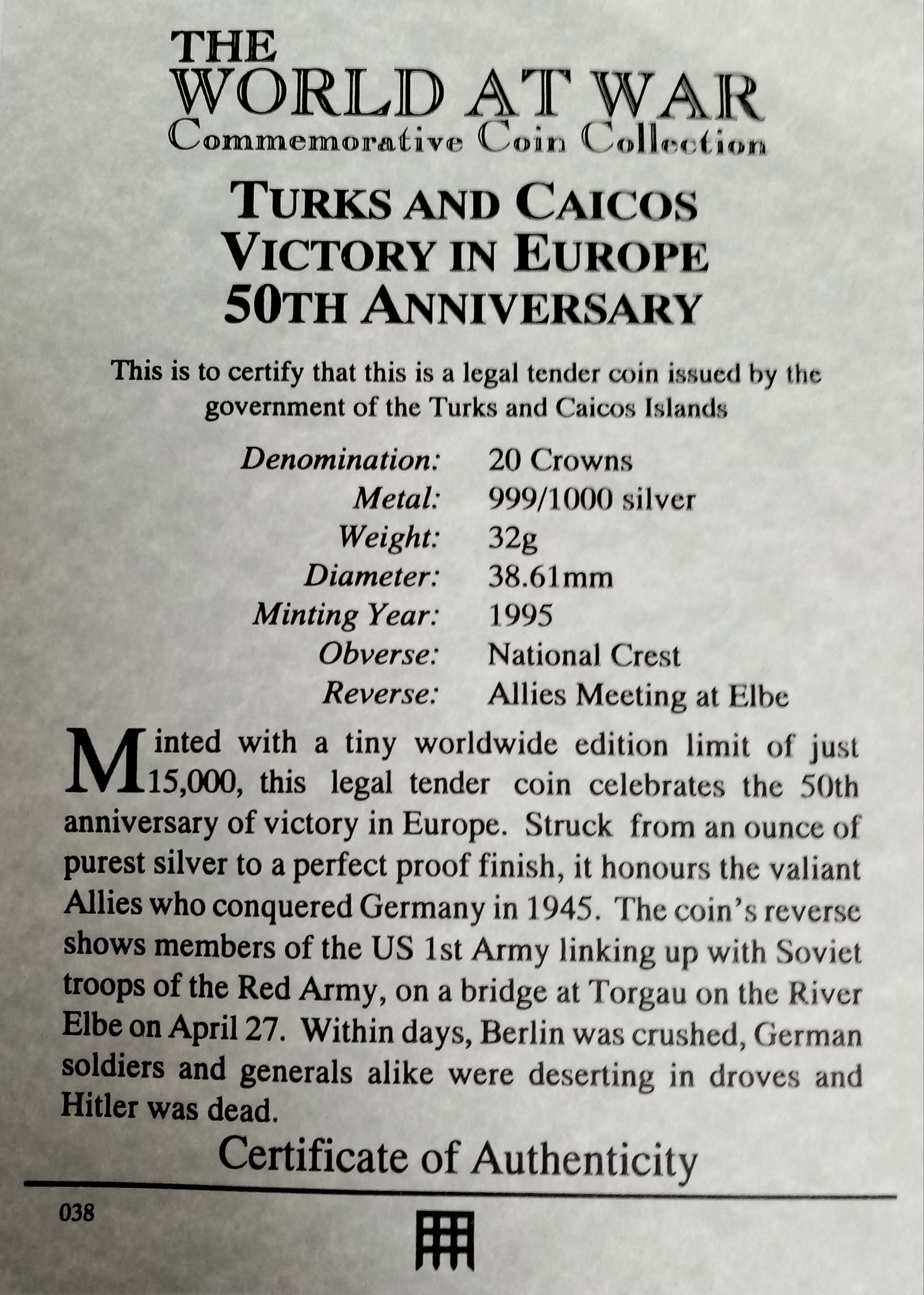 A 50 th Anniversary Victory in Europe Fine Silver 20 Crowns Turks and Caicos Coin Dated 1995. 32 Grams of 999 Fine Silver. Commemorates the Allies Meeting in Elbe.