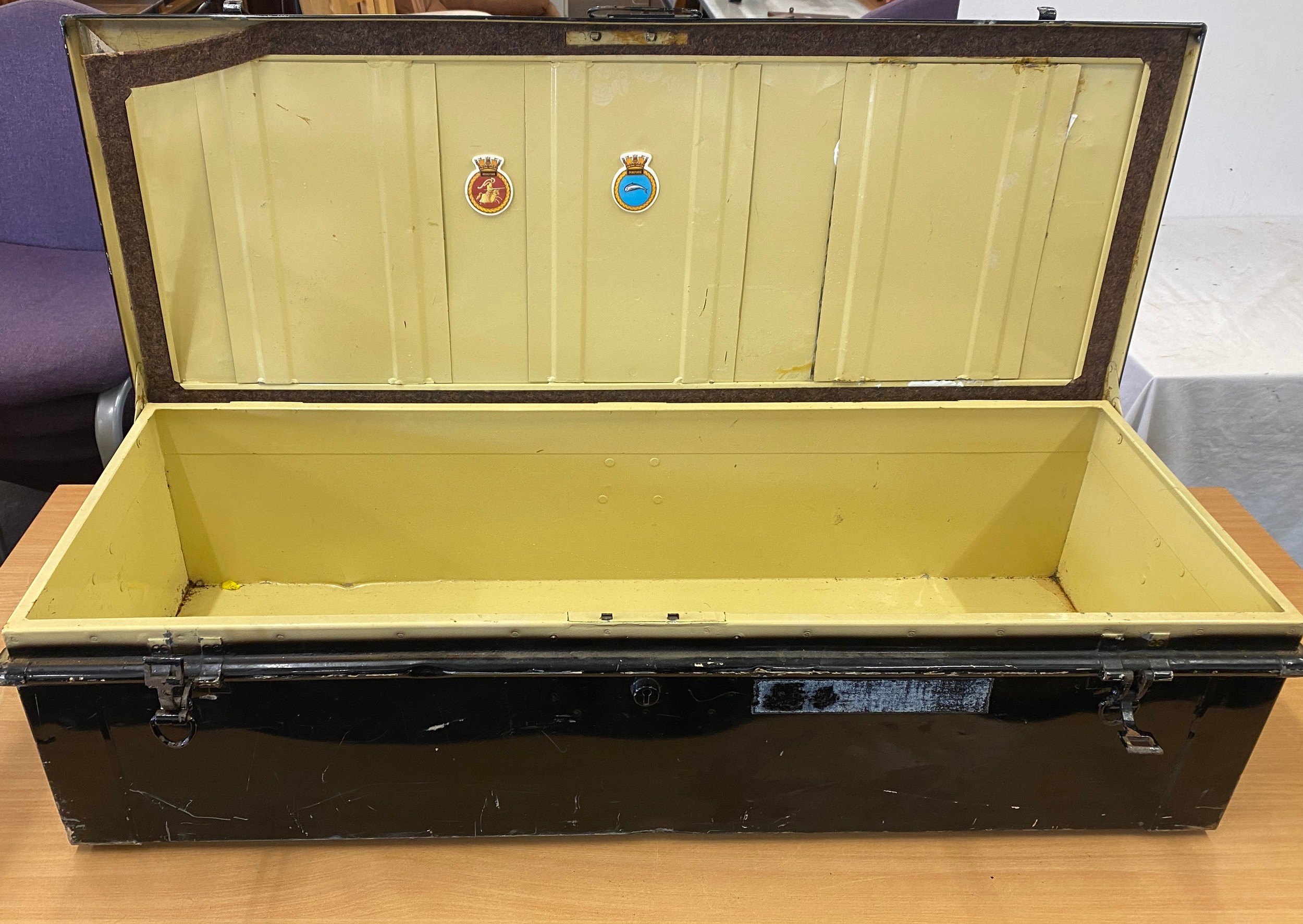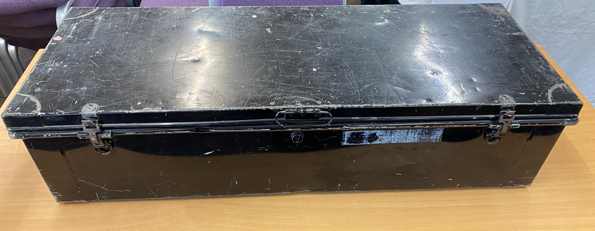Vintage metal trunk measures approx 44 inches wide 11 inches tall