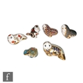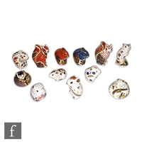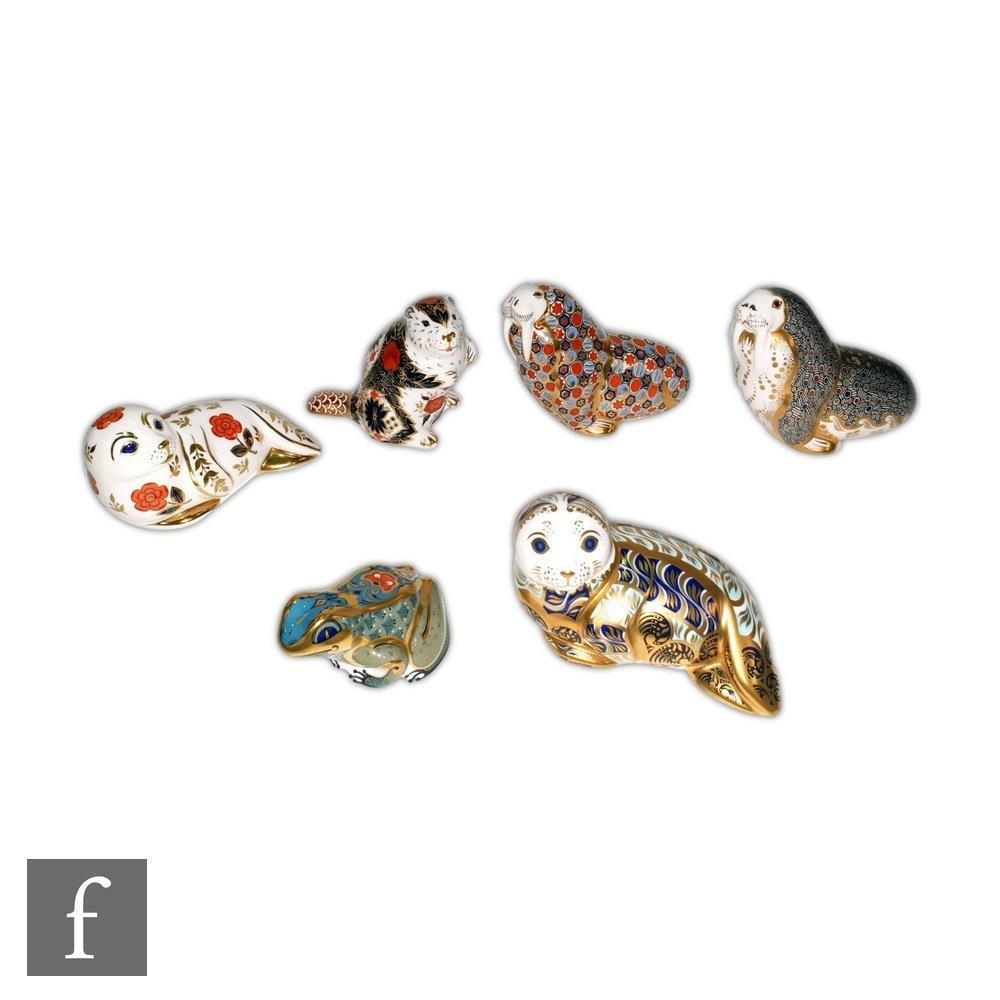 Six Royal Crown Derby paperweights to include Old Imari Beaver exclusively made for Peter Jones of Wakefield, Harbour Seal numbered 1168 of 4500, Fountain Frog, all with printed marks, all with gold stoppers, boxes for beaver, walrus, seal and frog. (6)