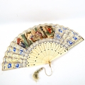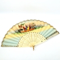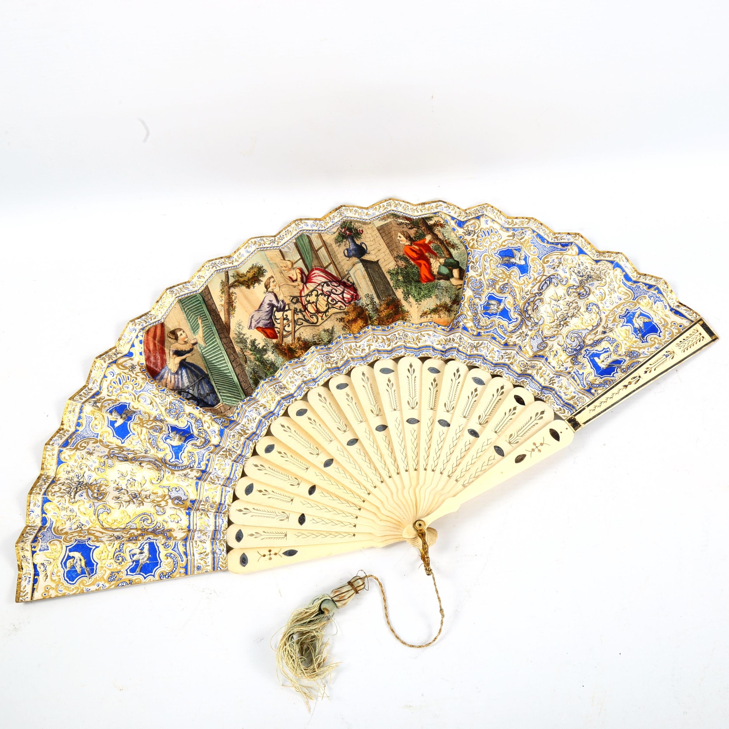 A 19th century French bone and paper fan, with hand-coloured printed romantic scenes, length 27cm
