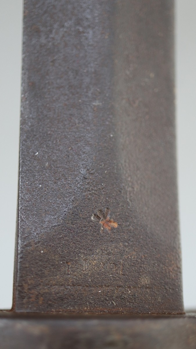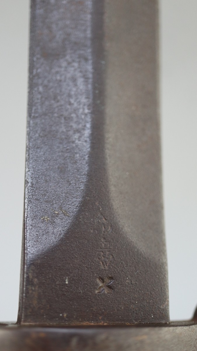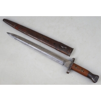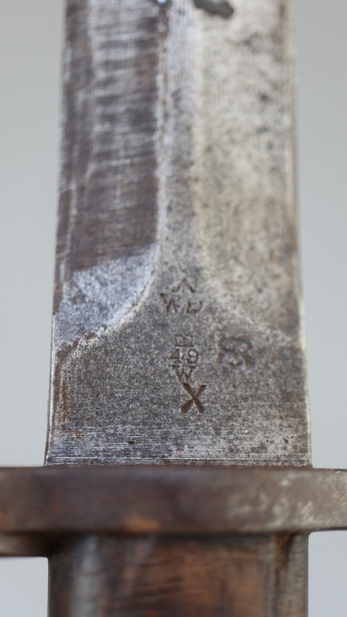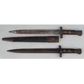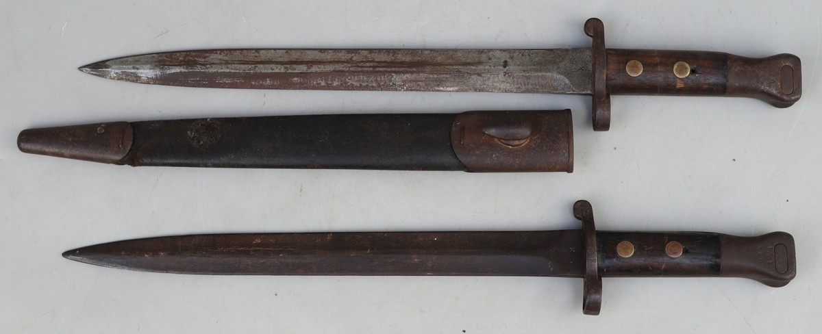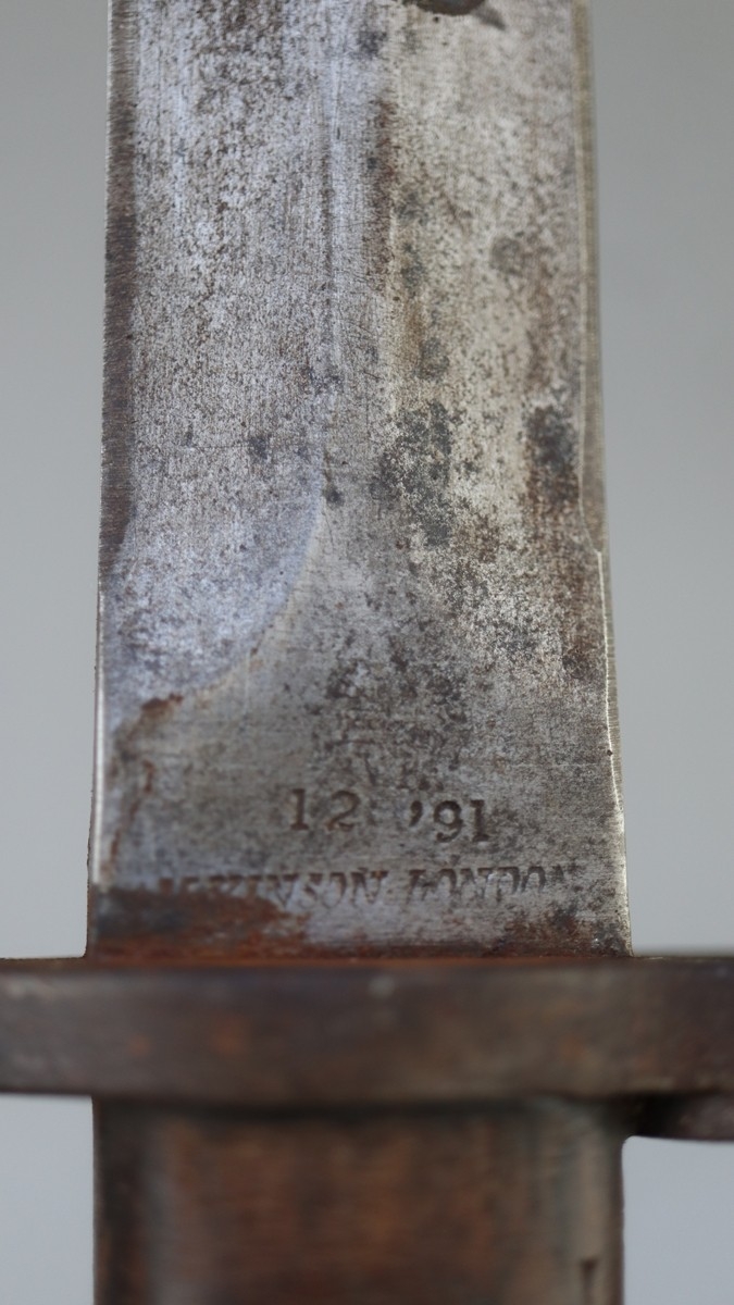1888 pattern Lee Metford Enfield bayonet (Boer War type) made by Wilkinson, issue date 1891 with leather and steel scabbard, and second 1888 Lee Metford bayonet issue date 1891 by Wilkinson without scabbard.