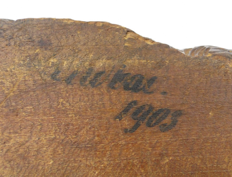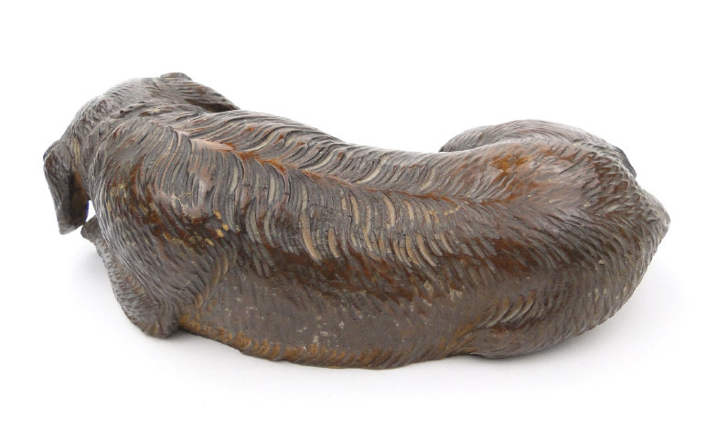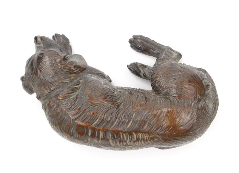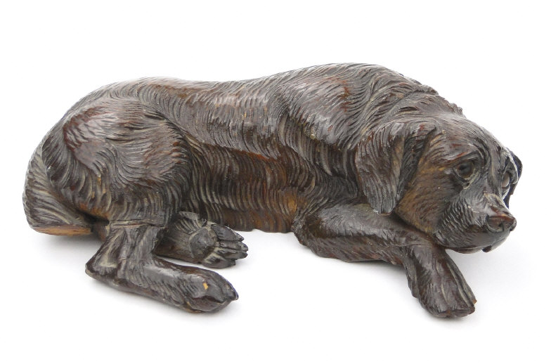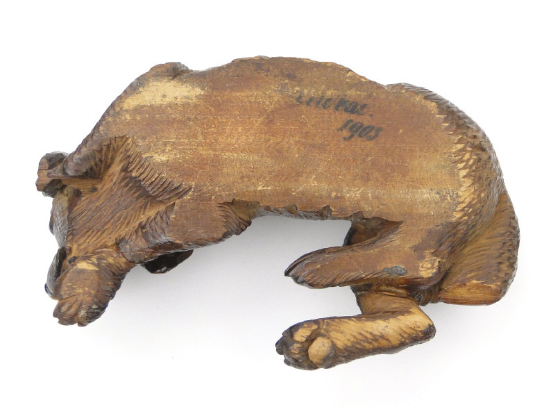 Black Forest carved wood recumbent dog, dated 1903 to the base, 17cm in length