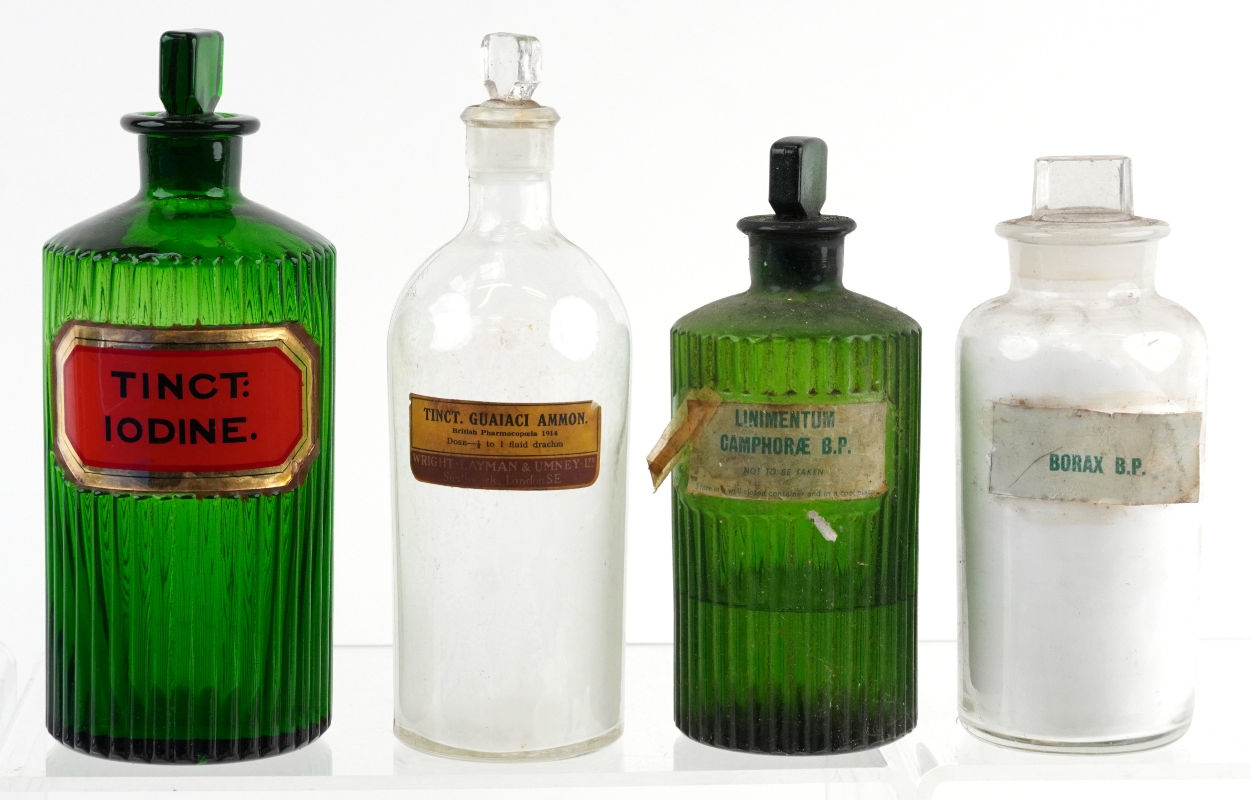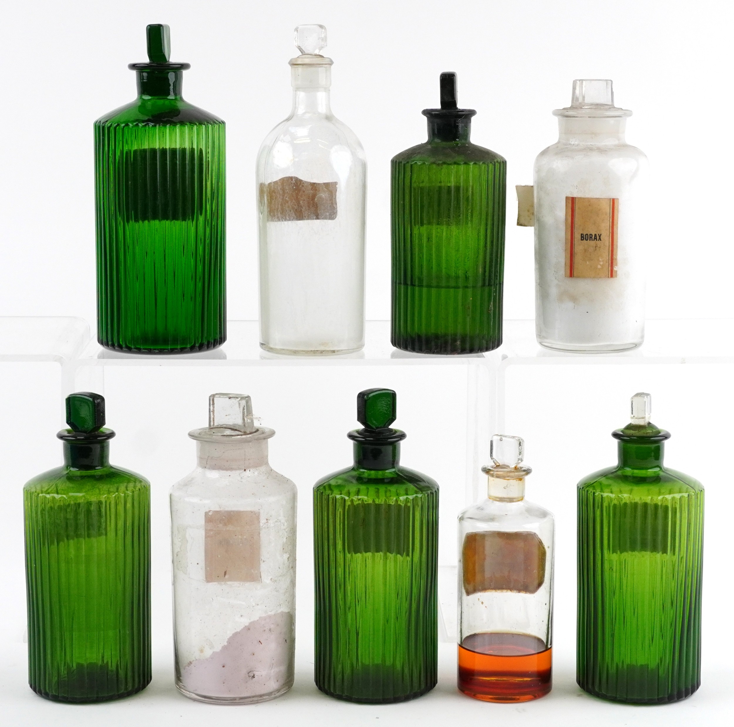 A collection of early 20th century apothecary/pharmaceutical glass bottles with stoppers, the largest 24cm high.