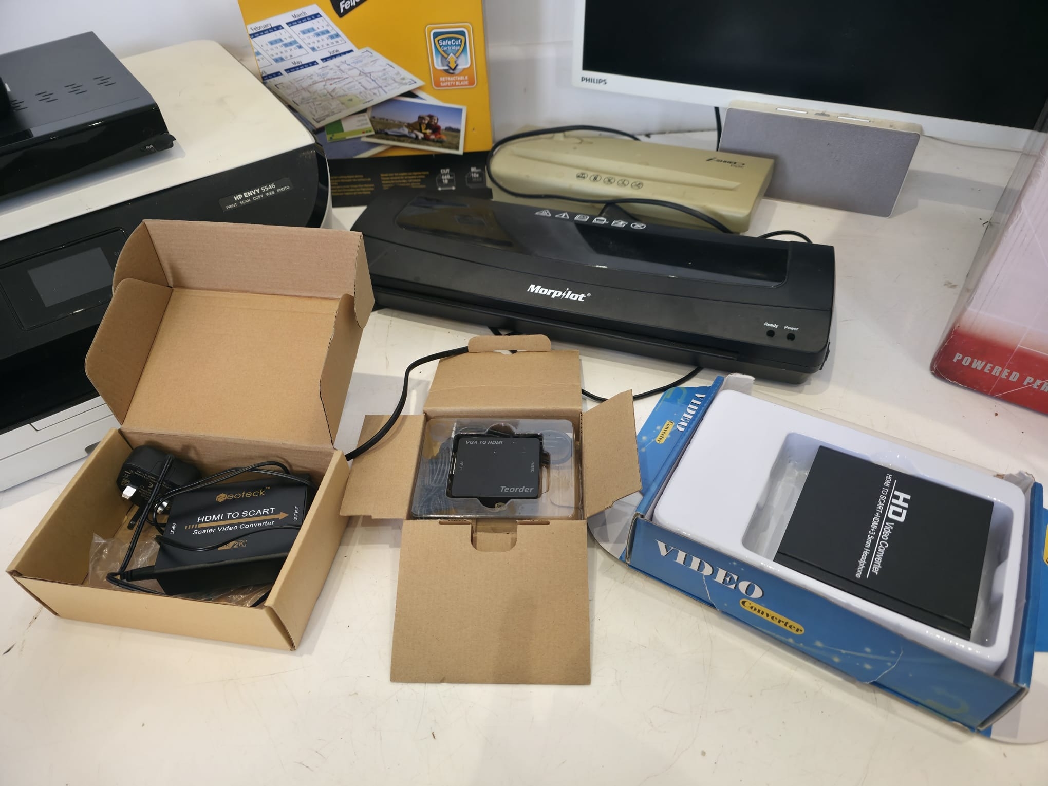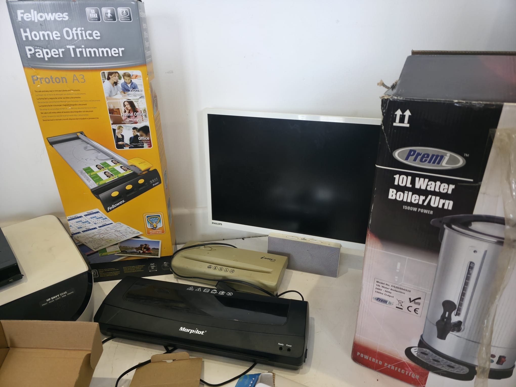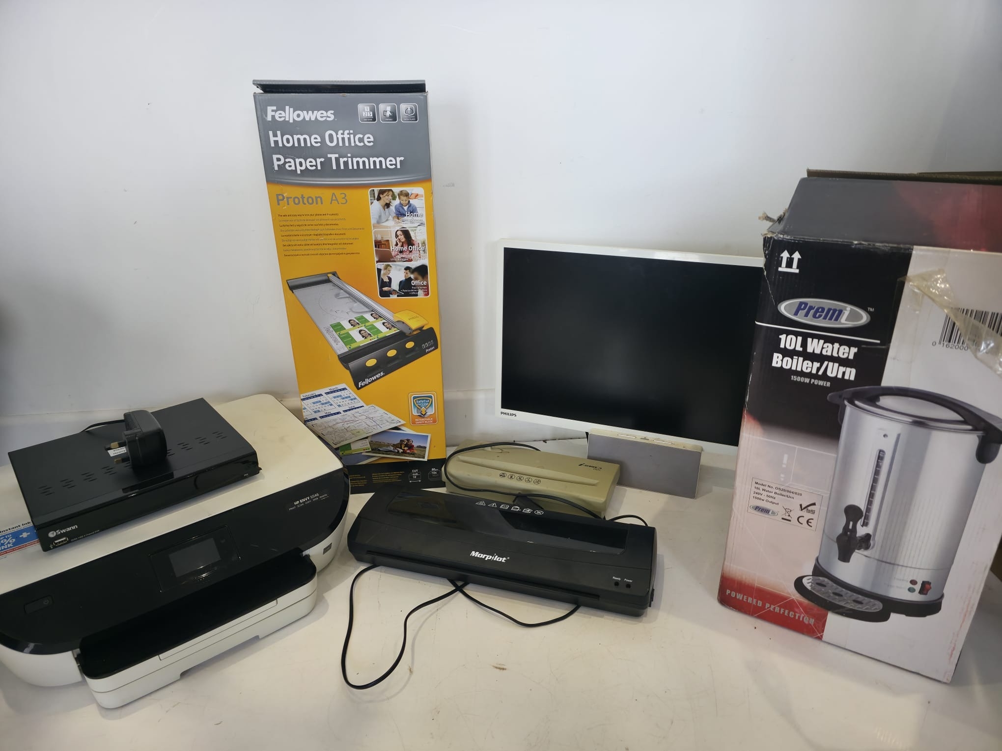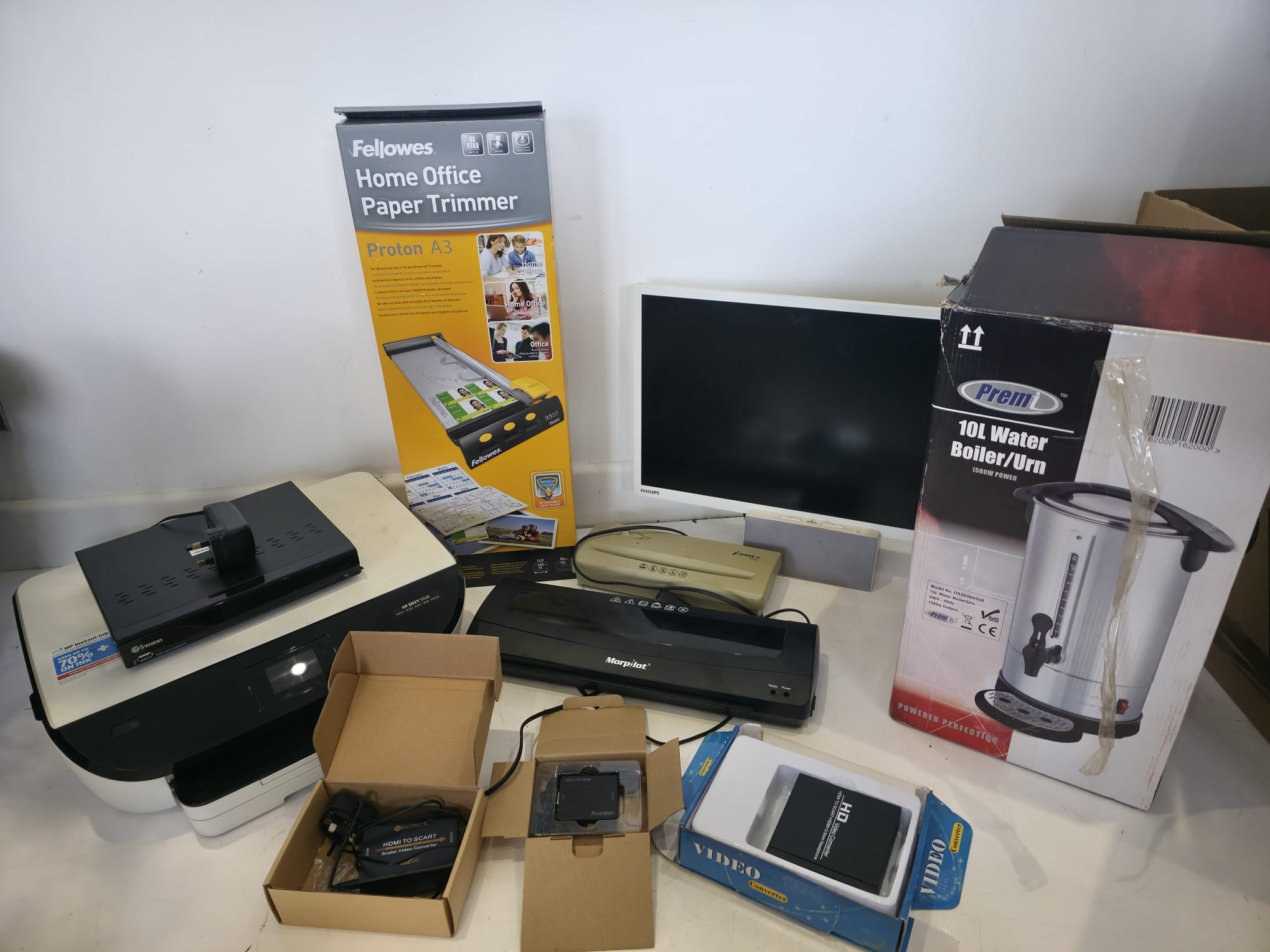 A varied mixed lot to include a HP Envy 5546 all-in-one printer, Swann DVR unit, Fellowes Proton A3 paper trimmer (boxed), Philips monitor, Morphy Richards laminator, additional compact laminator unit, and a selection of HDMI/video converters and accessories (boxed). Also includes a Premi 10L water boiler/urn (boxed). Mixed condition with general signs of use. Untested. Boxes present for some items. Sold as seen.