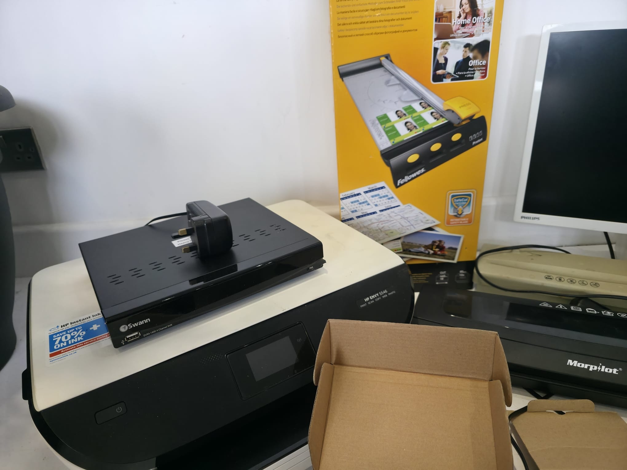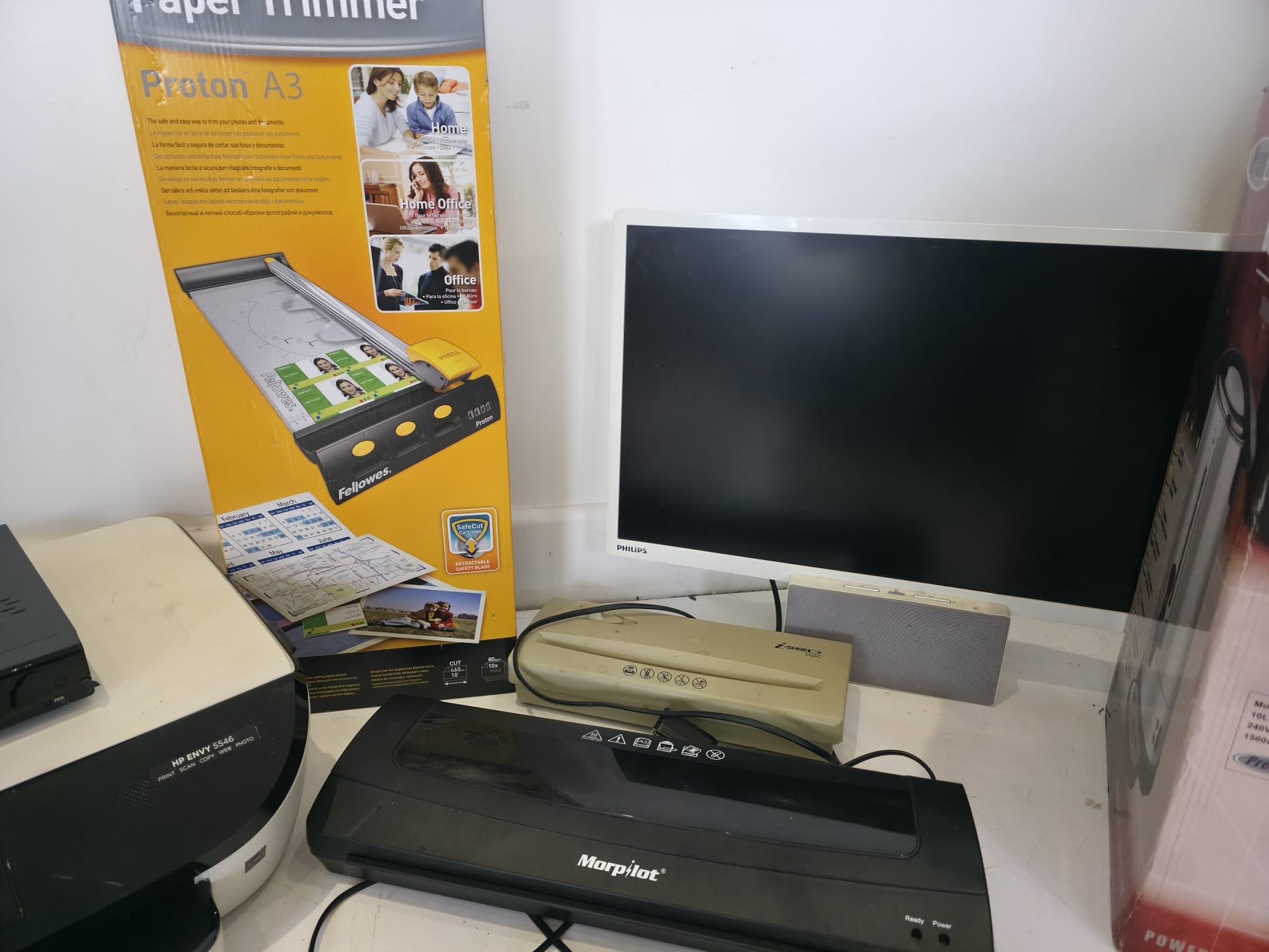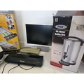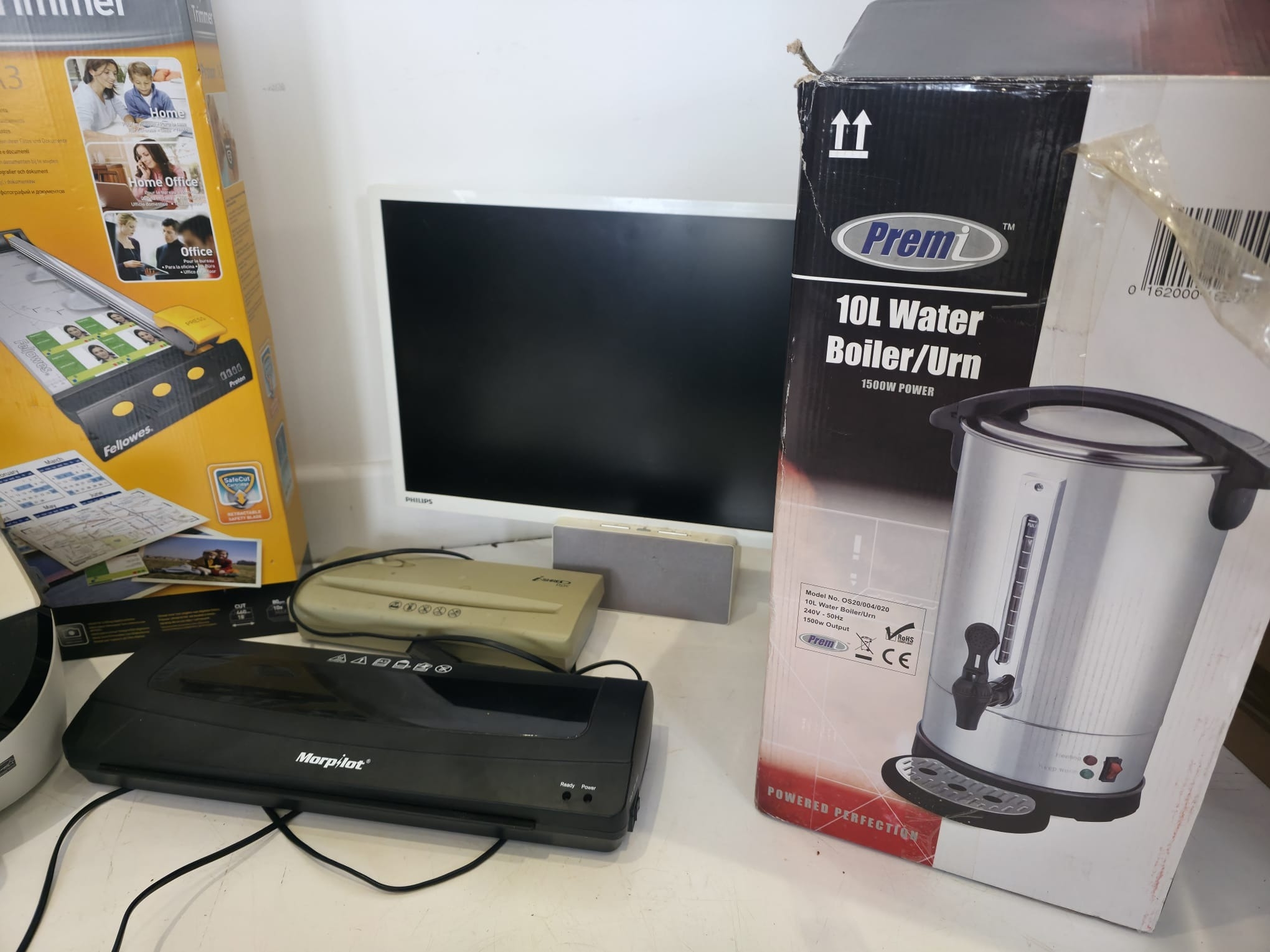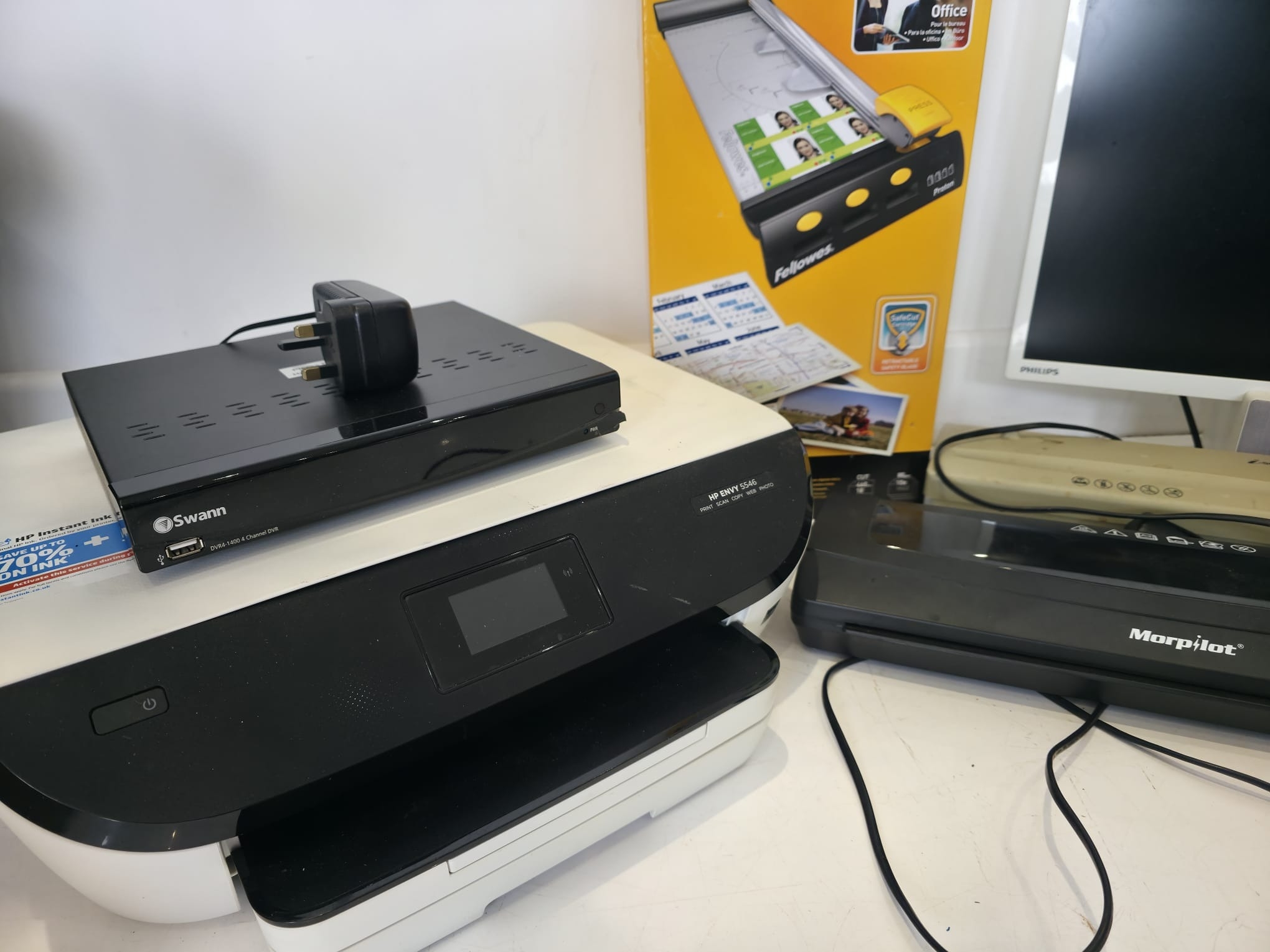 A varied mixed lot to include a HP Envy 5546 all-in-one printer, Swann DVR unit, Fellowes Proton A3 paper trimmer (boxed), Philips monitor, Morphy Richards laminator, additional compact laminator unit, and a selection of HDMI/video converters and accessories (boxed). Also includes a Premi 10L water boiler/urn (boxed). Mixed condition with general signs of use. Untested. Boxes present for some items. Sold as seen.