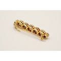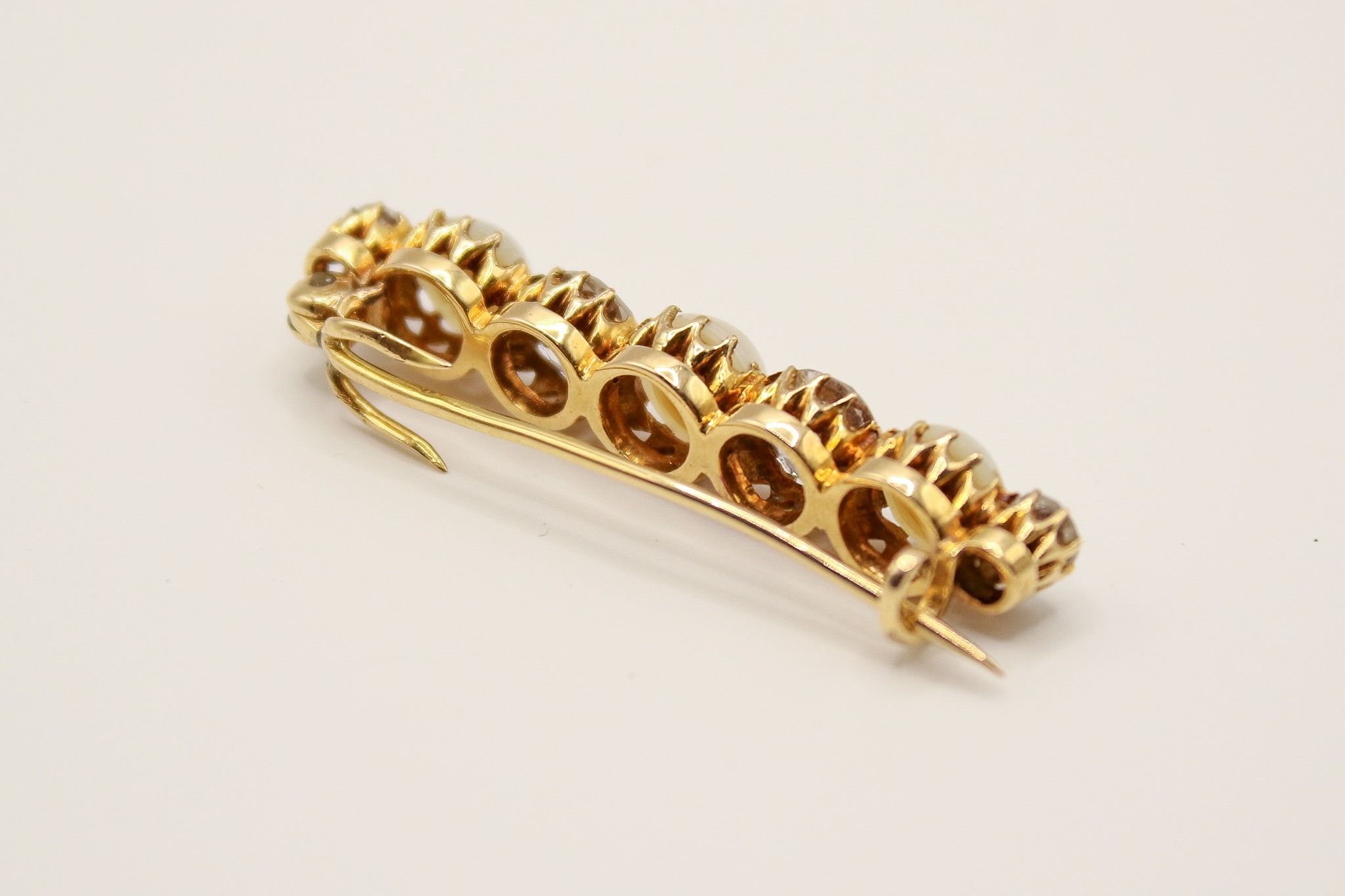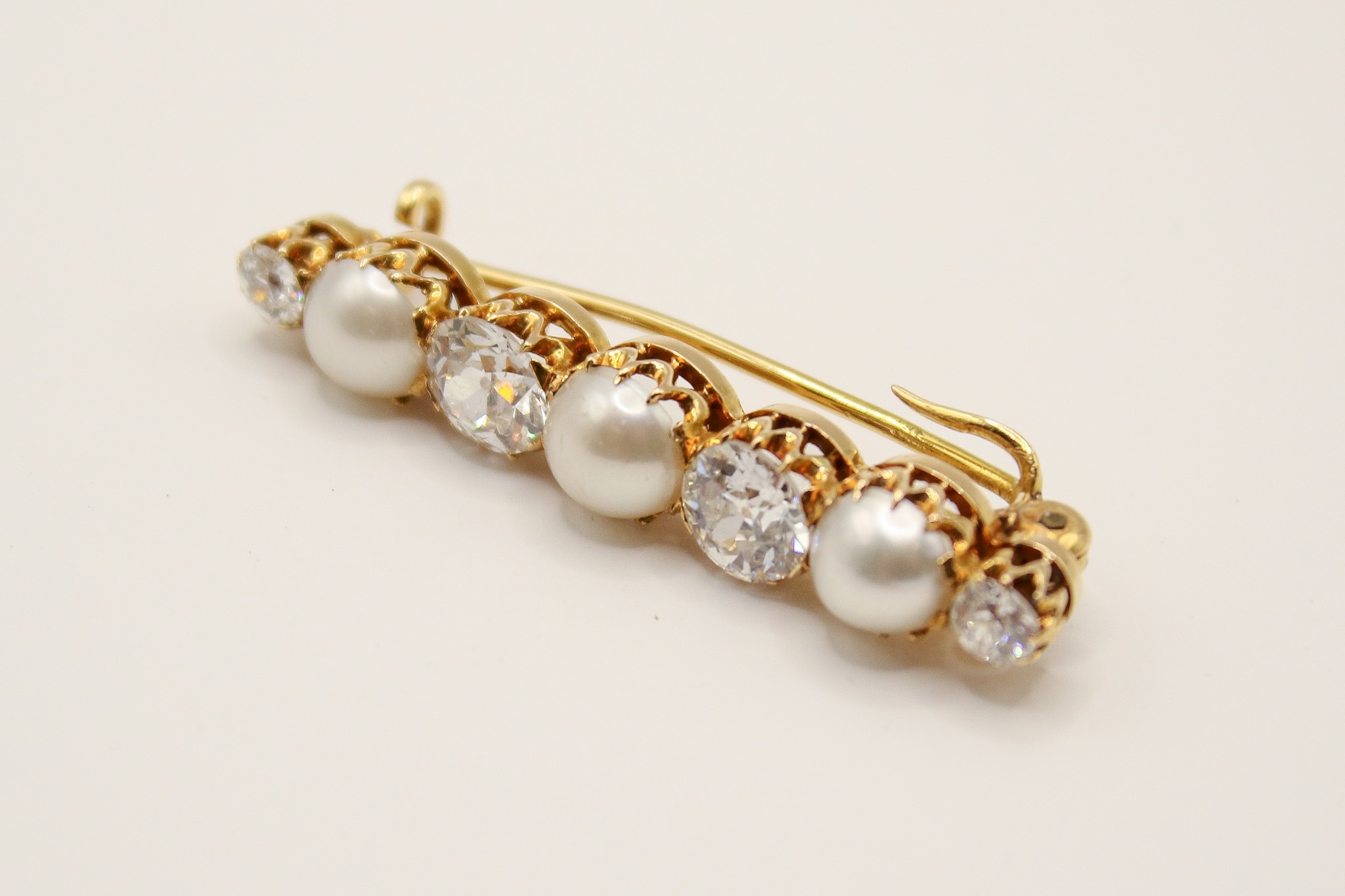 An antique diamond and half cultured pearl set bar brooch. Set with four old brilliant cut diamonds of 1.90 carats estimated total weight, interspersed with three half cultured pearls. Unmarked, tested as 18ct gold. W3.8cm, gross weight 5.4g.