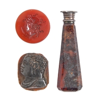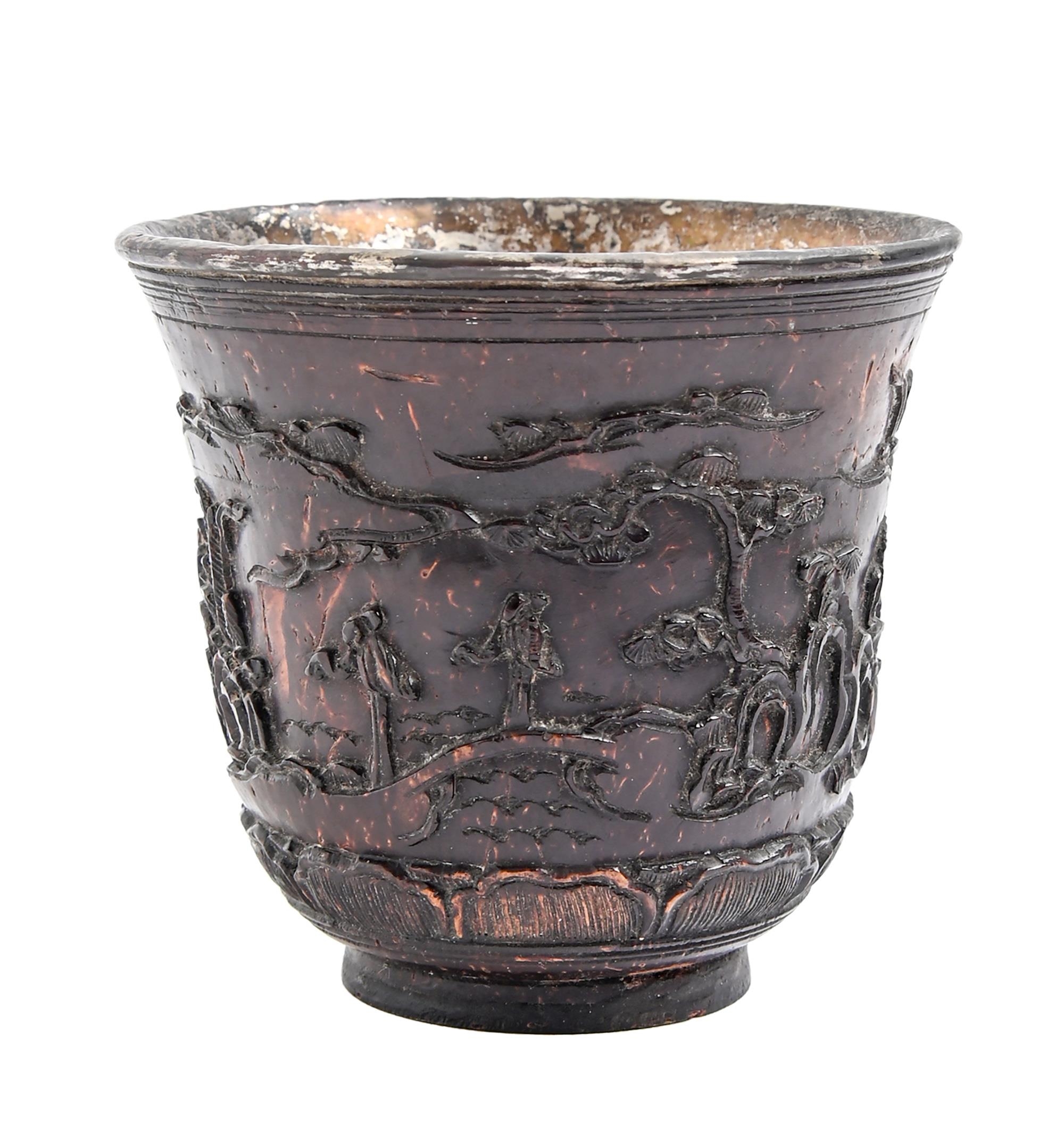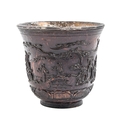 A Chinese carved horn beaker, 19th c, of bell shape with silver coloured metal liner, 78mm h