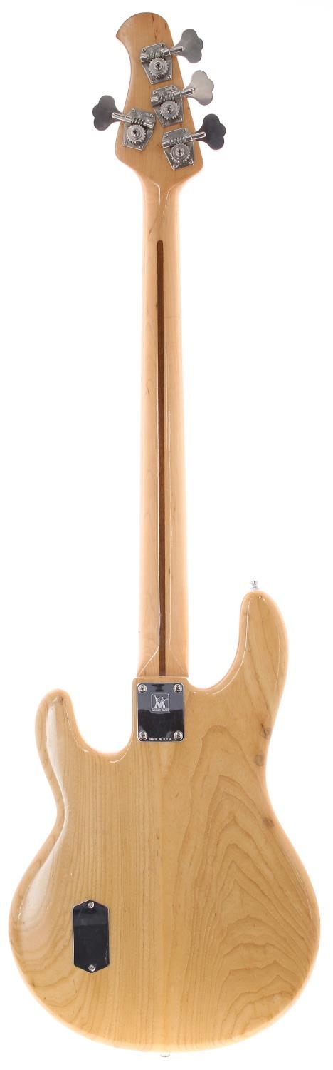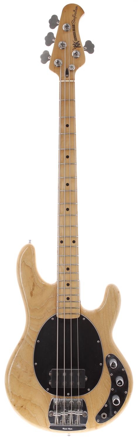 1981 Music Man Stringray bass guitar, made in USA; Body: natural ash, surface buckle marks to back, various blemishes - some with drop-fill finish; Neck: maple; Fretboard: maple; Frets: mild wear; Electrics: working, two replacement potentiometers; Hardware: generally good, some minor tarnishing to metal parts; Case: Mono gig bag; Weight: 4.34kg; Overall condition: fair