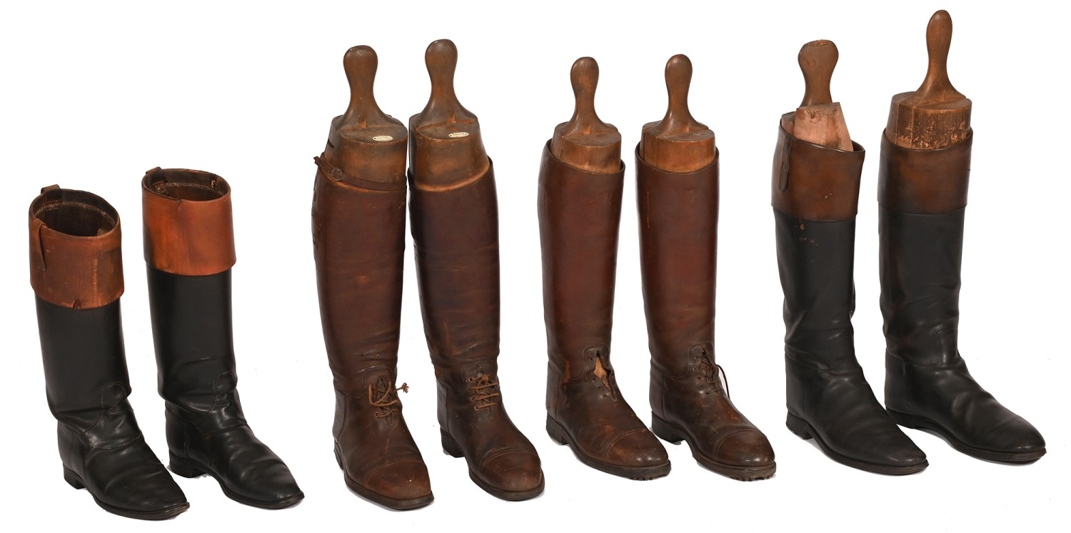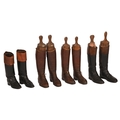 Four pairs of brown and black leather gentleman's riding boots and a box of boot and shoe trees