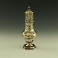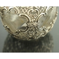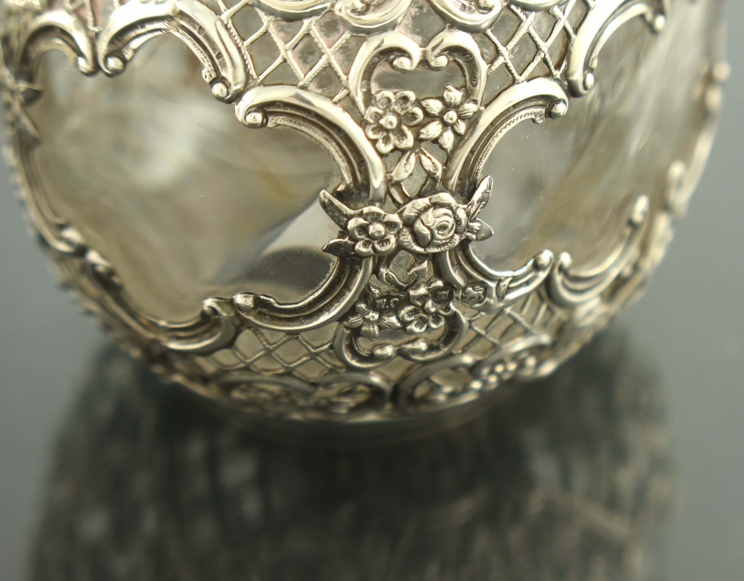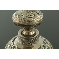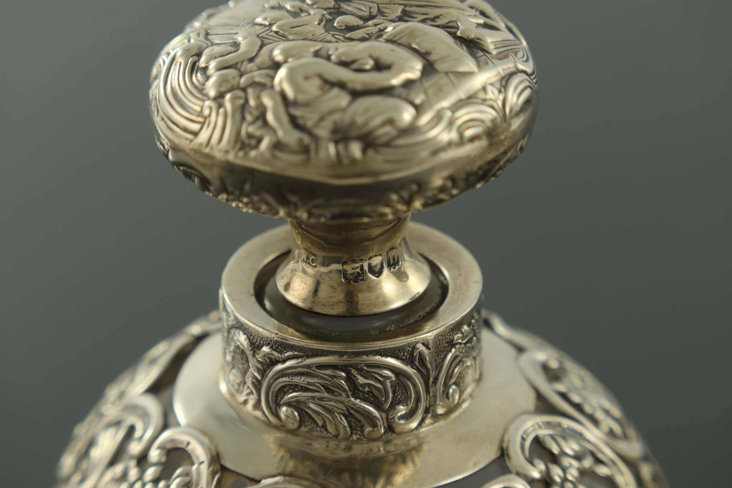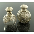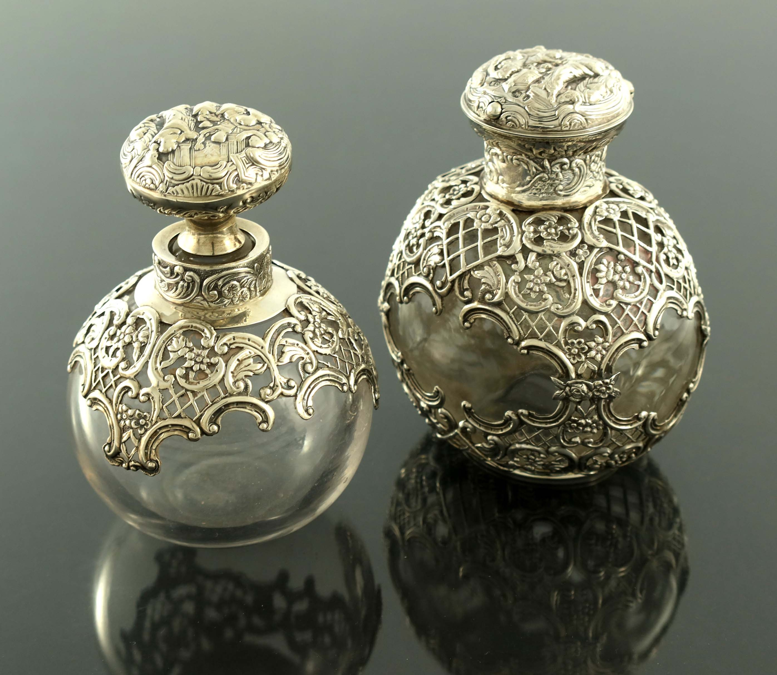 A matched pair of Victorian silver mounted glass dressing table bottles, William Comyns and Sons, London 1894 and 1897, the plain and optic ovoid bodies with reticulated trellis and embossed C scroll cage and collars, the stopper and lid embossed in relief with the same Biblical or allegorical scene, 13cm high (2)
