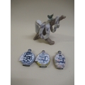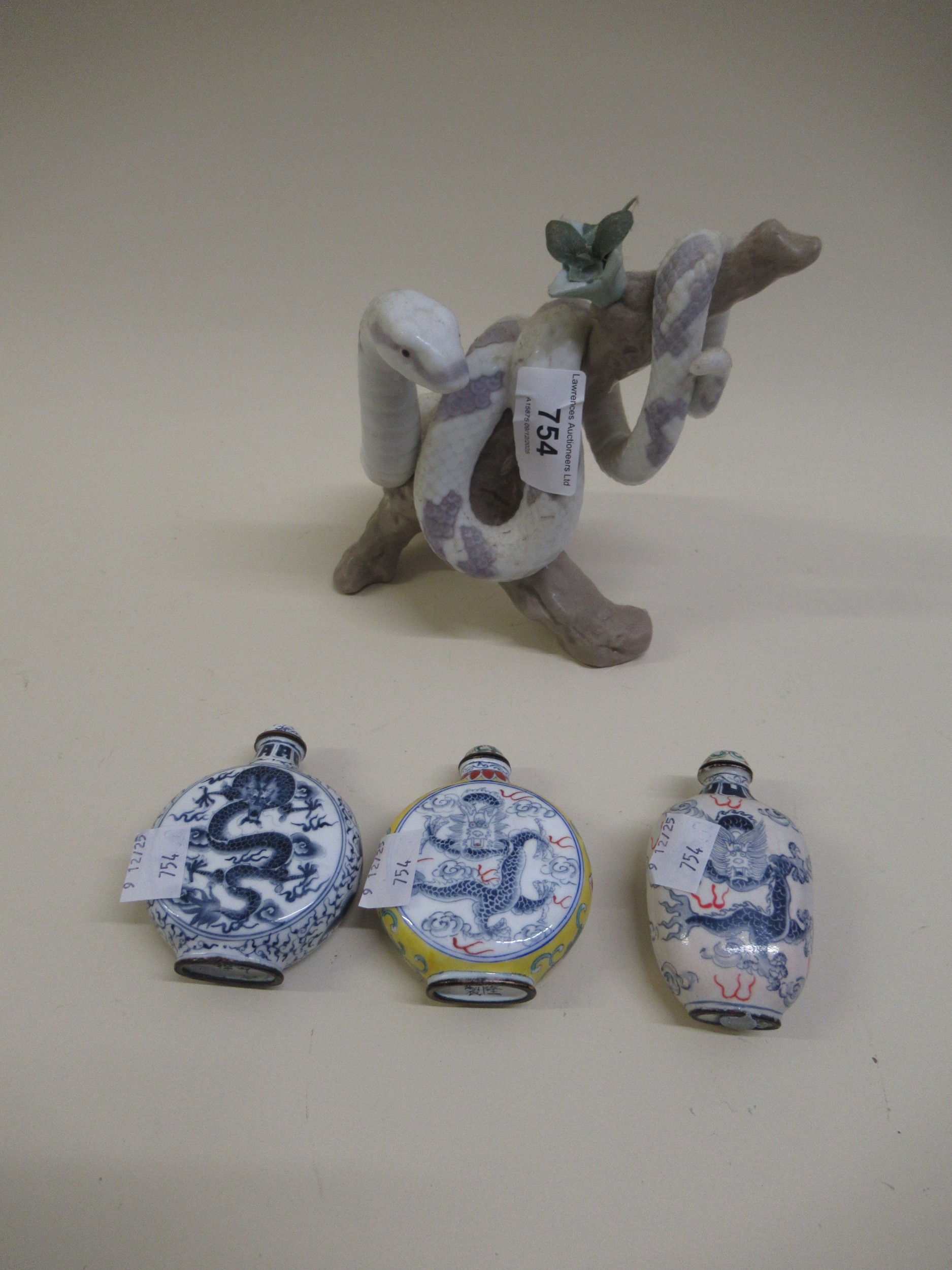 Lladro zodiac collection figure of a snake, 15cm high (at fault), together with a group of three modern oriental enamel snuff bottles