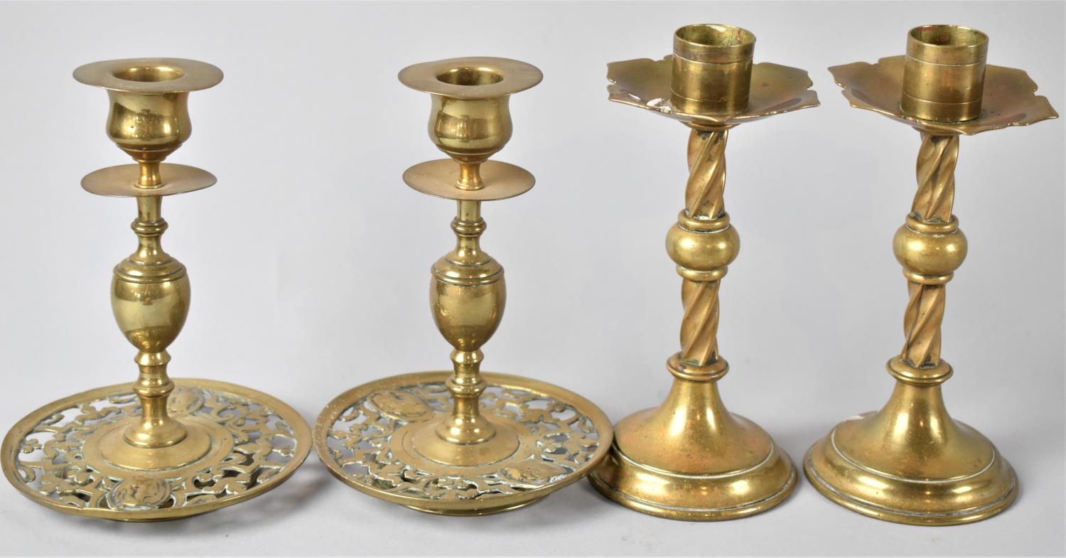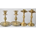 Two Pairs of Arts and Crafts Style Brass Candlesticks, The Tallest 15cm high
