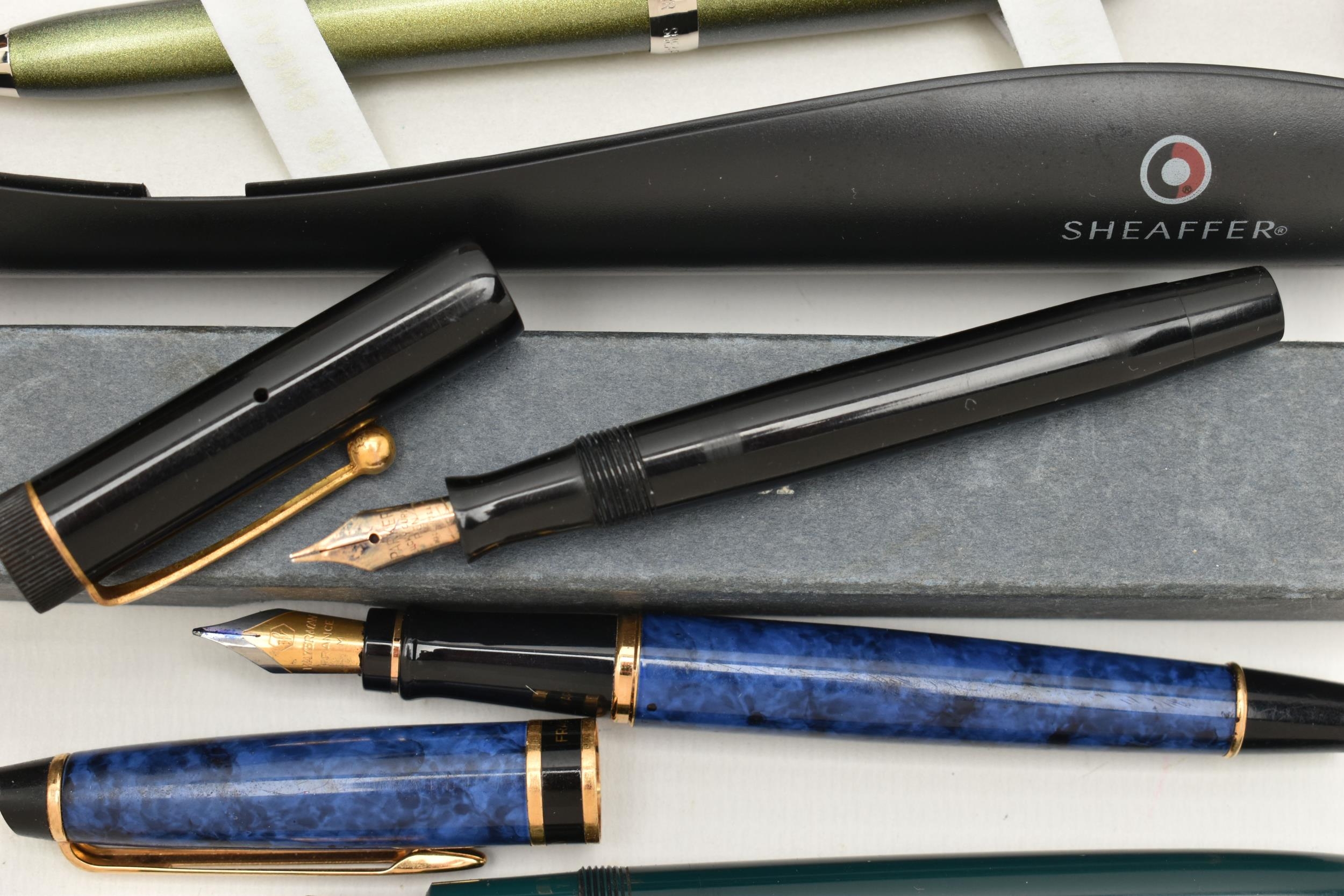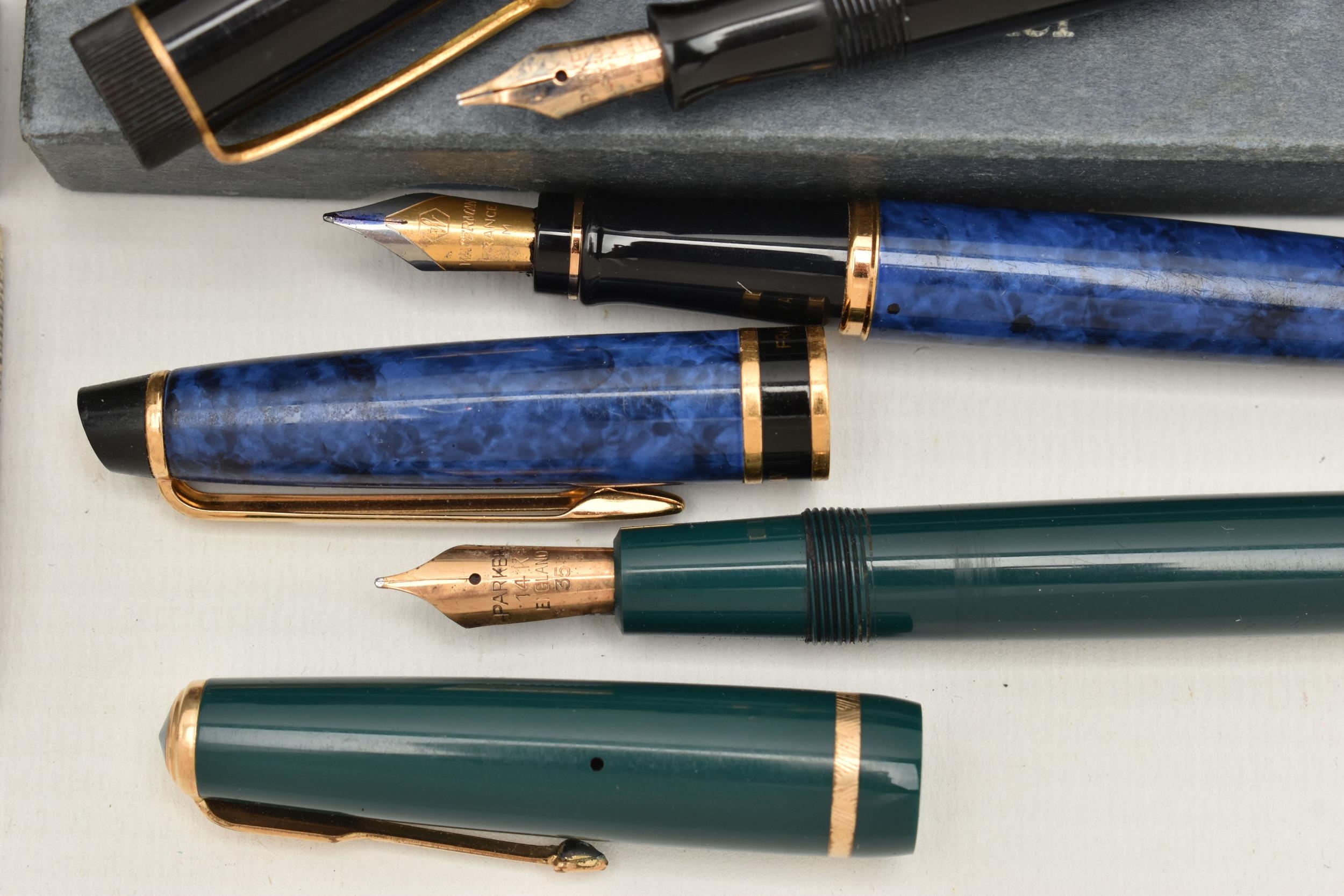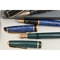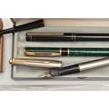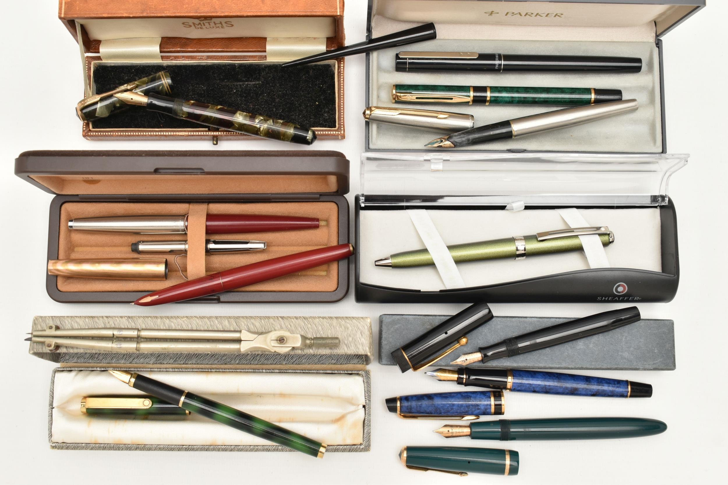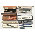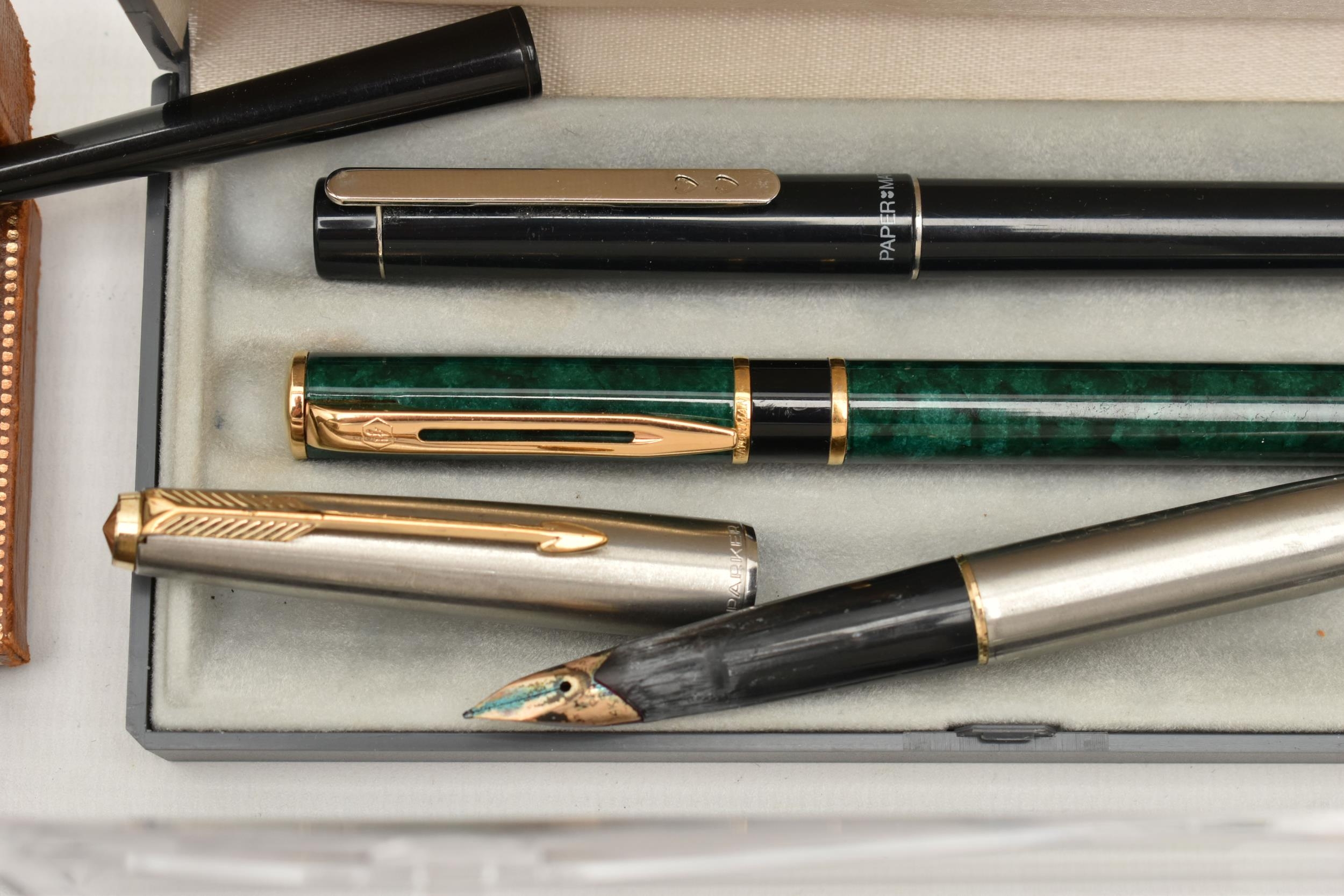 A BOX OF PENS, to include a boxed 'Sheaffer' ball point, a green barrel 'Parker' fountain pen with 14k nib, a blue marble effect 'Waterman Paris' fountain pen, together with other boxed 'Parker' fountain and ball point pens and a compass (condition report: pens have not been tested for working order, some used conditions, general light wear)