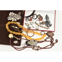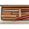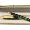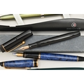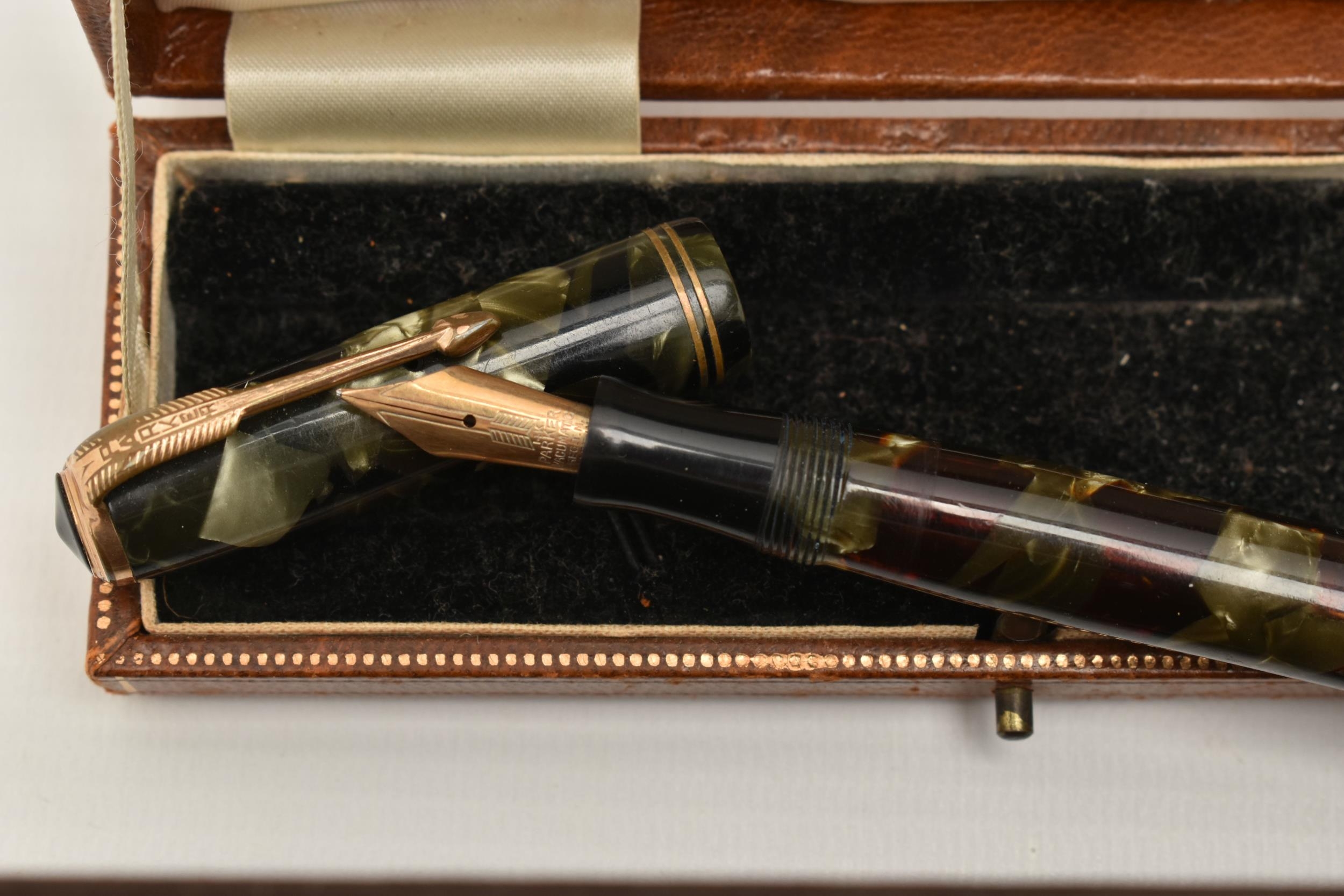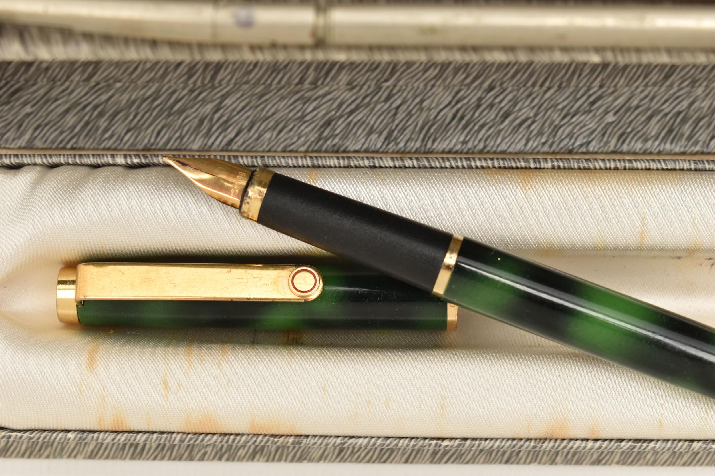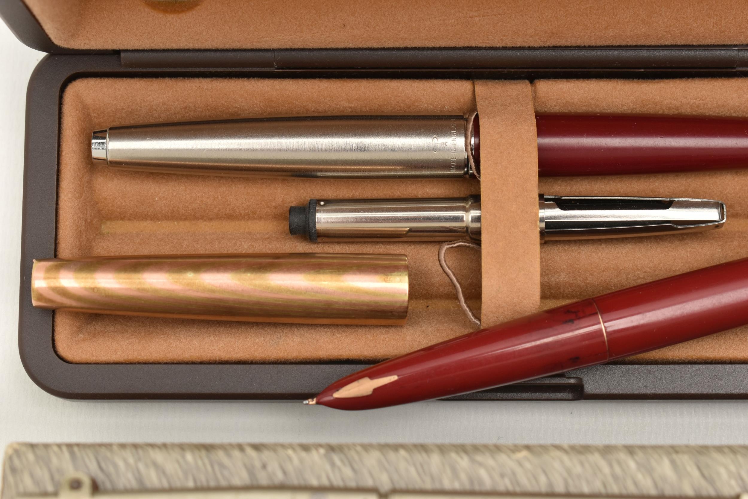 A BOX OF PENS, to include a boxed 'Sheaffer' ball point, a green barrel 'Parker' fountain pen with 14k nib, a blue marble effect 'Waterman Paris' fountain pen, together with other boxed 'Parker' fountain and ball point pens and a compass (condition report: pens have not been tested for working order, some used conditions, general light wear)