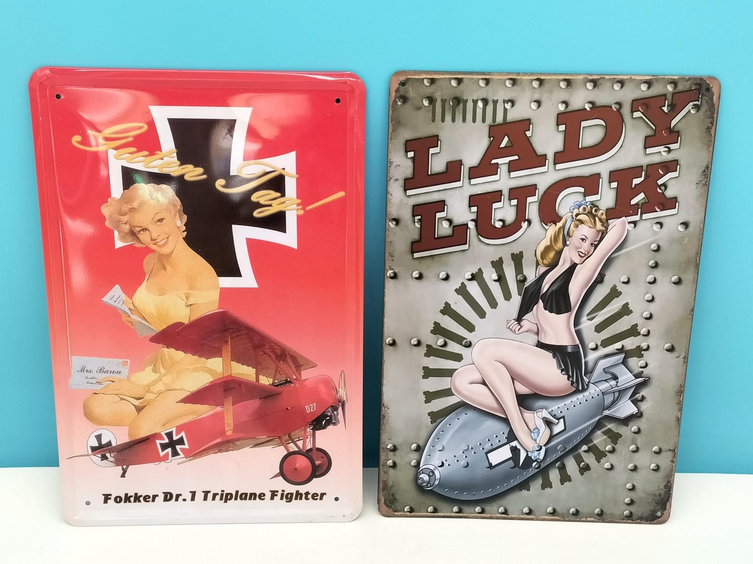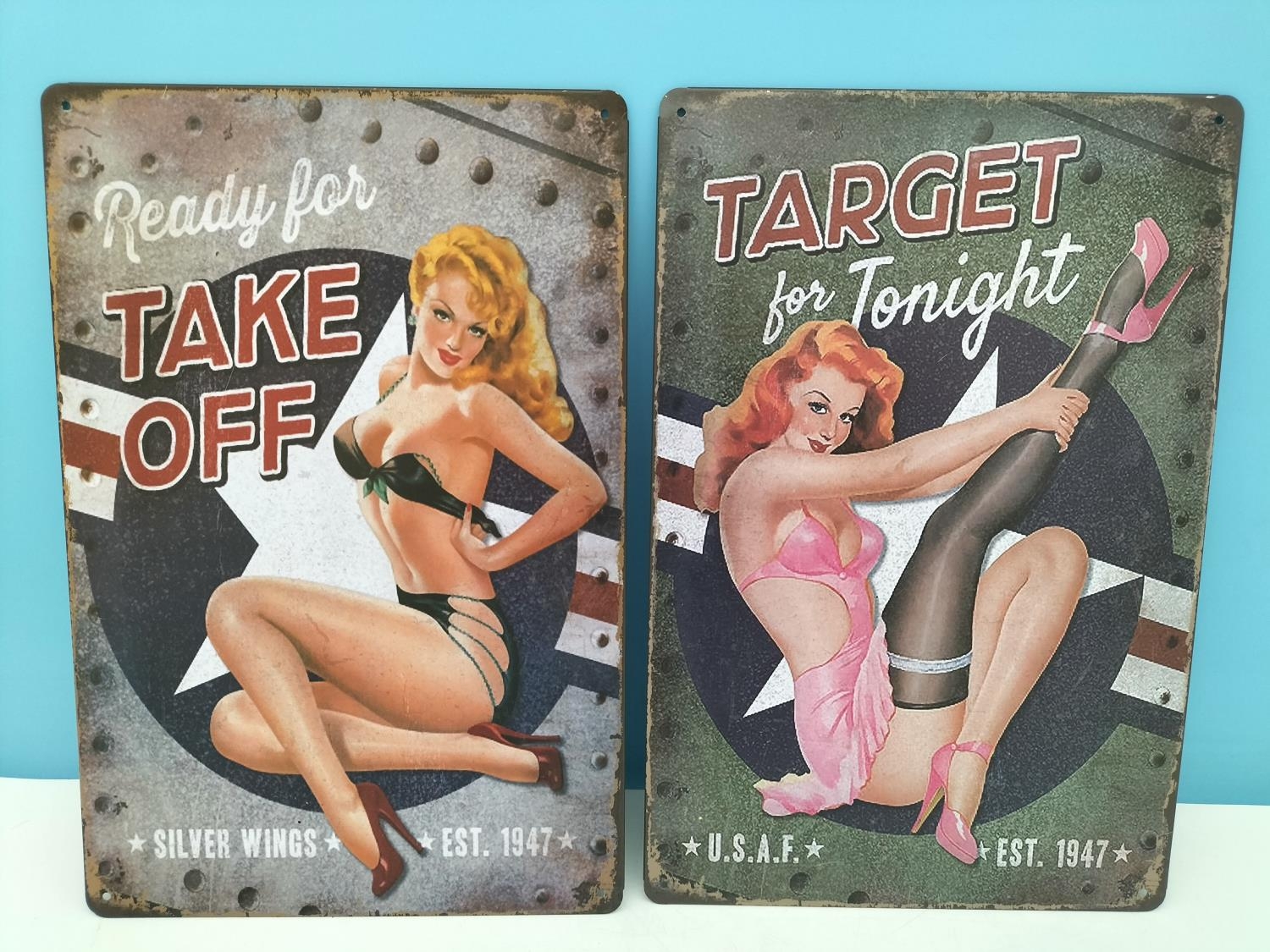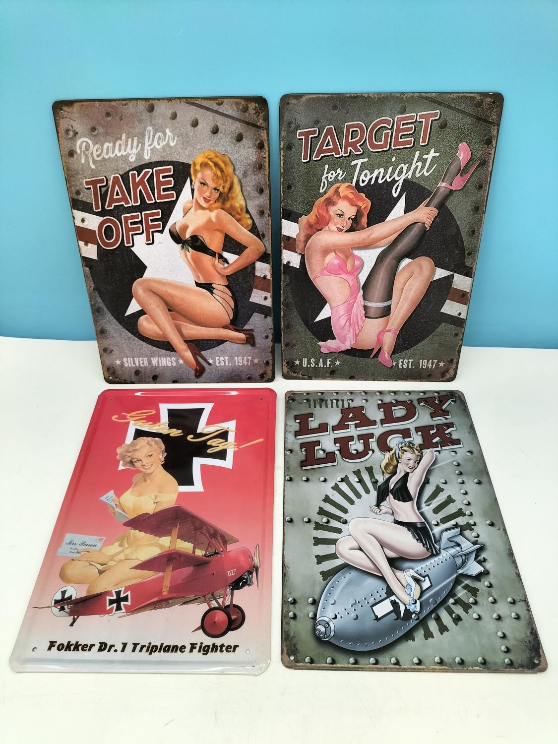 War Time Plane Pin Up Design Tin Signs (4). 30cm x 20cm.