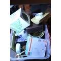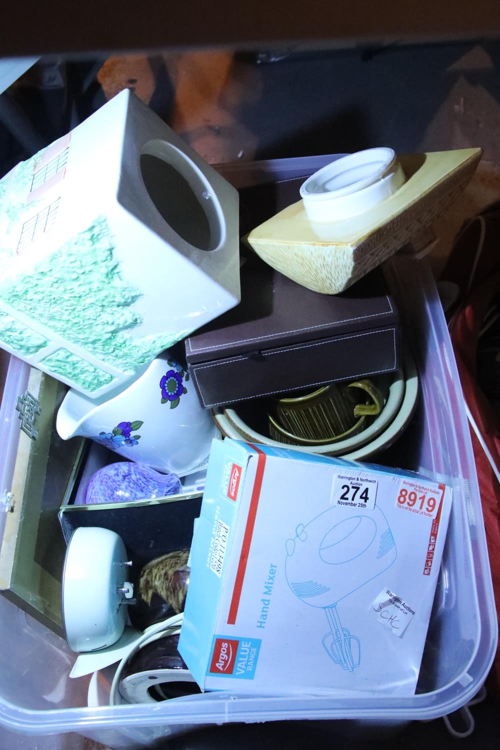 Box of mixed ceramics and a hand blender, hairdryer etc. Not available for in-house P&P