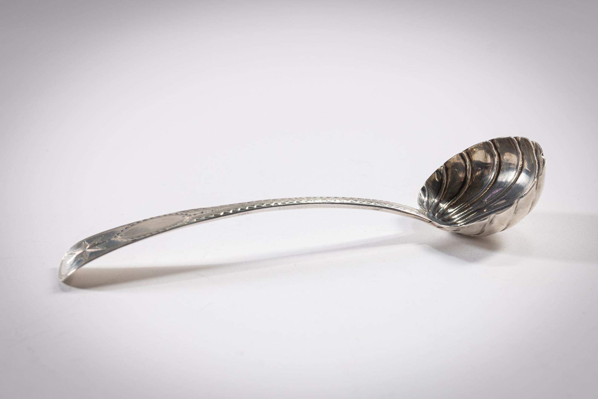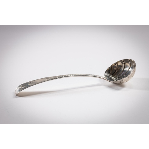 AN IRISH SILVER BRIGHT CUT SAUCE LADLE by Phineas Garde of Cork - Dublin Hallmarks 1818, 20cm (l). 1.89 ozt.