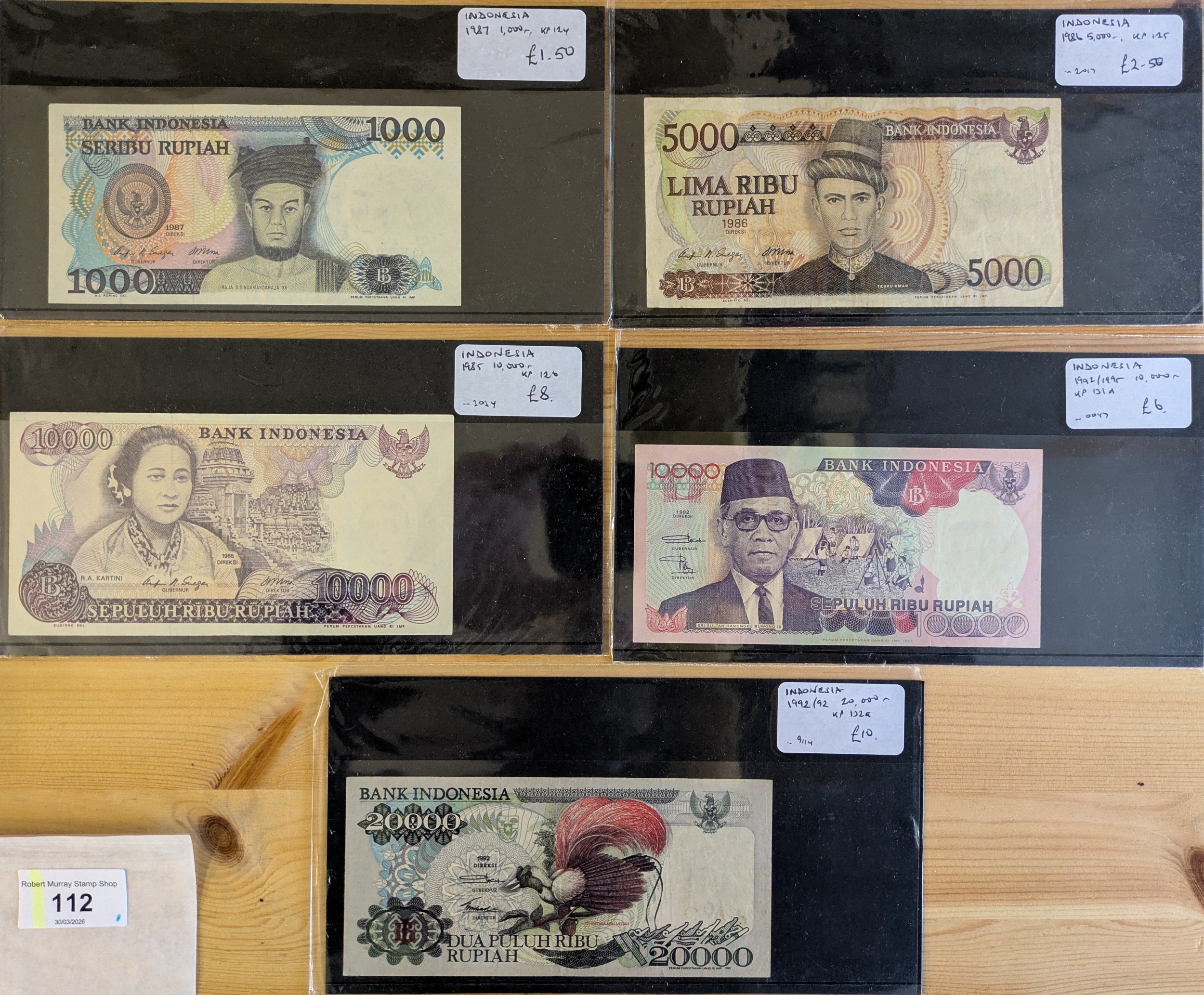 BanknotesIndonesia; 1985-95 seln. of five different notes, retail £28.