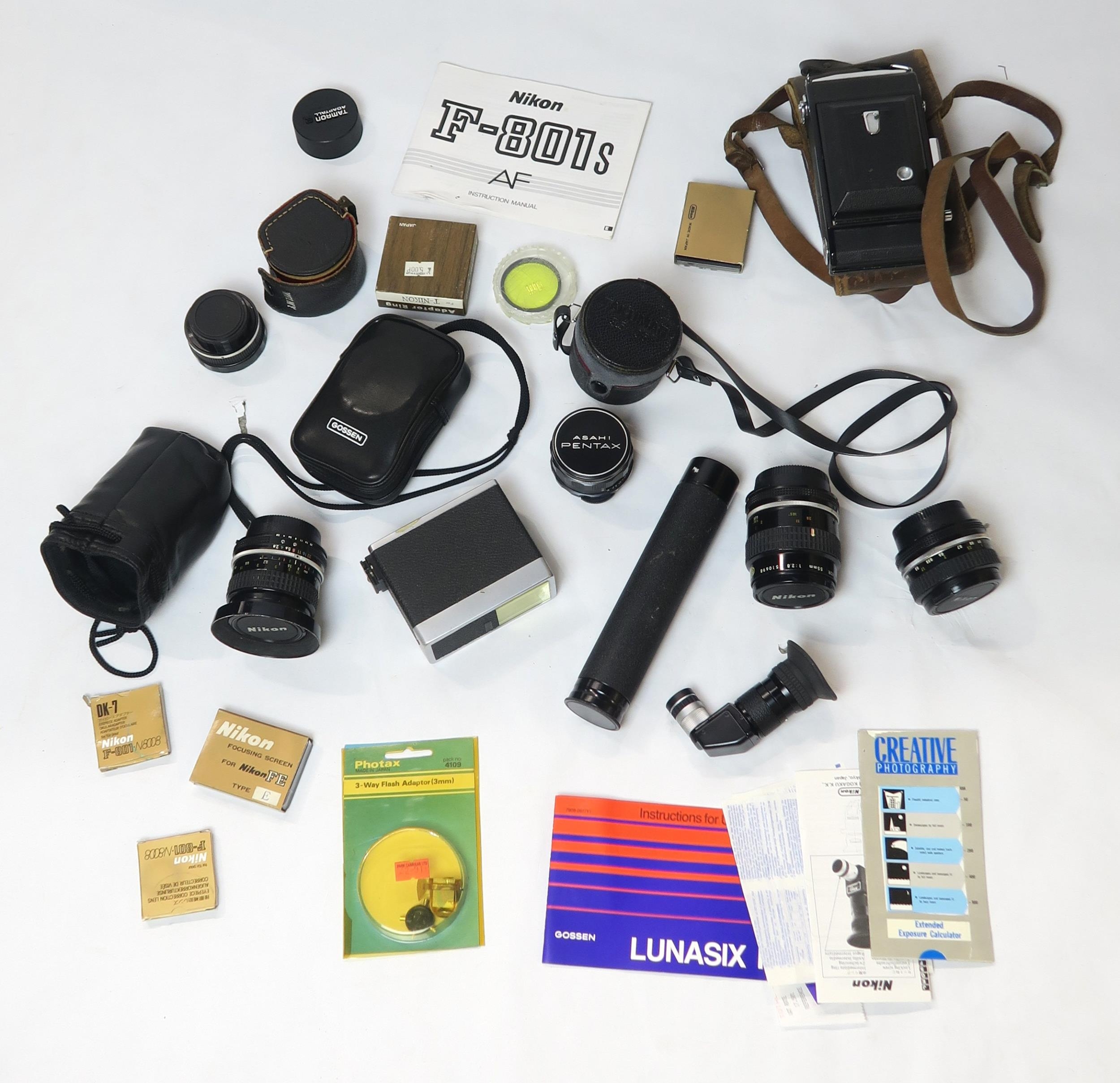 A large selection of photographic and projecting equipment, to include Nikon F-801S camera with a variety of lenses (Nikkor 85mm 1:2, AF Nikkor 35-70mm 1:3.3-4.5, Nikon Teleconverter TC-300 2x, Nikon Zoom 75-150mm 1:3.5, Nikkor ED 300mm 1:4.5, Nikkor 24mm 1:2.8 and others), other cameras by Nikon and Pentax, a Rollei P350 autofocus projector, Leica slide projector, heavy duty projector screen with tripod and a variety of related accessories