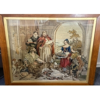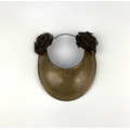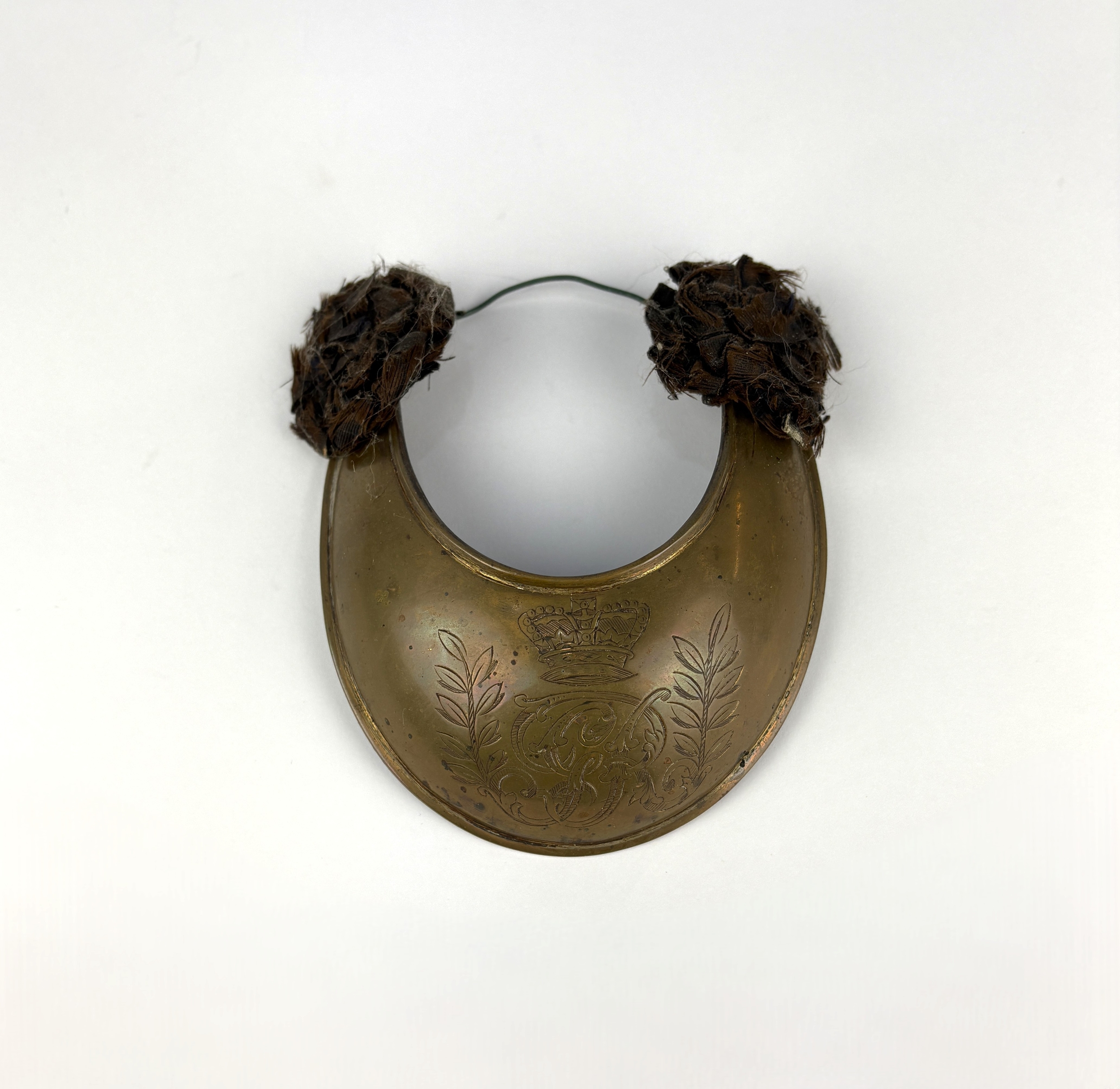 A George III Officer's Universal Pattern gorget, of gilt brass engraved to the front with crowned 'GR' cypher, with a pair of mounted brown silk rosettes, wide 10cm
