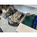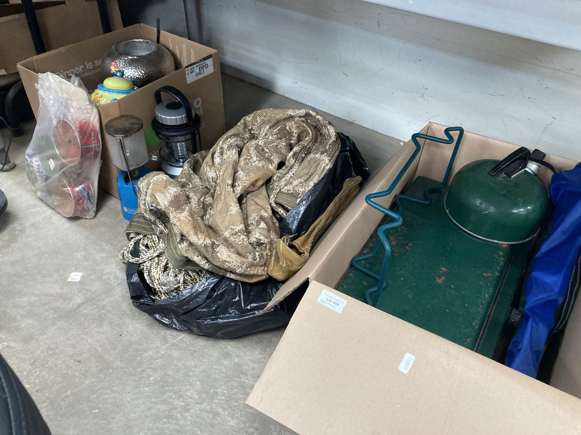 Camping gear including gas stove, chairs, lanterns, outdoor torches, play parachute etc