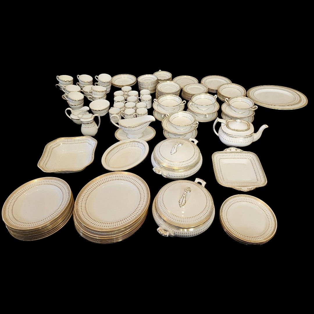 Having a gold line ‘arrowhead’ border comprising eleven large dinner plates, ten side plates, two twin handled soup tureens, eight soup bowls and saucers and two meat plates, twelve coffee cans and ten saucers, twelve cups and saucers and a teapot.