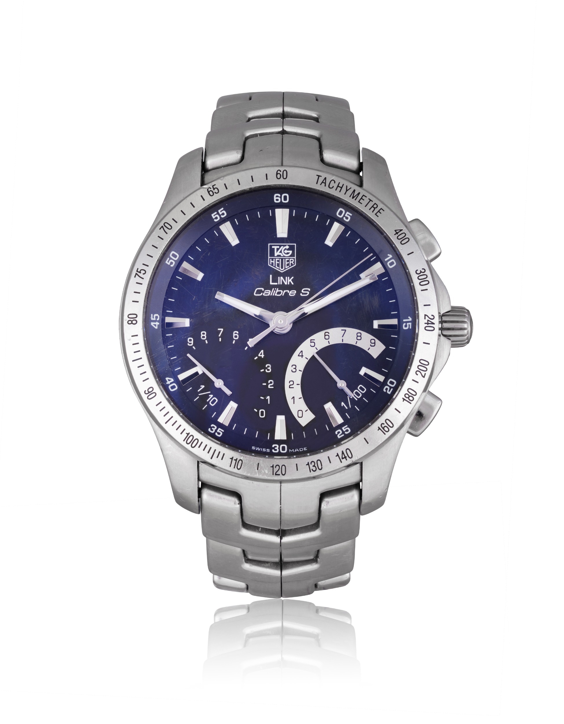 TAG HEUER LINK CALIBRE S, STAINLESS STEEL A stainless steel quartz chronograph wristwatch with hybrid mechanical display. Year: Circa 2000s Dial: Black dial with applied baton hour markers, subsidiary displays for chronograph functions, signed TAG Heuer Link Calibre S. Calibre: Quartz movement, Calibre S (electro-mechanical hybrid), 27 jewels, signed. Case: Stainless steel case with tachymeter bezel, screw-down back, sapphire crystal, water-resistant to 200 meters. Diameter: Approx. 41 mm Gross Weight: 88.17 g Bracelet/Strap: Stainless steel bracelet, approx. 170 mm. Signature: Dial, case and movement.
