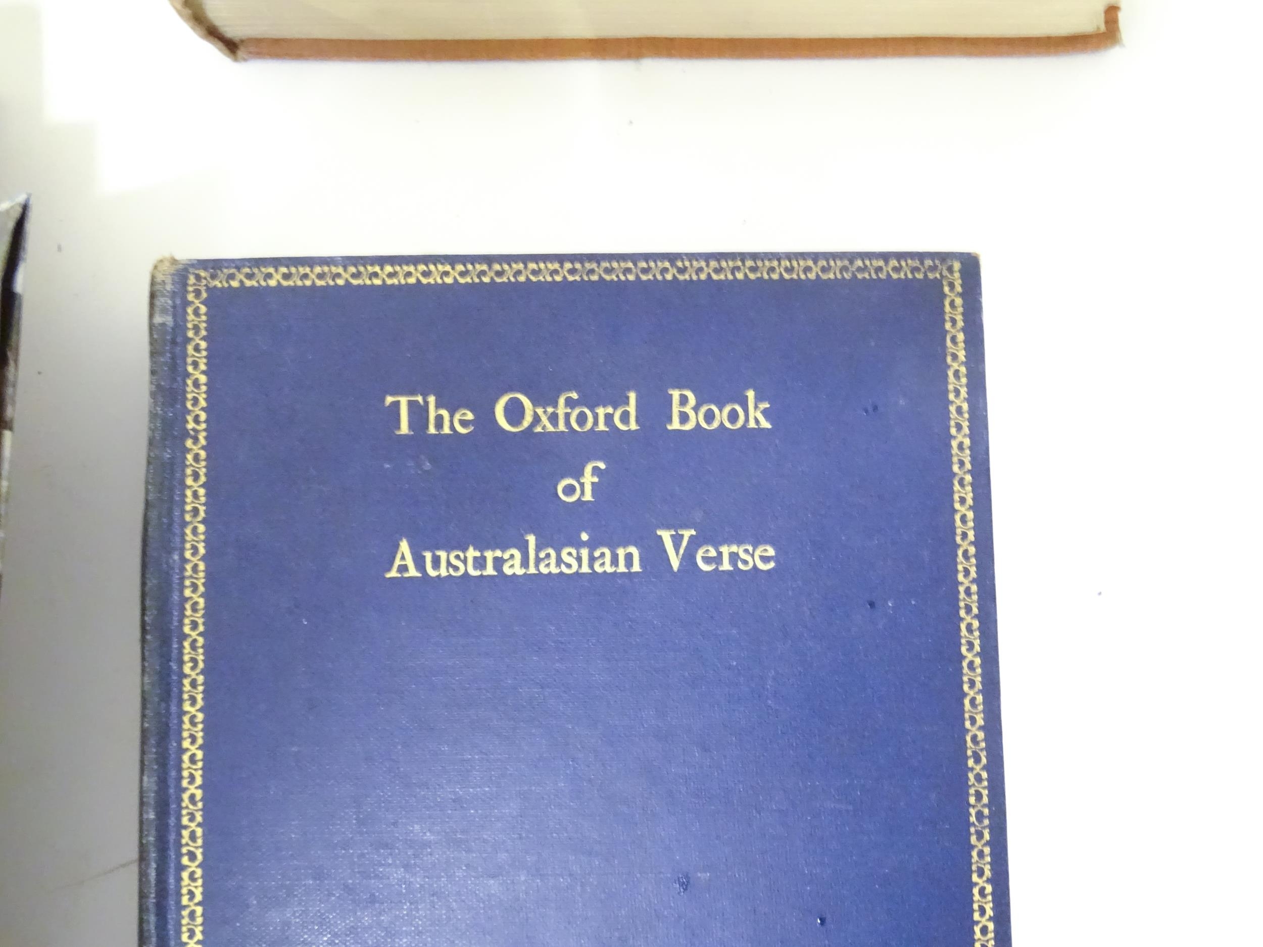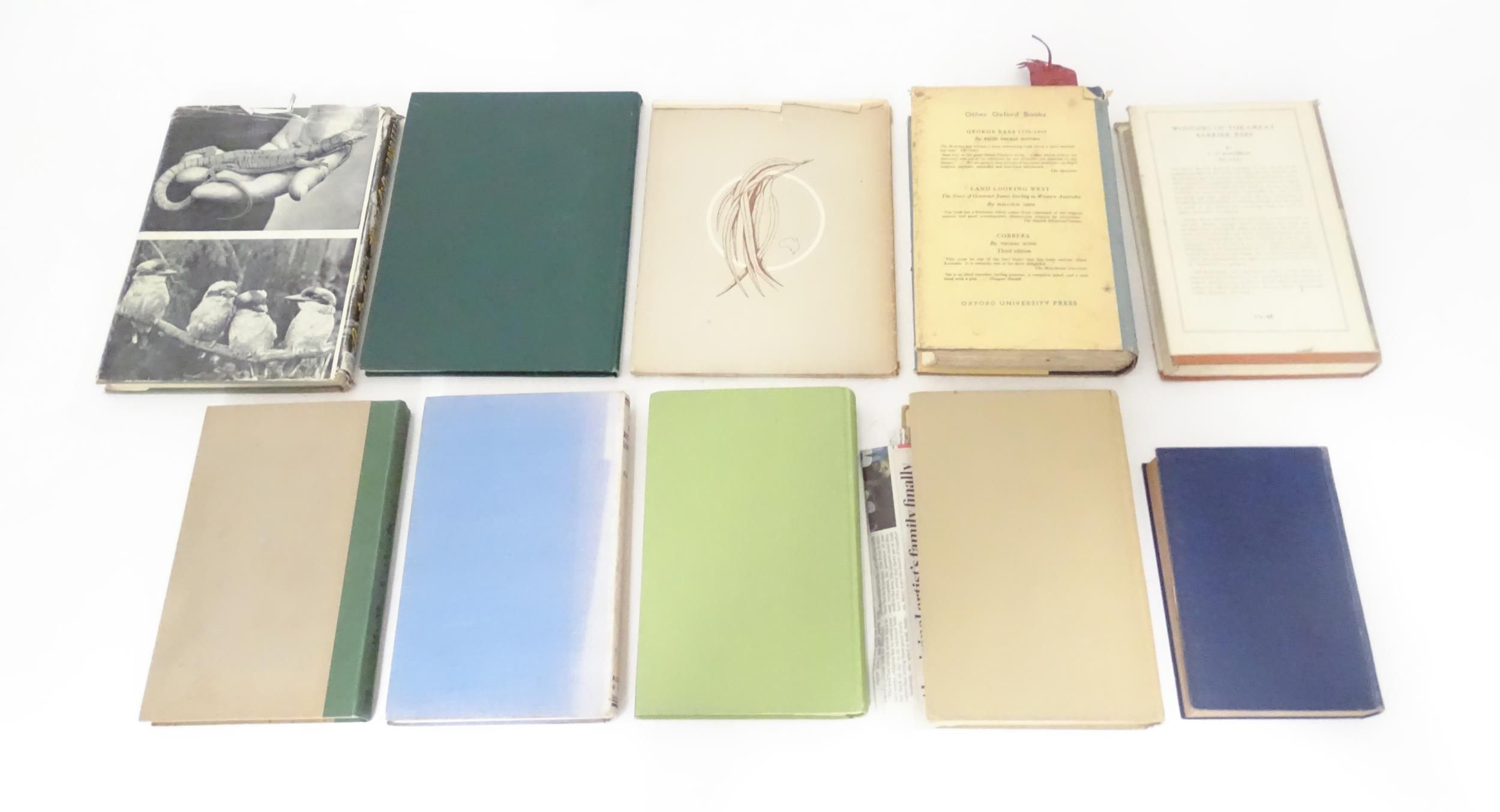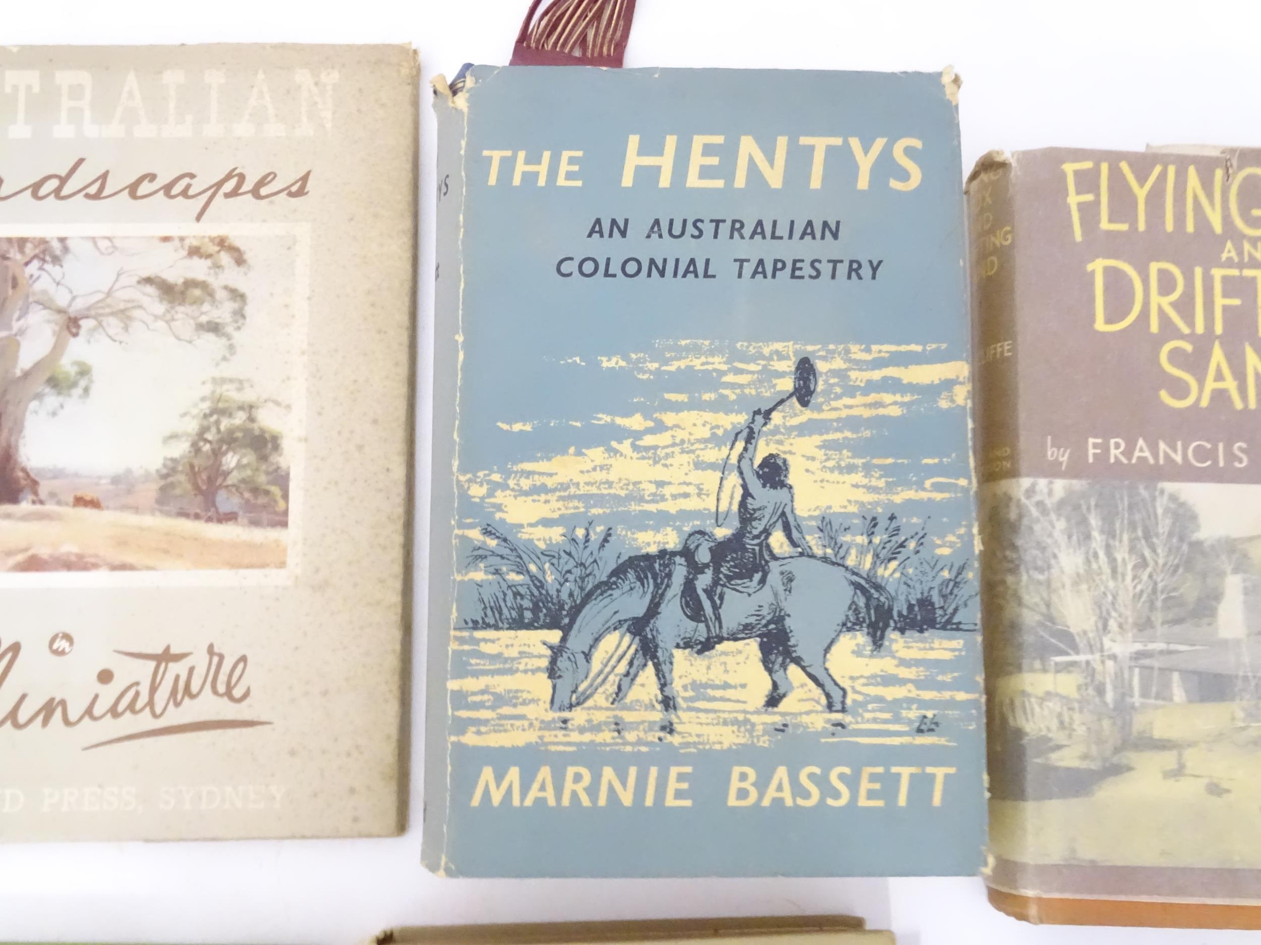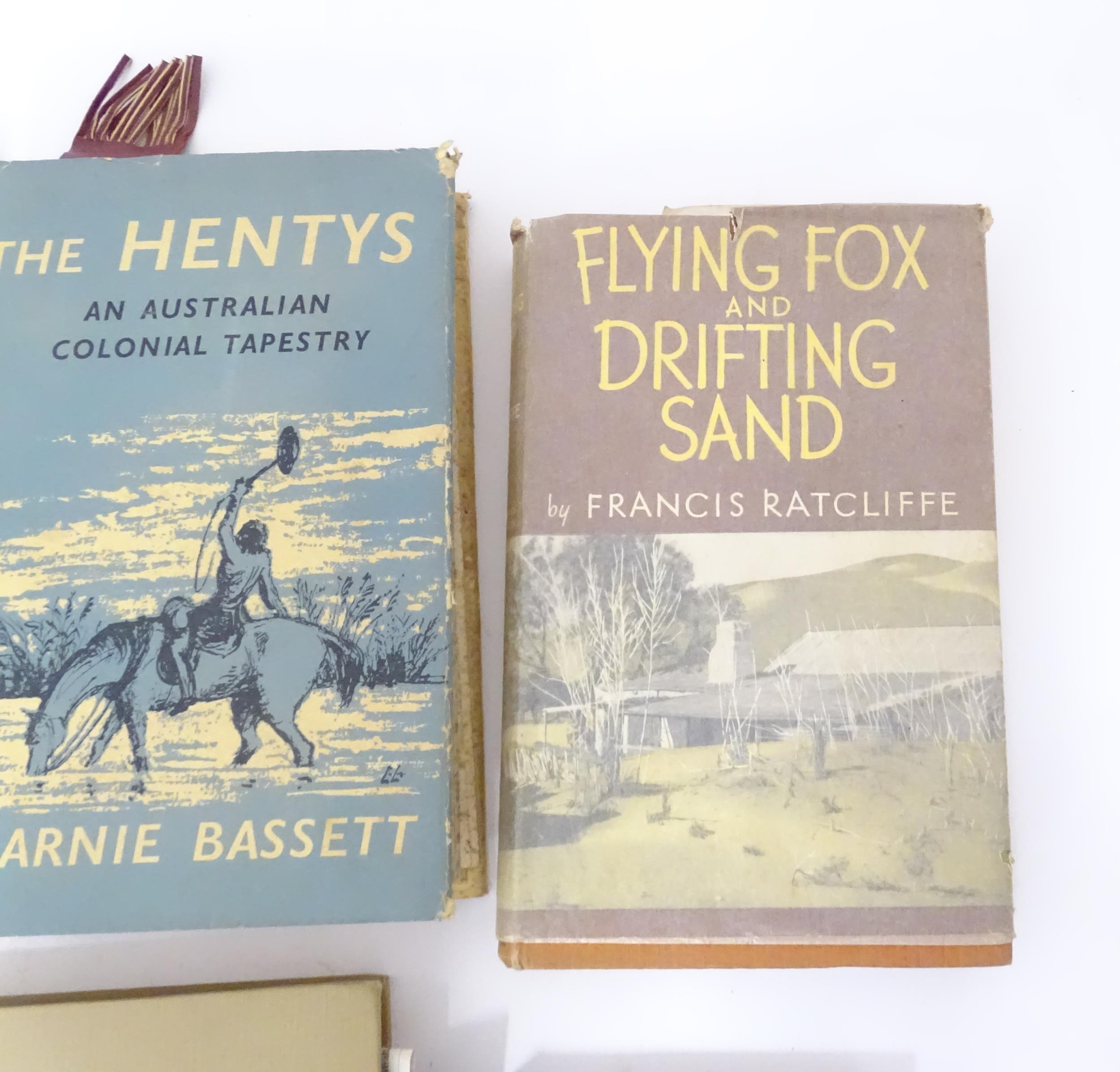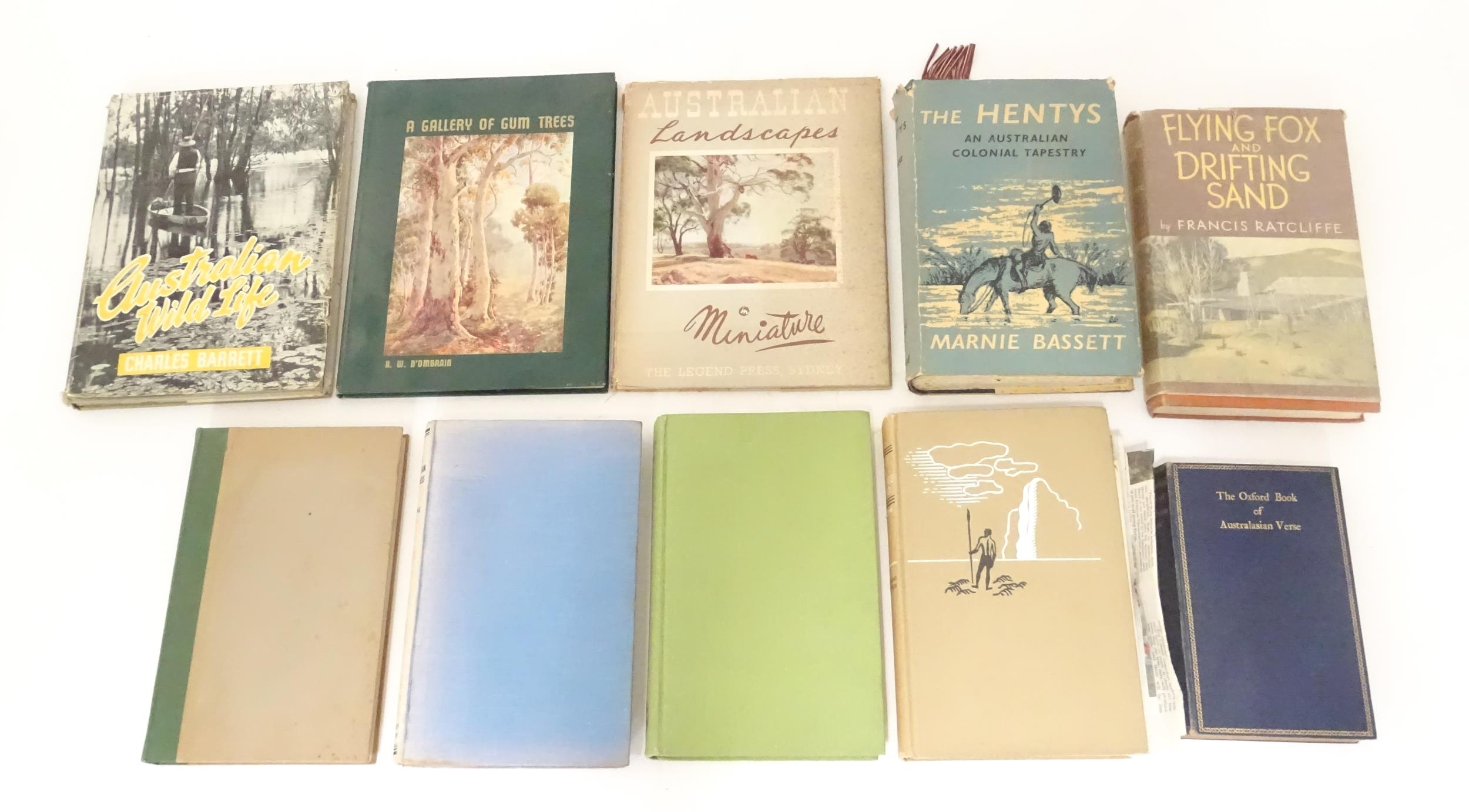Books: A quantity of assorted books on the subject of Australia to include The Hentys Am Australian Clonial Tapestry by Marnie Bassett, Australian Wild Life by Charles Barrett, A Gallery of Gum Trees by A. W. D'Ombrain, I Saw a Strange Land by Arthur Groom, Australian Writes by T. Inglis Moore, Flying Fox and Drifting Sand by Francis Ratcliffe, etc. (10)