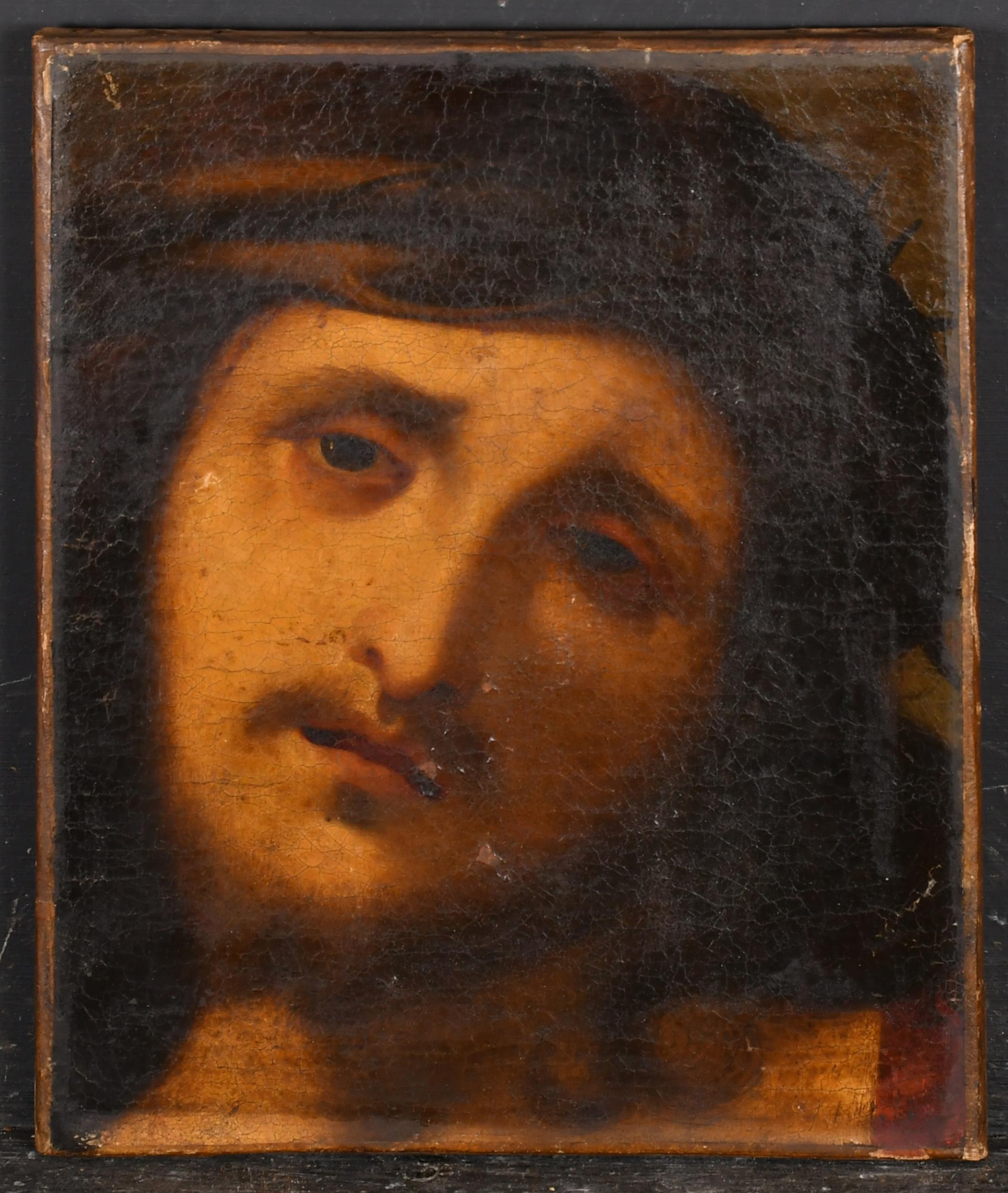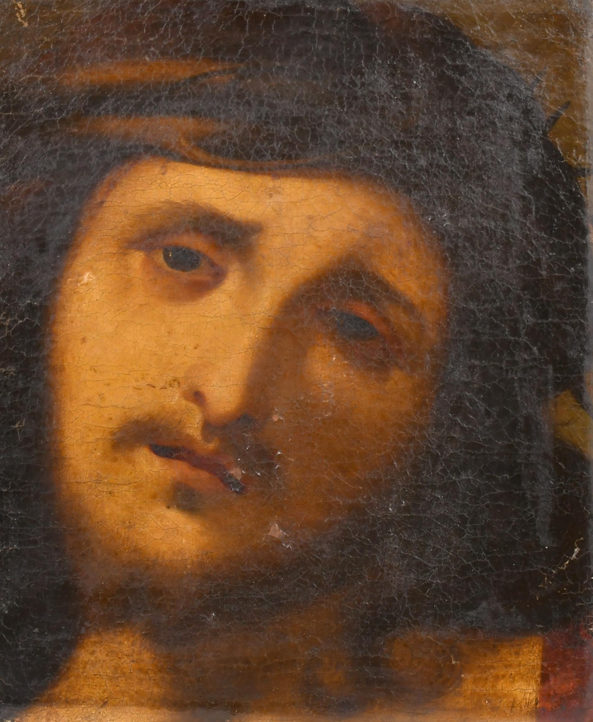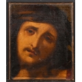 Circle of Guido Reni (1575-1642) Italian. Head of Christ, Oil on canvas (a fragment), Unframed 11.5" x 8.75" (29.2 x 22.2cm)